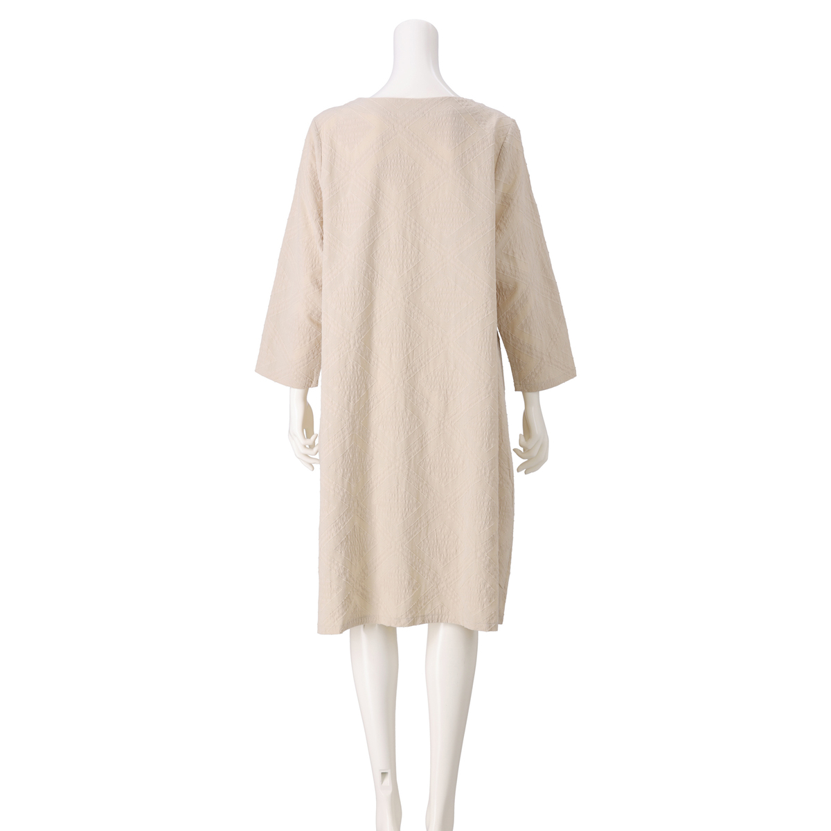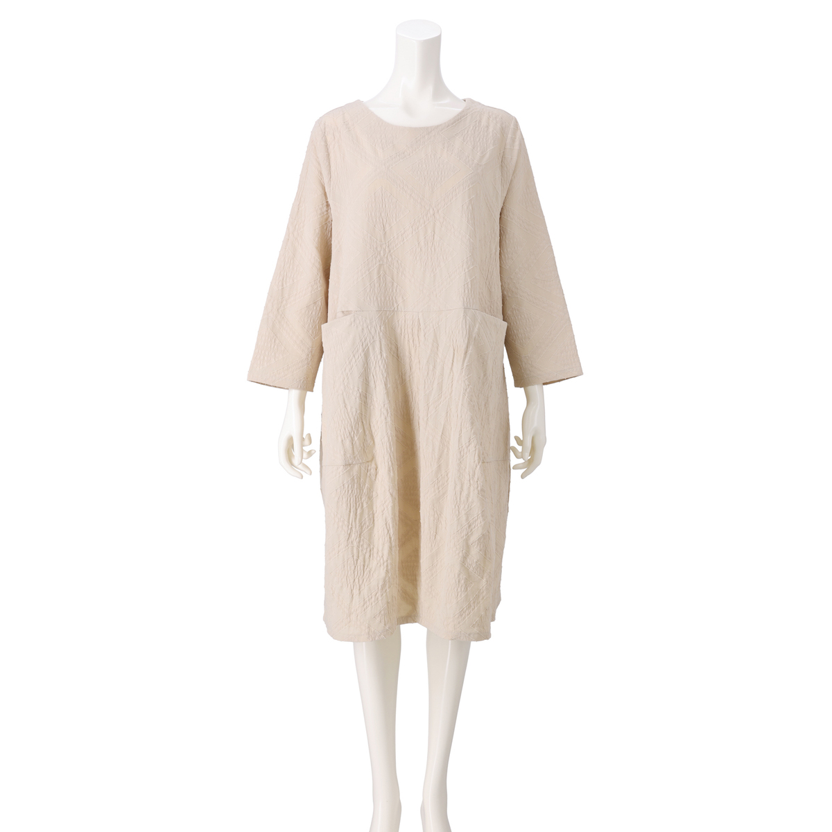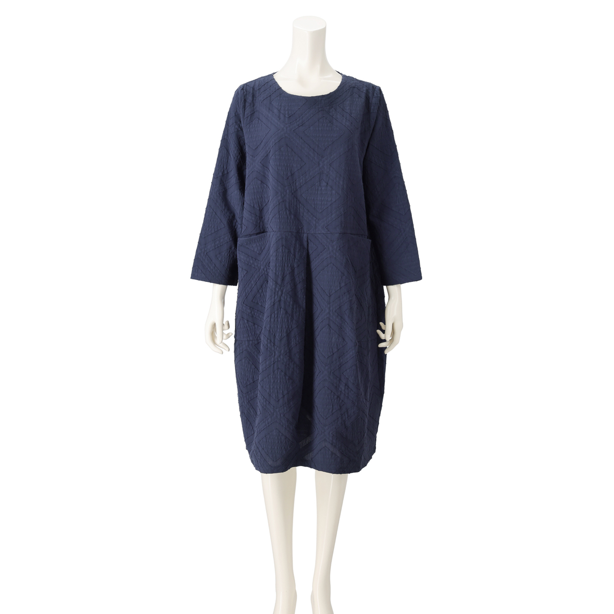 こだわりのある素材の特徴を活かしながらもシンプルに仕上げたワンピース。ラウンドネックとバルーンスタイルの体型カバーに優れたデザインです