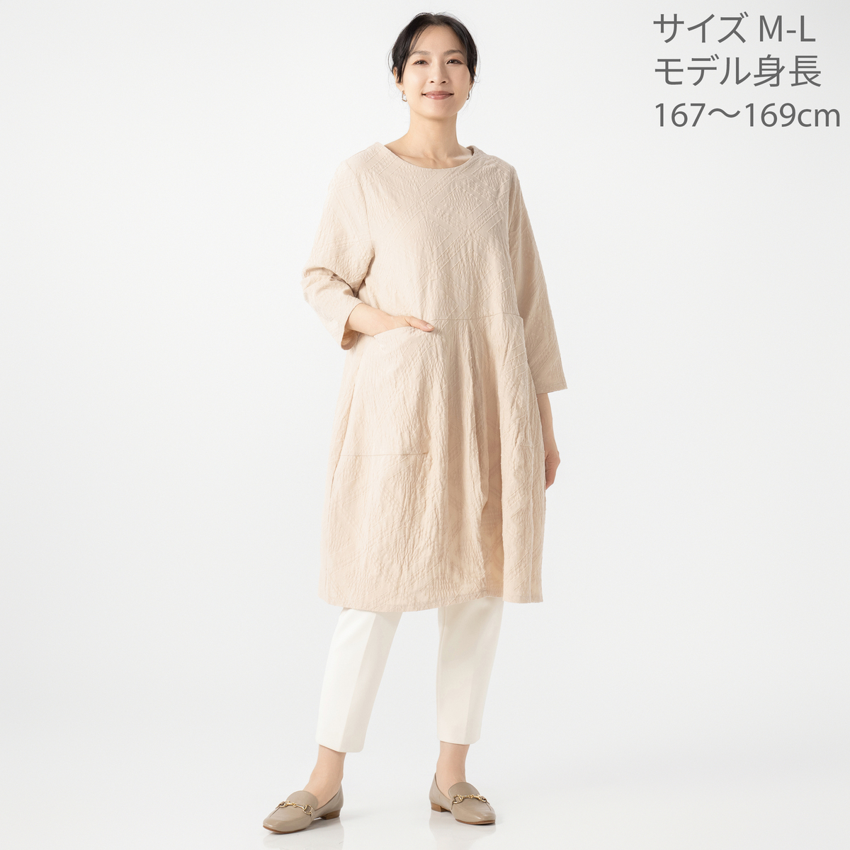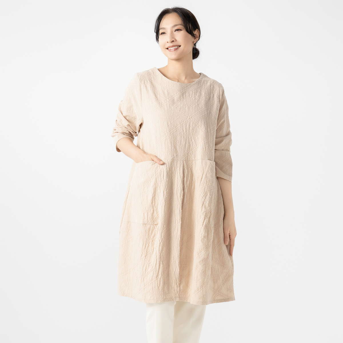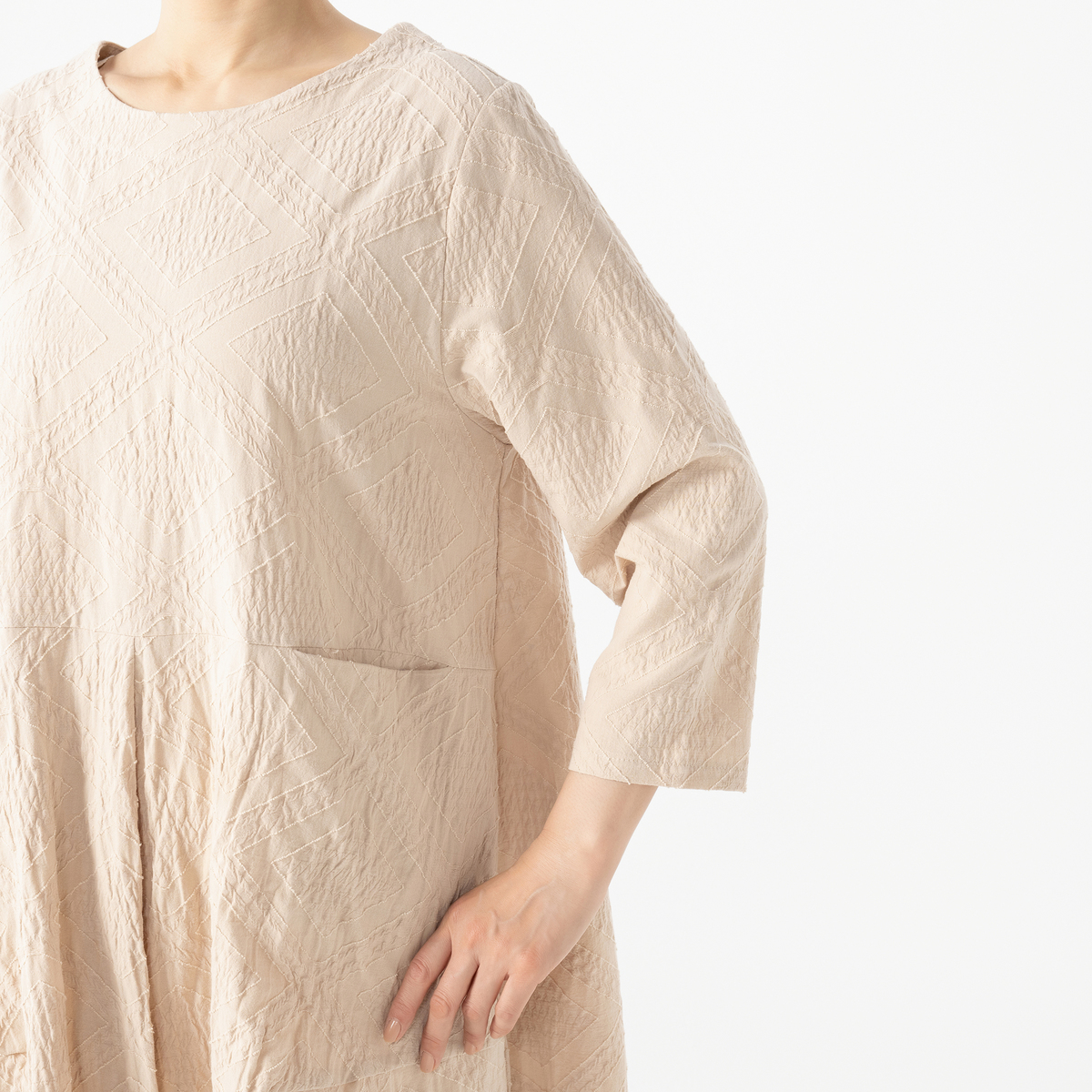 こだわりのある素材の特徴を活かしながらもシンプルに仕上げたワンピース。ラウンドネックとバルーンスタイルの体型カバーに優れたデザインです