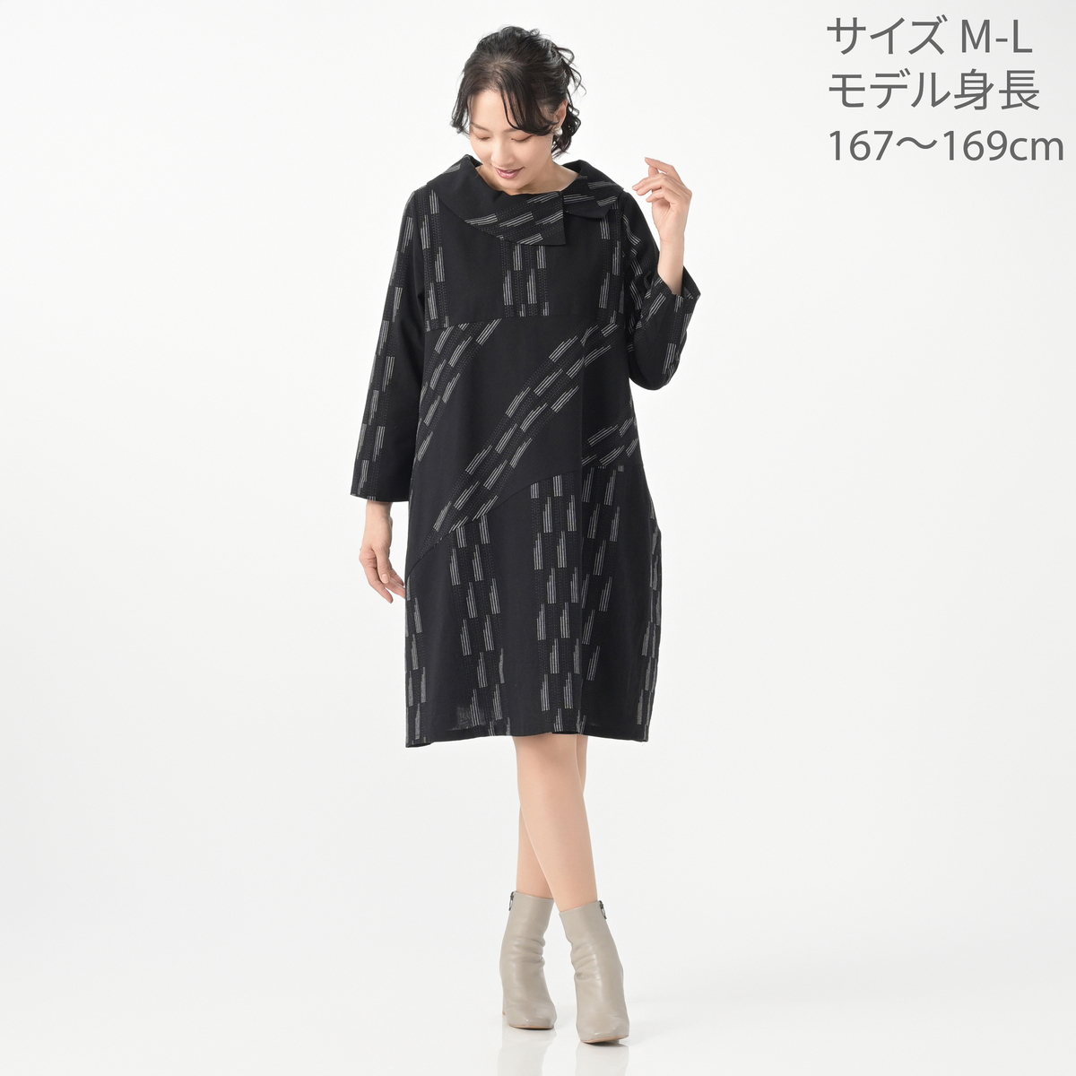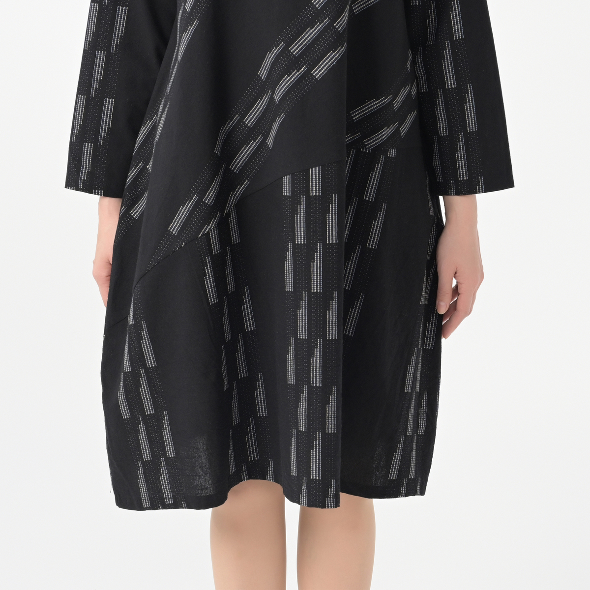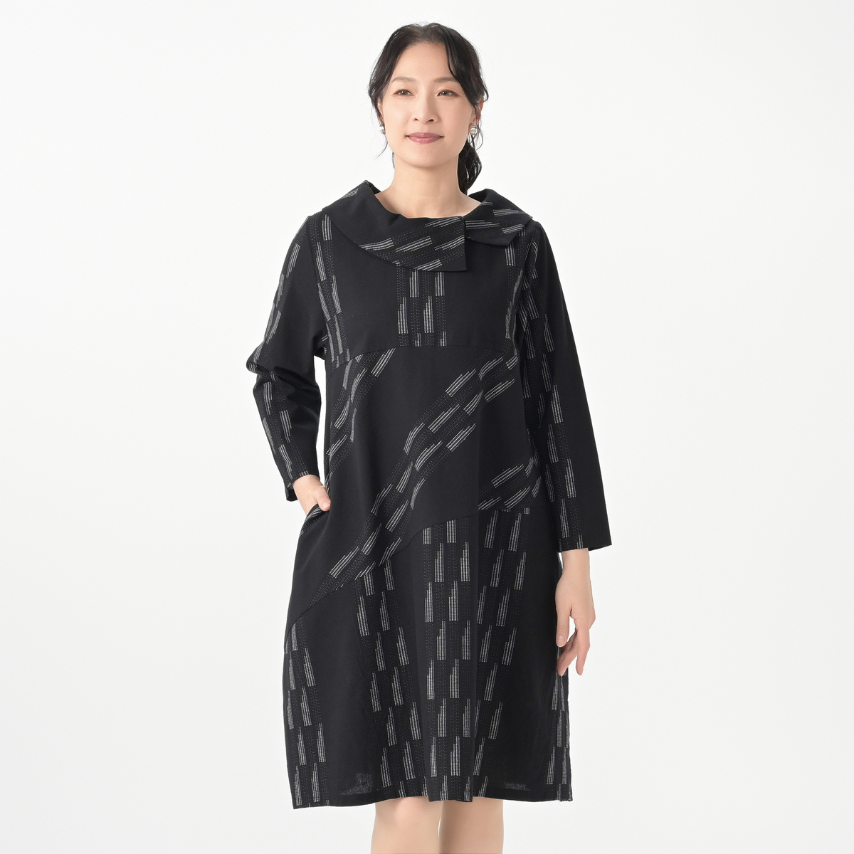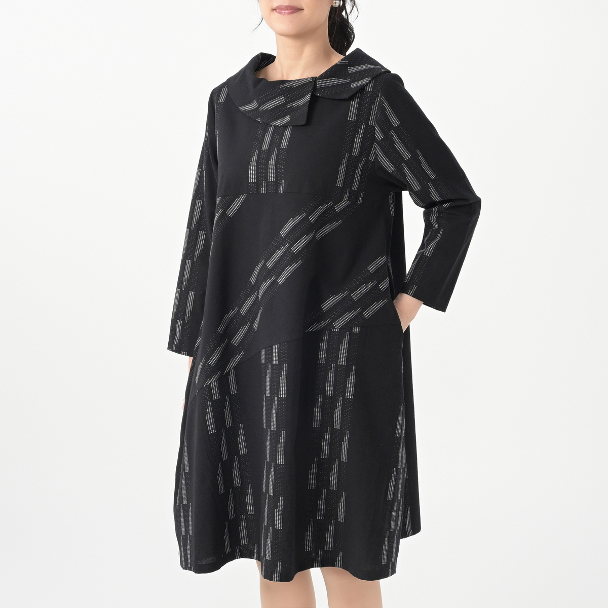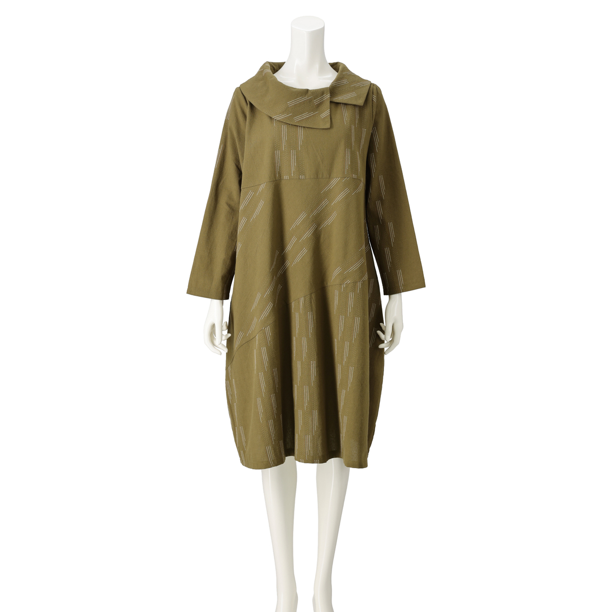 エレガントなバルーンシルエットが特徴のワンピース。生地に斜めに走ったステッチジャガードが、洗練された印象を引き立てます