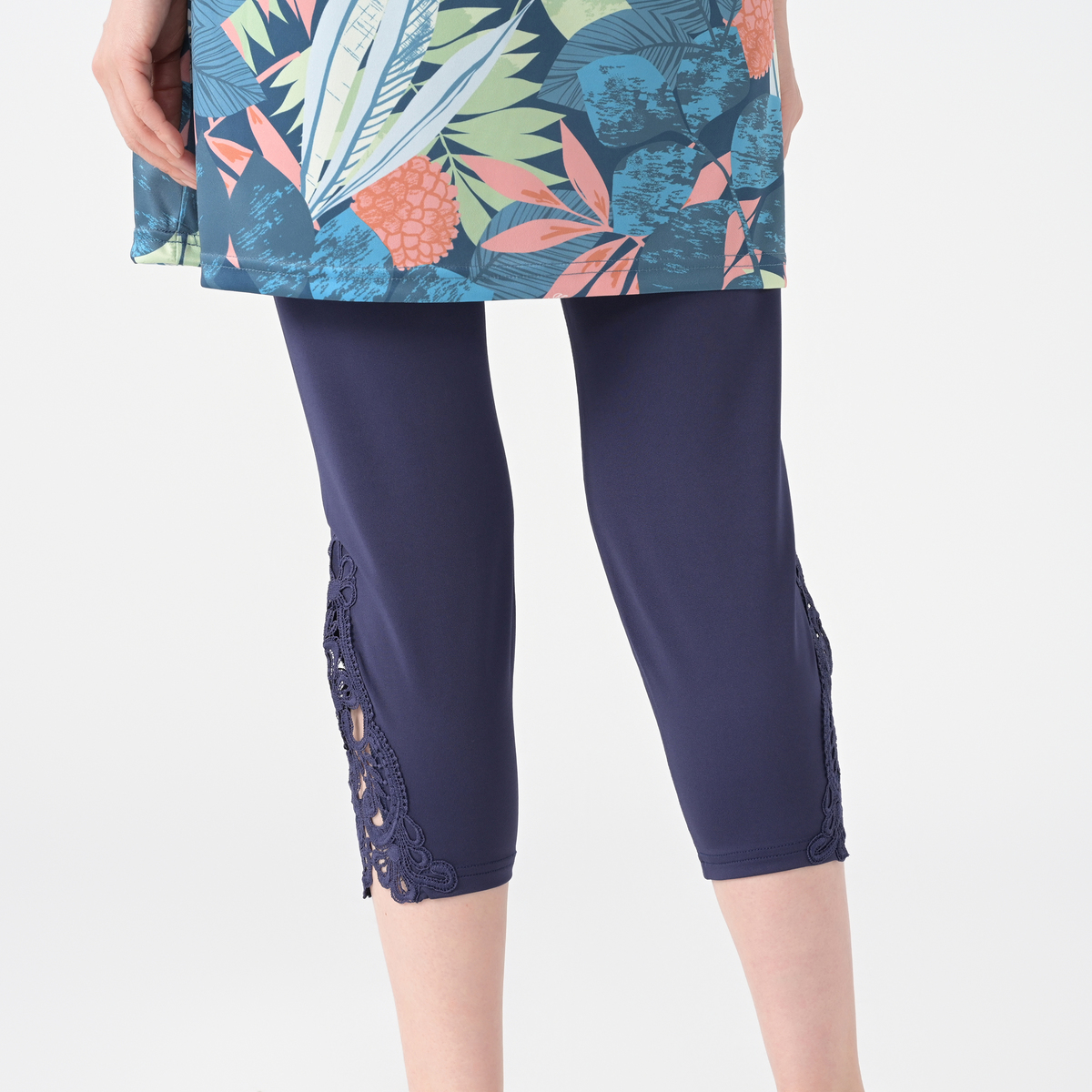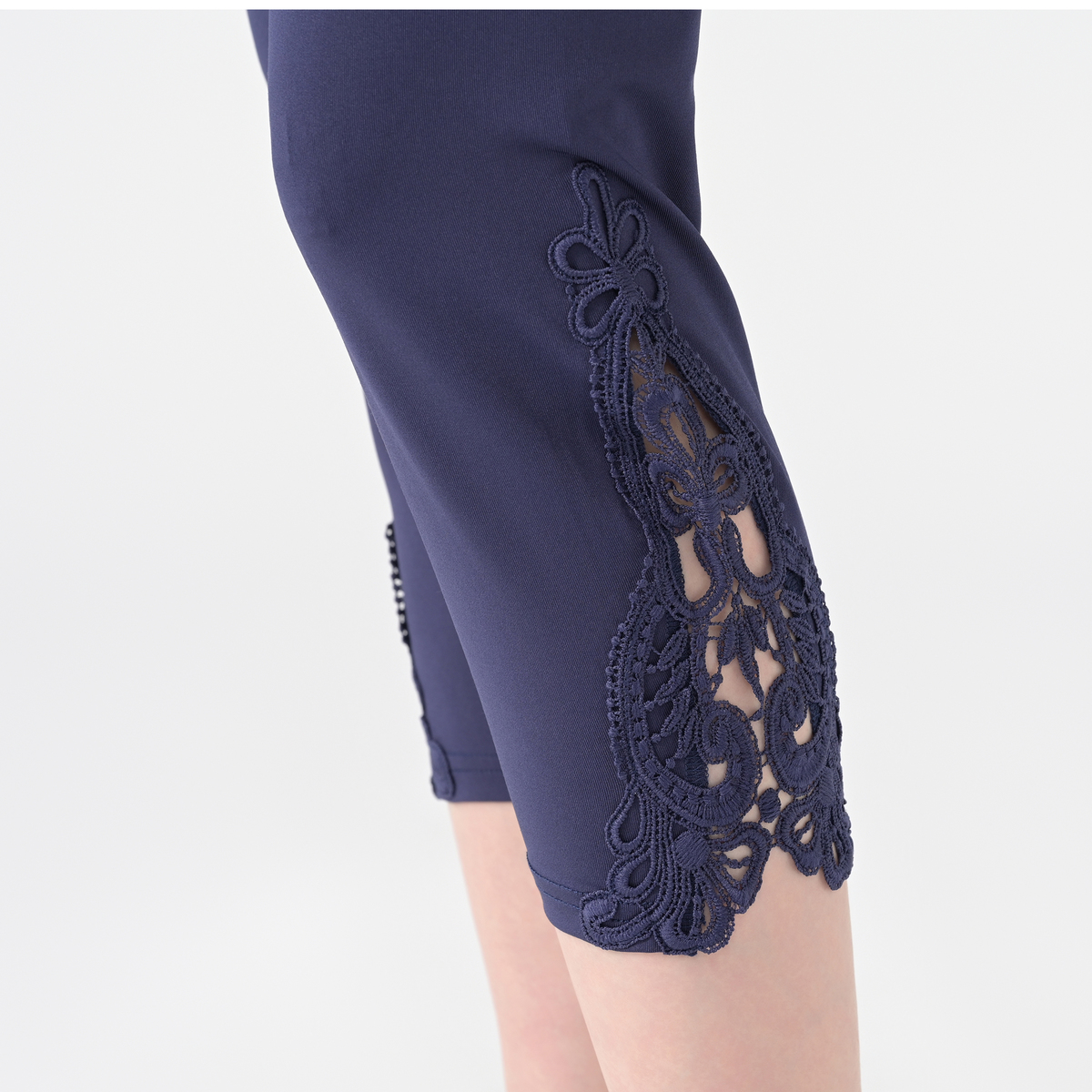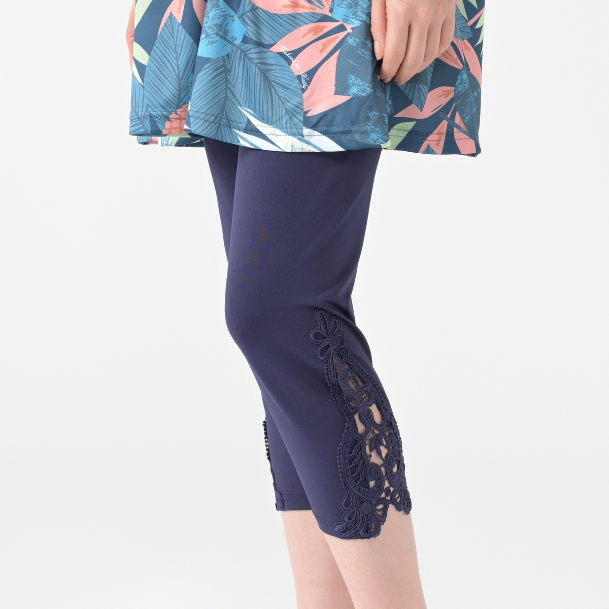 両脇の三角レースがエレガントなレギンスパンツ。豊富なサイズ展開でご用意。大きいサイズの方ならではの、股上が足りなくて穿いているうちに下がってきてしまう、というストレスをなくしたいという思いで開発しました