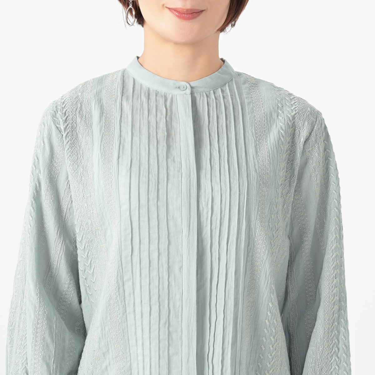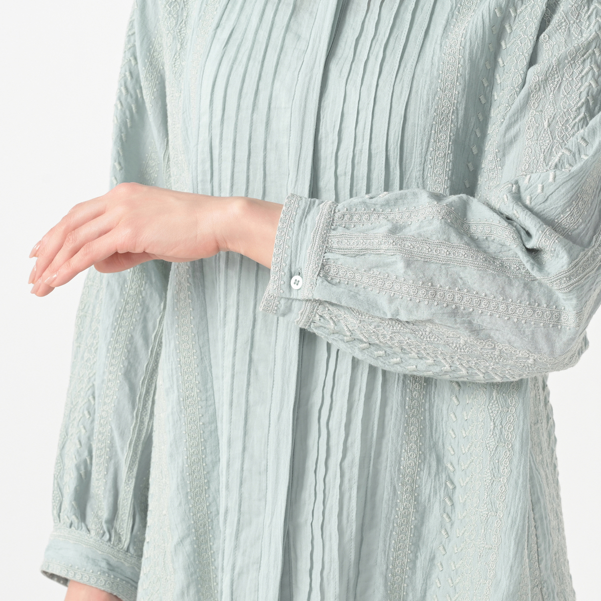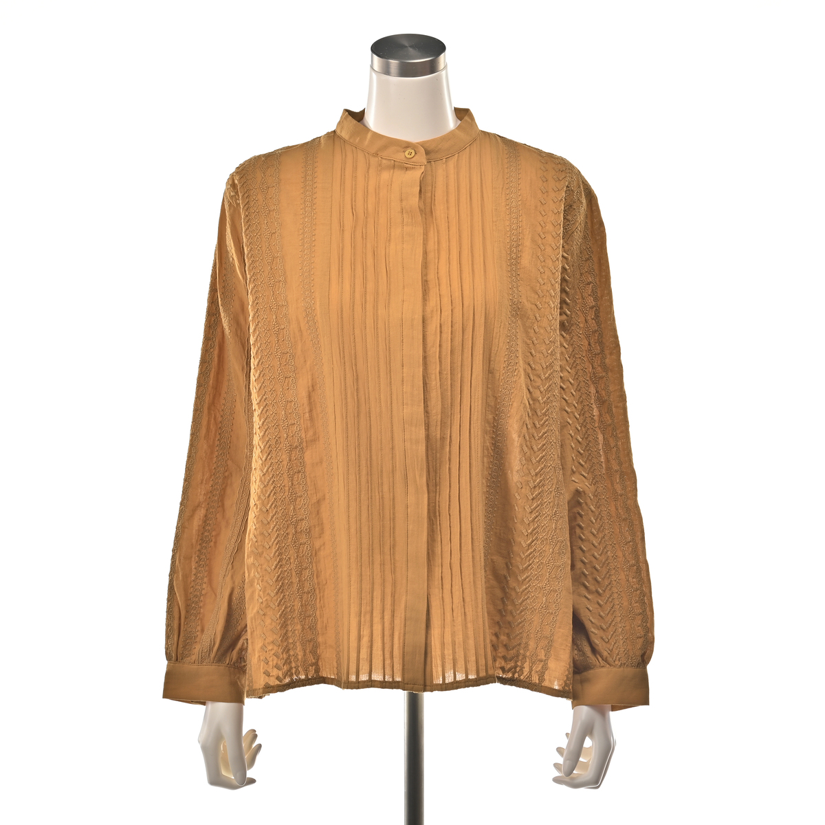 ゆったりしたAラインシルエットで、カフス仕立てのしっかりとした作り。前立ては比翼仕立てにして、よりピンタックが映えるようにしています。ブラウスだけでなく、エアコンや日よけ対策にも便利で、ジャケット感覚でアウターとしてもご着用いただけます