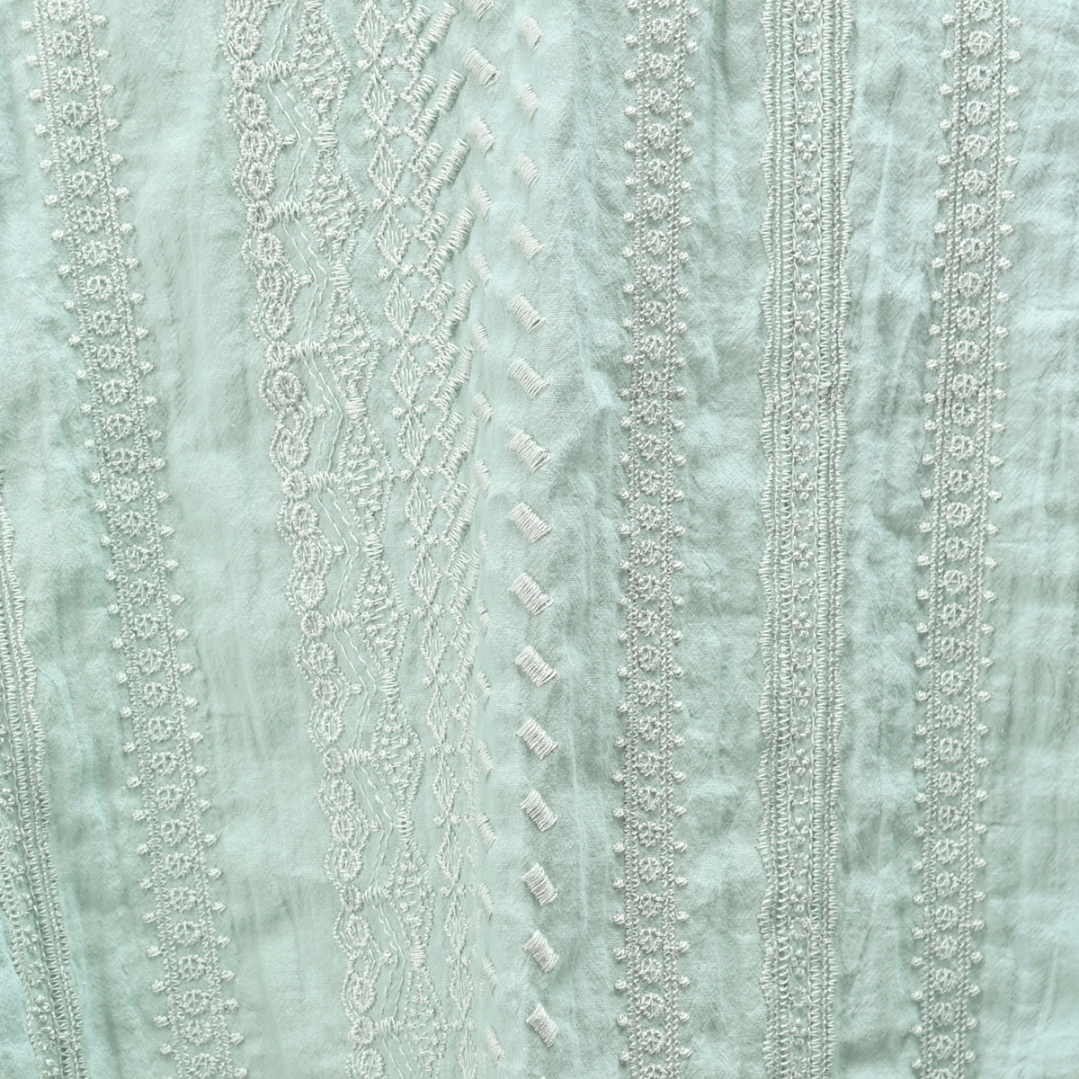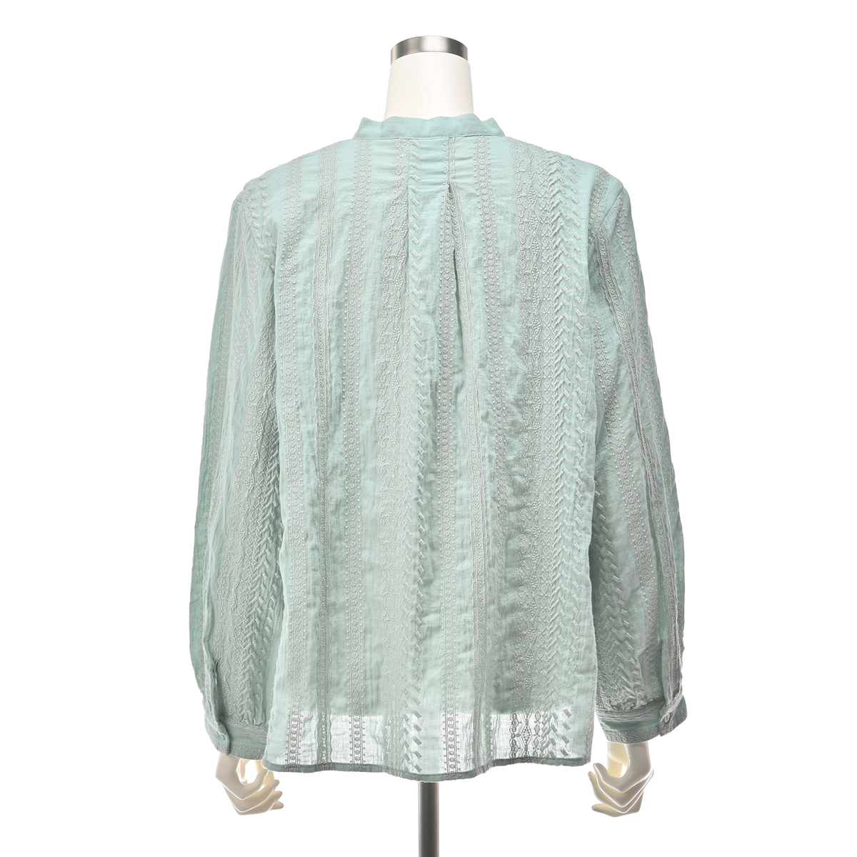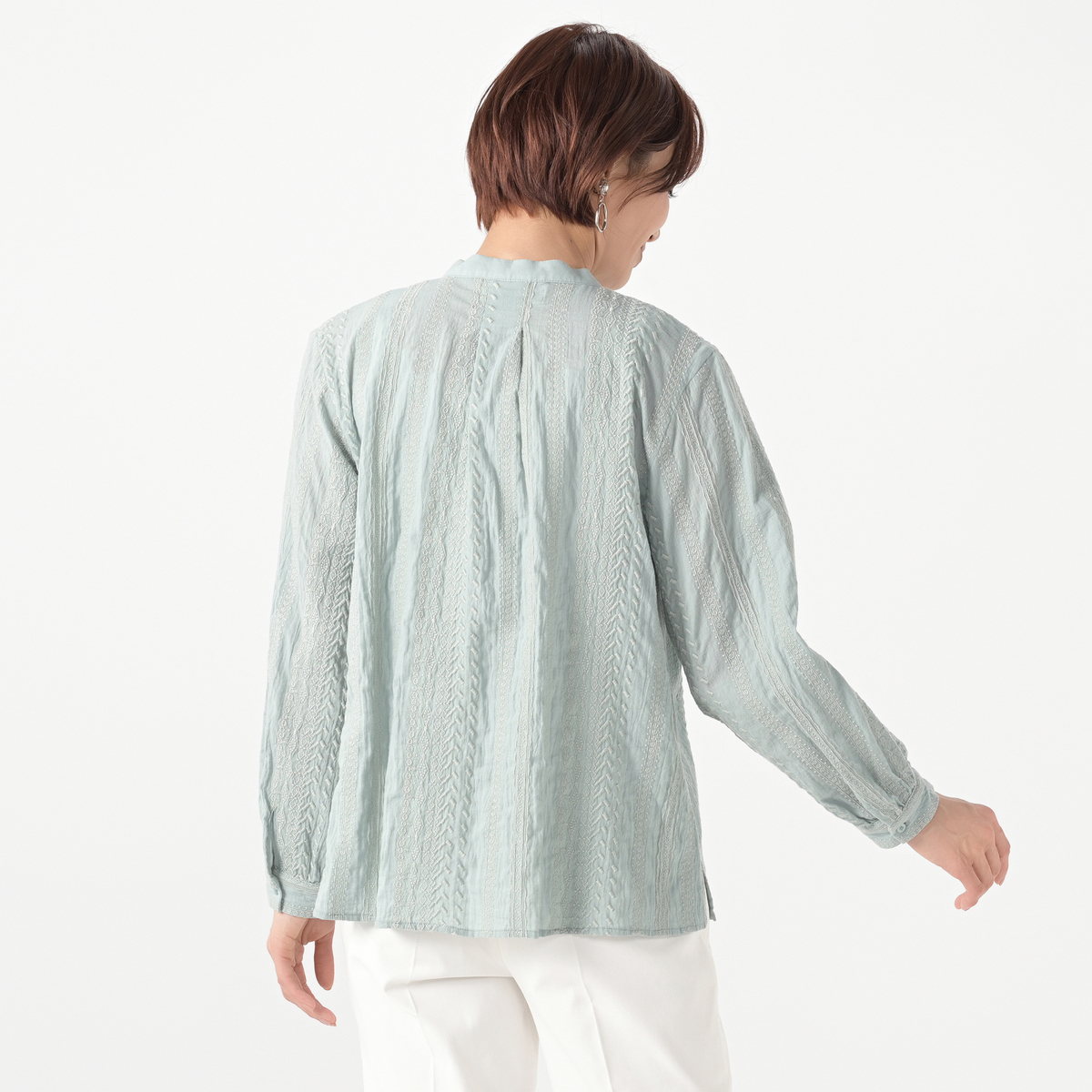 楊柳の生地に繊細な刺繍を施したブラウス。シワが目立ちにくい素材です。刺繍柄はストライプで、身体のラインを細くすっきり見せる効果にも期待できます