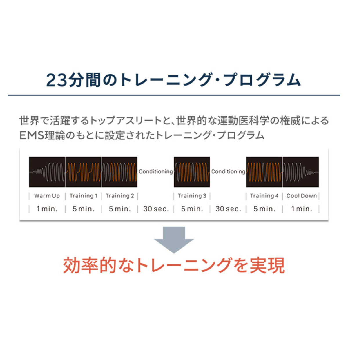 筋肉を効率的にトレーニングする周波数で集中的に鍛える約23分の20Hzモード、ウォームアップやストレッチ、クールダウンとの併用で身体を整える約30分の4Hzモードの二つのモードを搭載しています