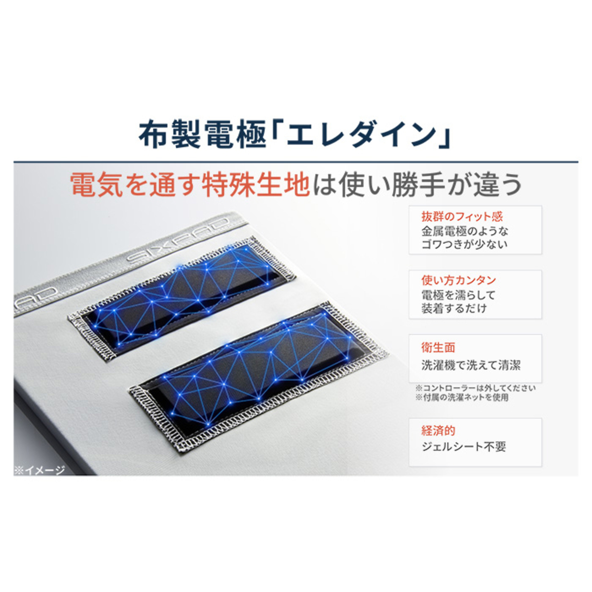 特殊加工を施した繊維を電極にすることで、わずかな水で濡らすだけで通電します(*)。専用の洗濯ネットに入れて、洗濯機で洗うことが可能です