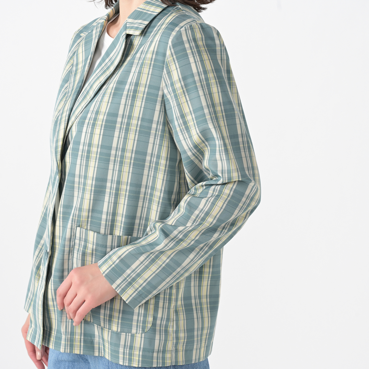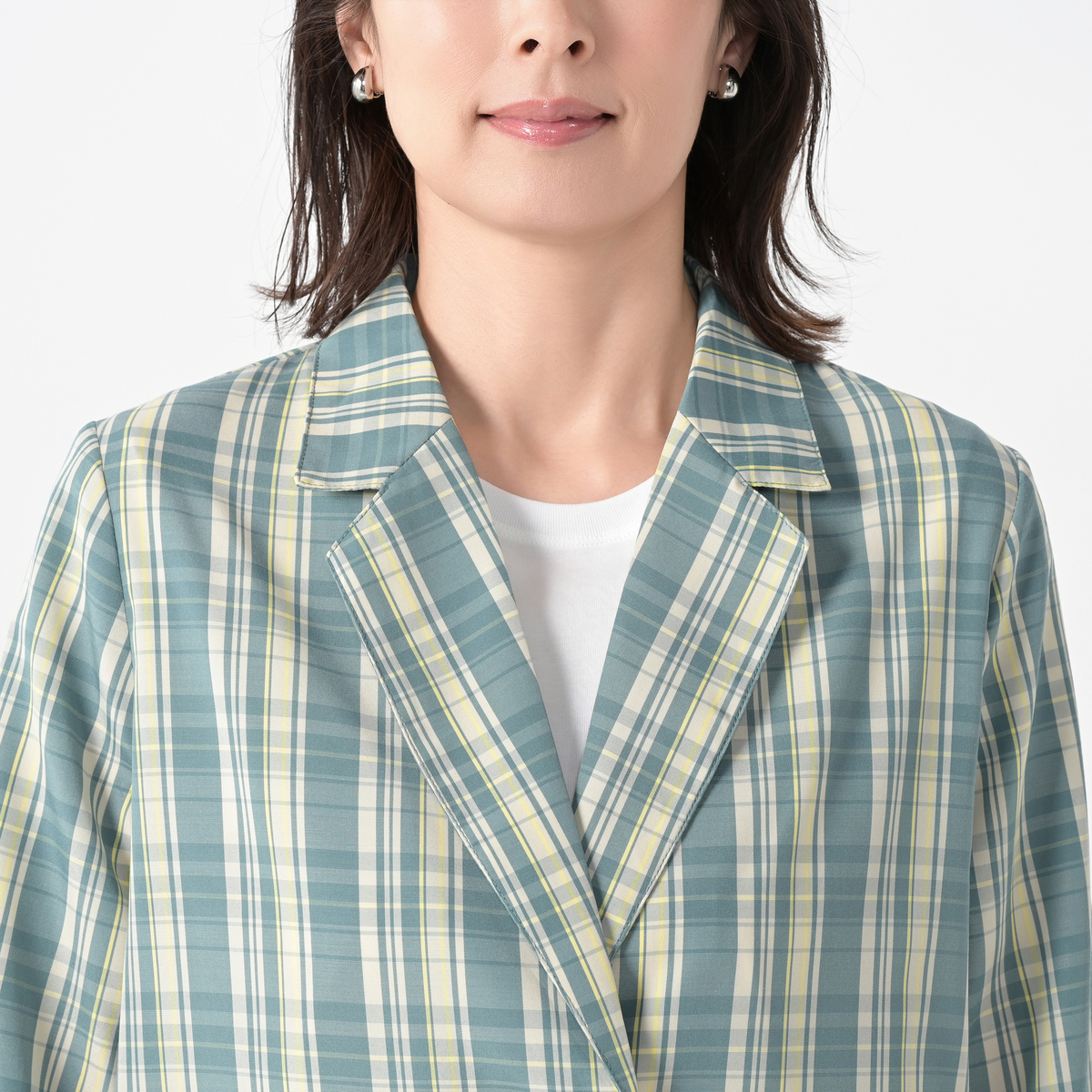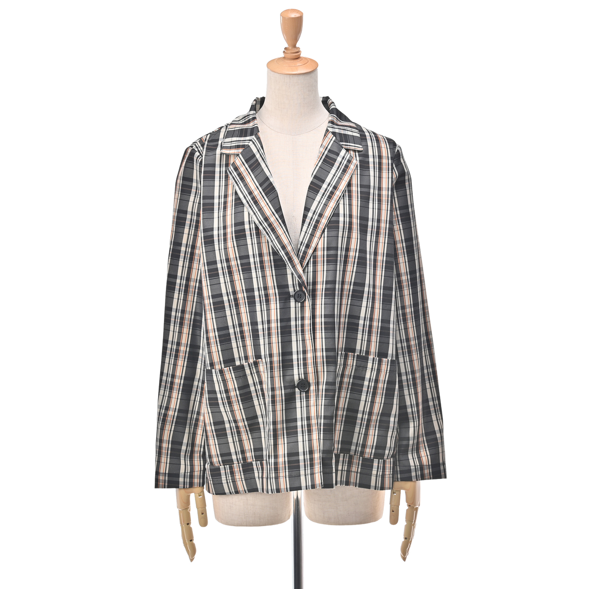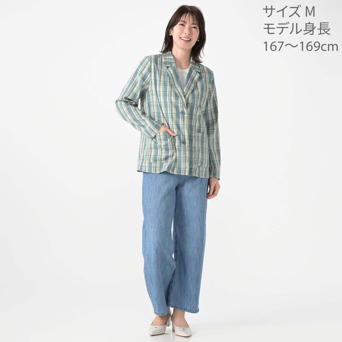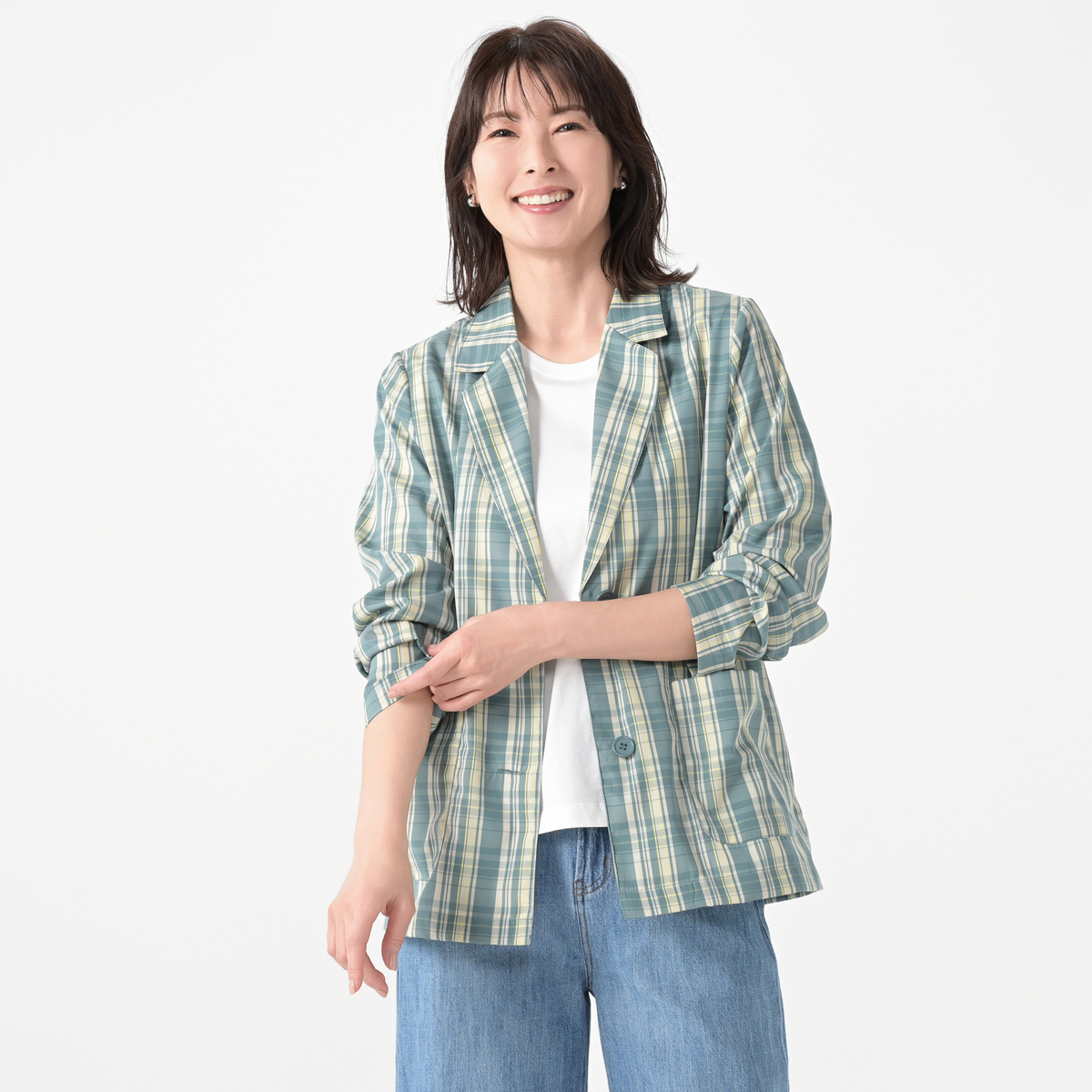 さっと羽織るだけで上品に決まる、チェックのテーラードジャケット。やや長めの着丈と、大きなアウトポケットが特徴です。デニムパンツやワイド系ボトムスと好相性です