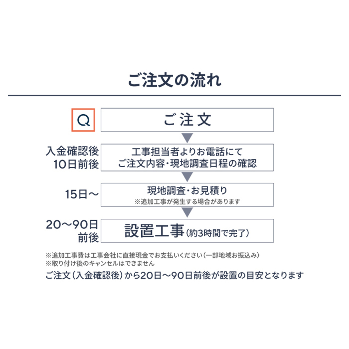 【商品のお届けについて】ご注文より、振込完了または分割対応完了の後、10日前後で施工会社より確認の連絡が入ります。ご注文から20〜90日前後での設置となります