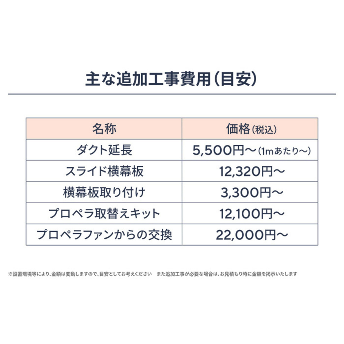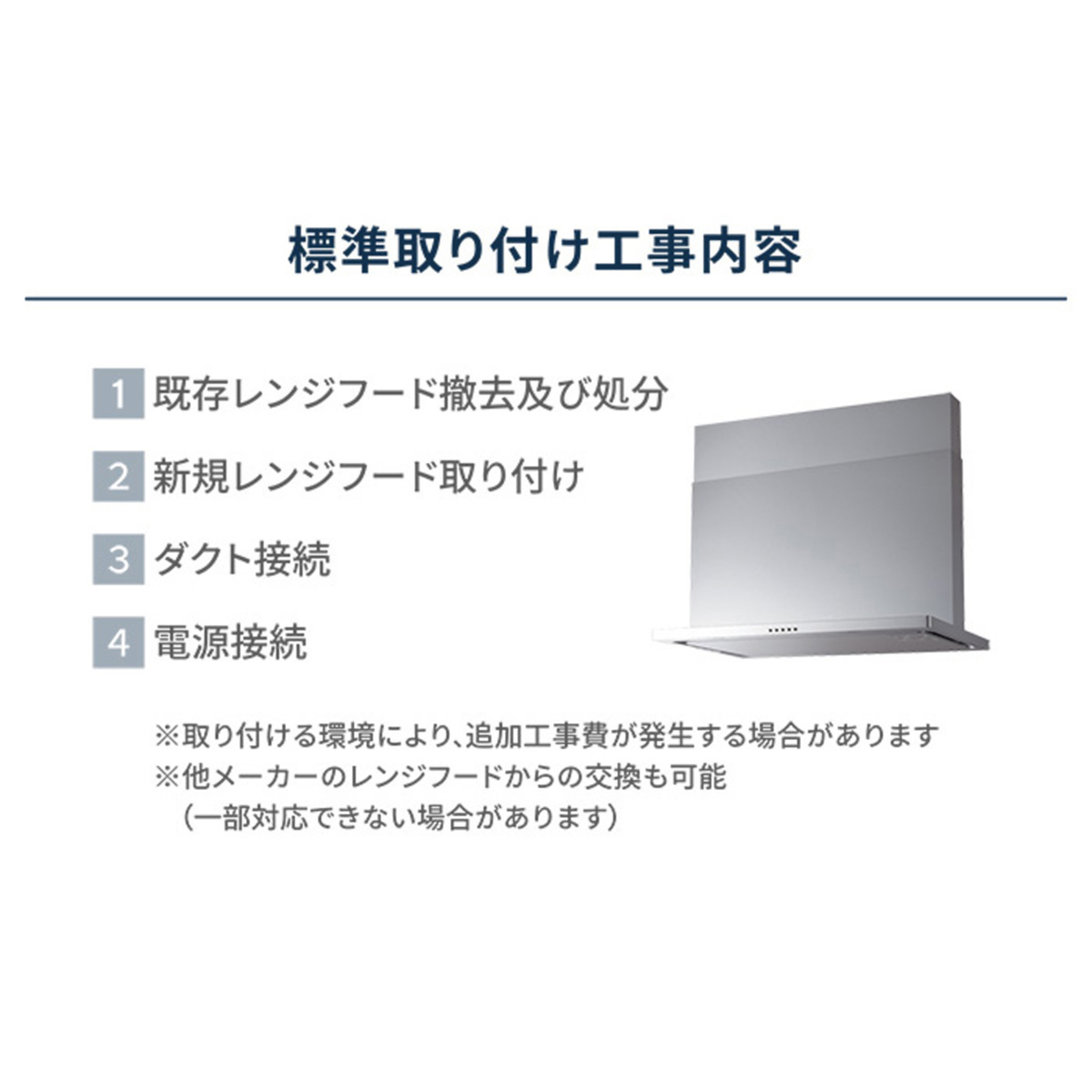 標準取り付け工事の内容は、下記をご参照ください。 <標準工事内容>●既存レンジフード撤去及び処分●新規レンジフード取り付け●ダクト接続●電源接続※取り付ける環境により、追加工事費が発生する場合があります。詳しくは工事業者からの連絡時にお問い合わせください。