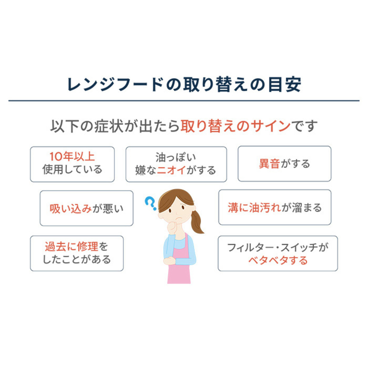 交換するレンジフードの横幅と同じサイズをお選びください。※設置できない機種や環境の例:フードのないプロペラ換気扇(引き紐タイプ)、アイランド型(アイランドキッチン)、ターボファン、賃貸や新規取付