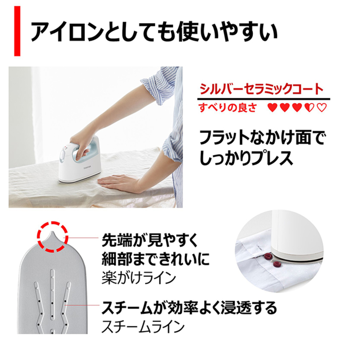 コードを気にせず、ラクに使えるコードレス衣類スチーマーです。お出かけ前などにも、サッとシワ伸ばし。厚手のセーターなどにはコード付きでと、2通りの使い方ができます。本体は約690g(コードレス時の質量)の軽量タイプ。アイロンとしてもお使いいただけます