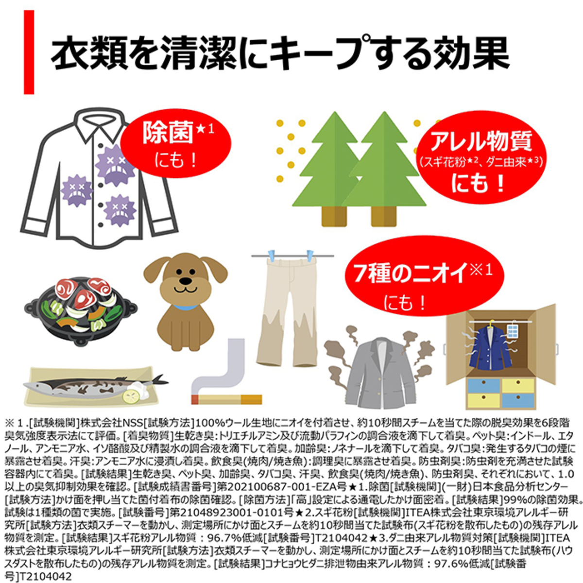 スチームボタンを1度押すと連続でスチームが出るので、手に掛かる負担を軽減します(コード付き時は約1分間で停止)。スチーム使用可能範囲は約240°(ハンガーなどに掛けた衣類に平行に向けた場合)で、斜め下向きでもスチーム噴射。衣類に合わせて3段階で温度設定ができ、低温・中温・高温の全ての設定でスチーム噴射します