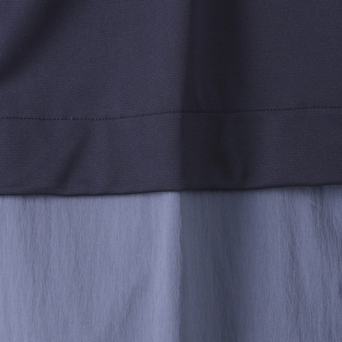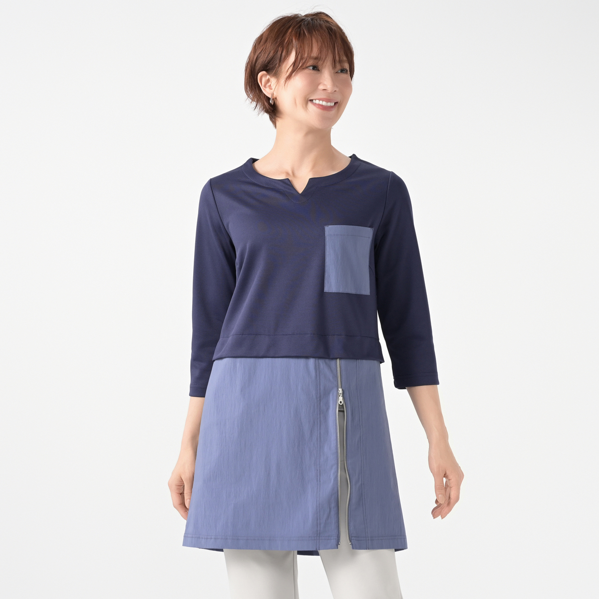 ファスナースリットを入れたデザインチュニック。お好みでファスナーを開ければ、着こなしに抜け感をプラスできます。ポンチと布帛の異素材コントラストもお洒落ポイントです