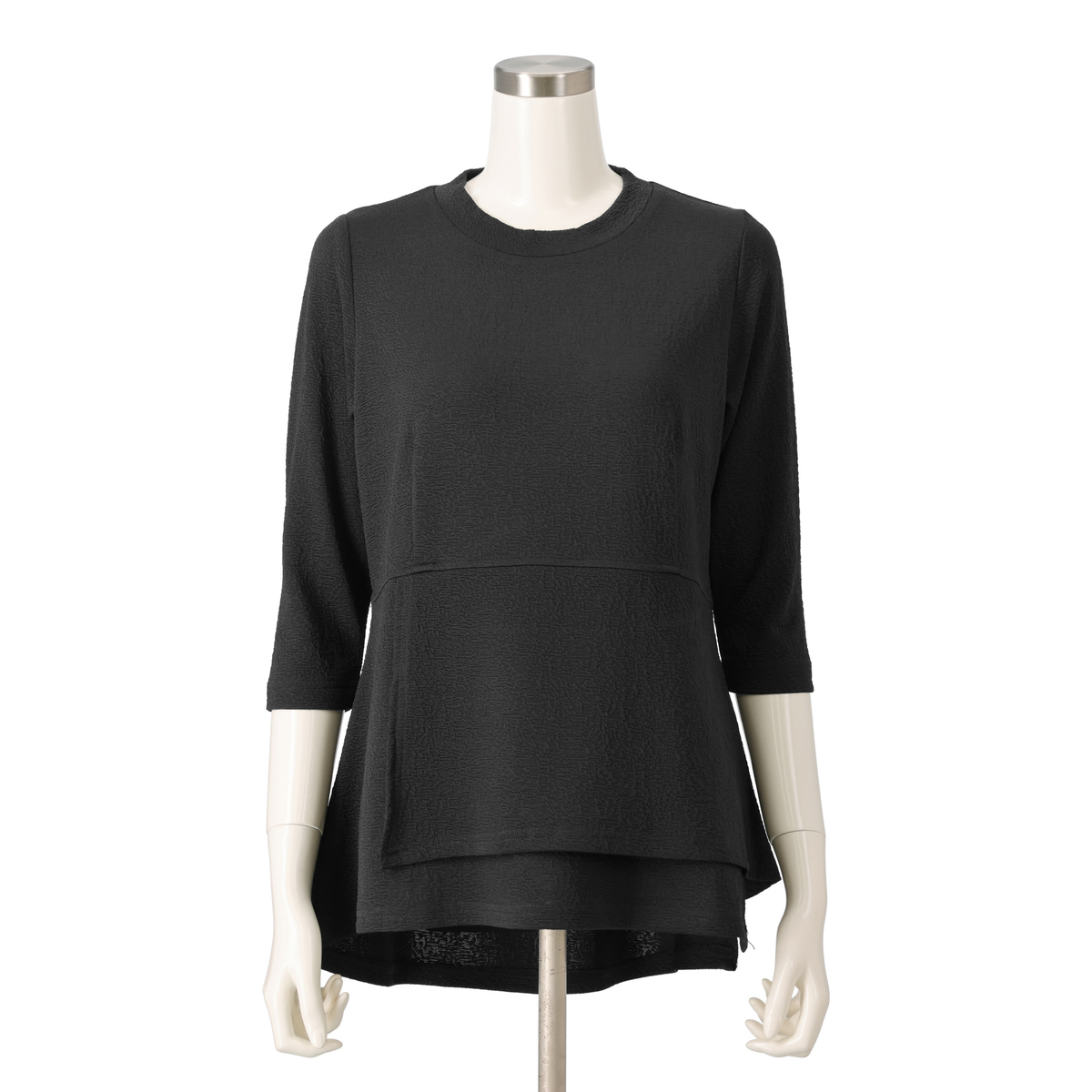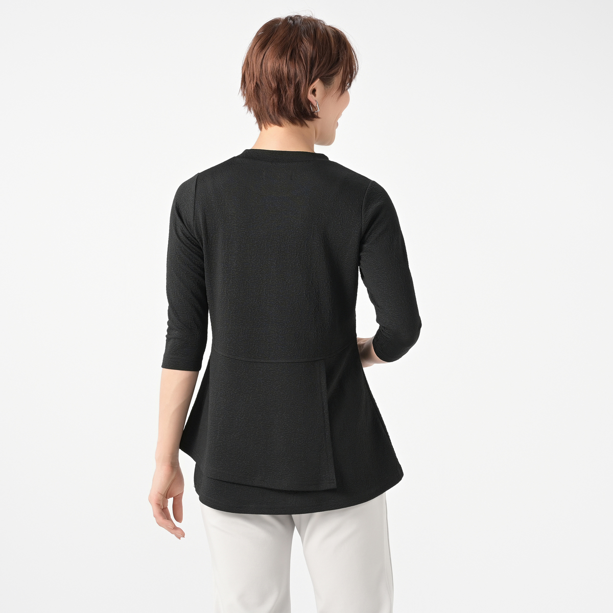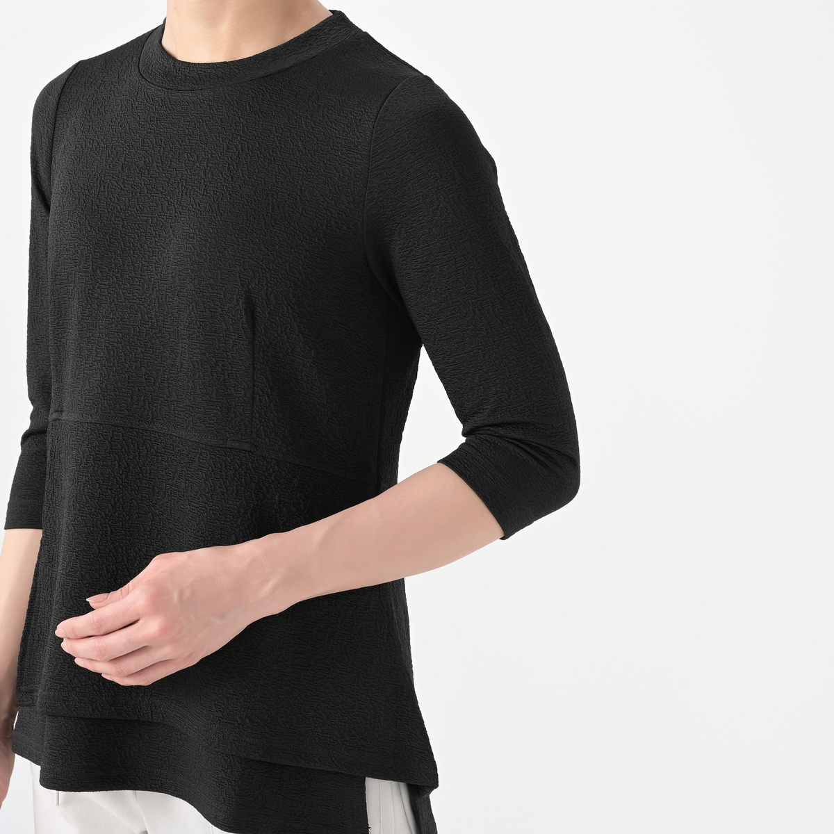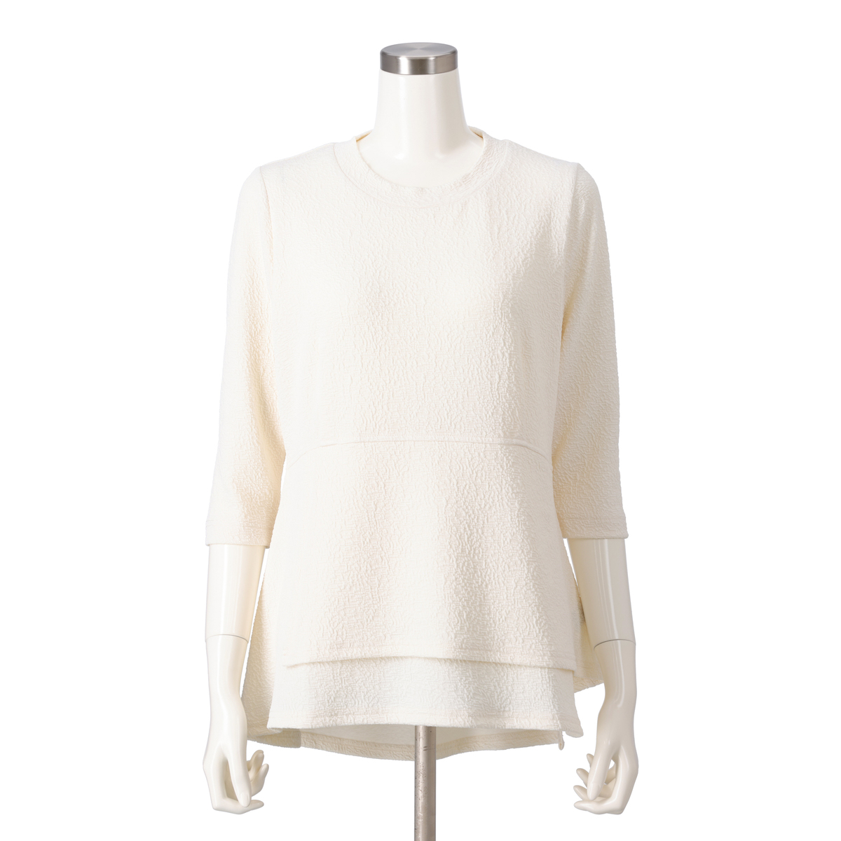 軽やかな凹凸のあるニットジャガードを使用したプルオーバー。ペプラム部分の重なりで奥行きを表現したデザインがポイント。いつものコーディネートに取り入れるだけで旬のスタイルを演出します
