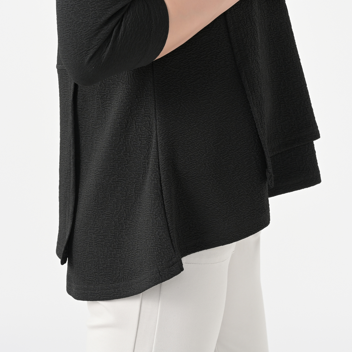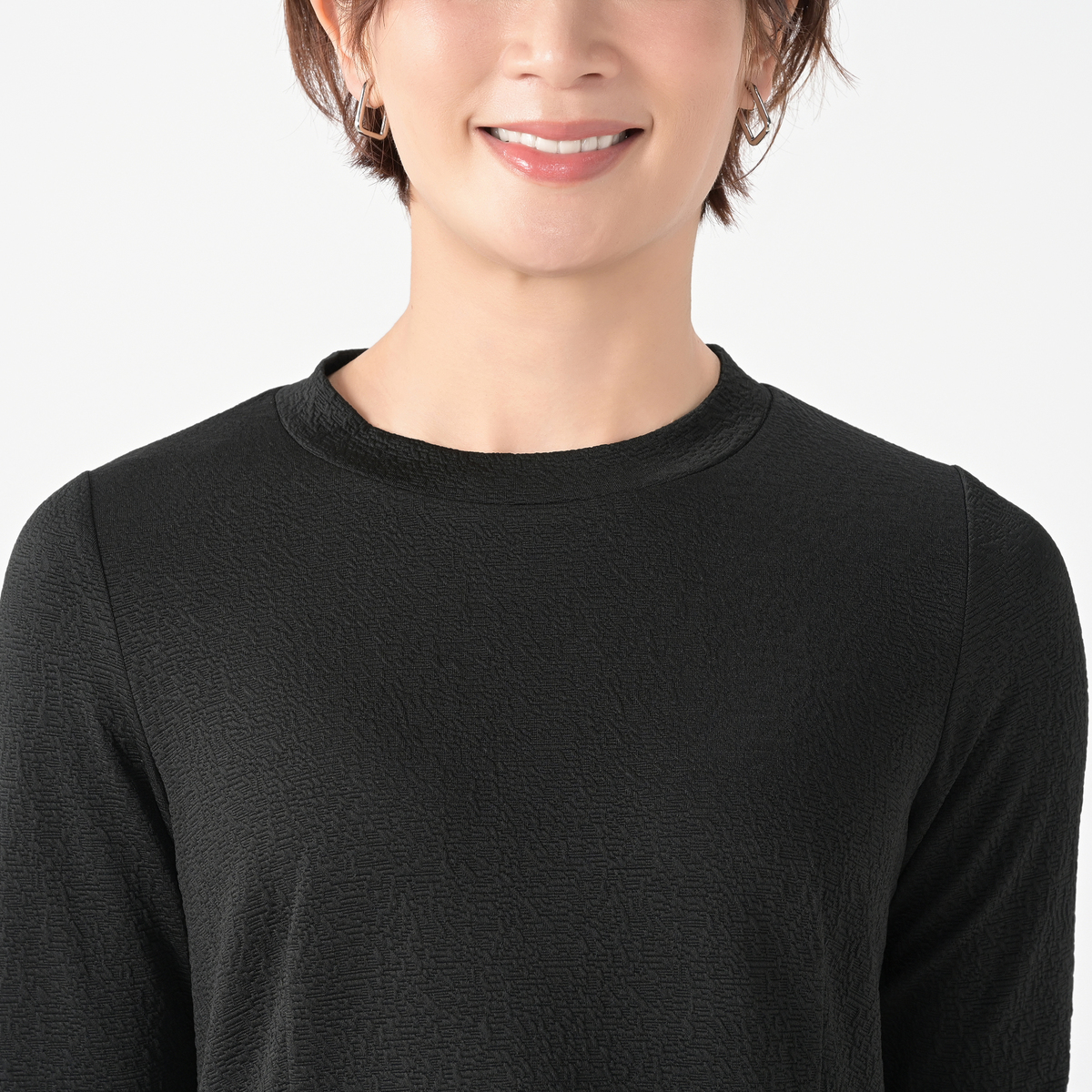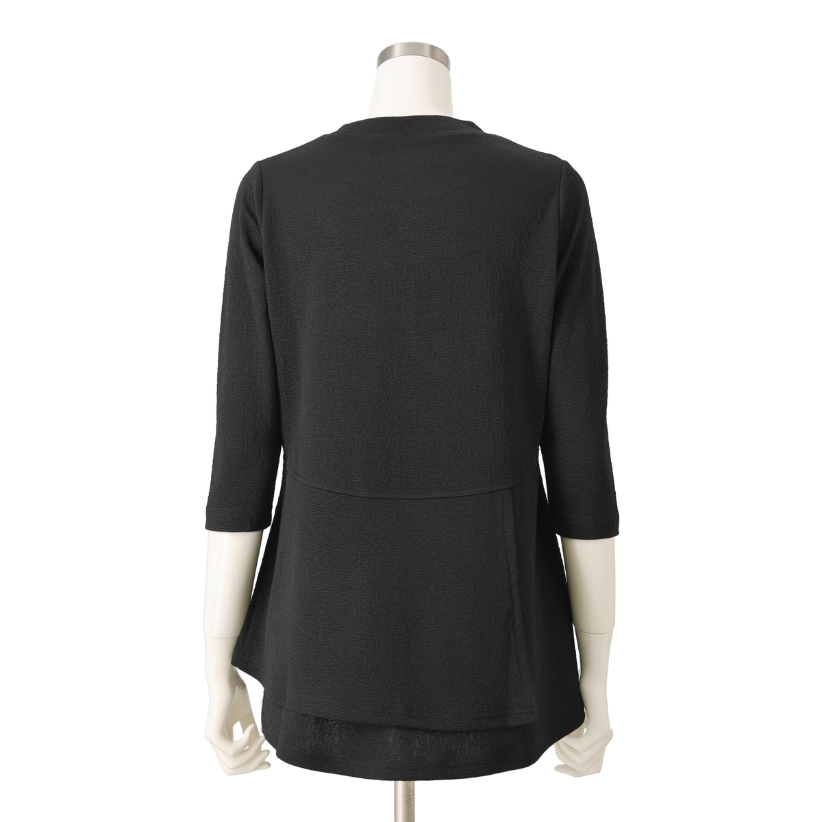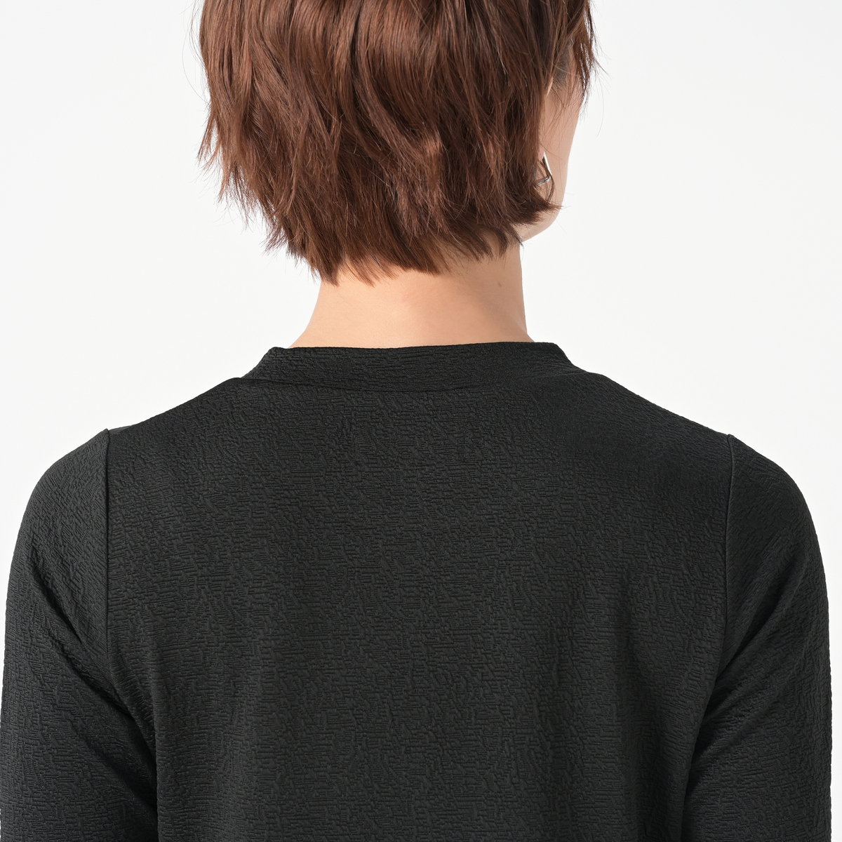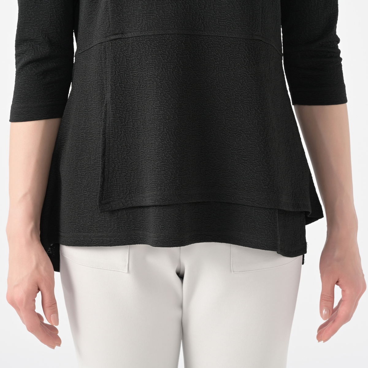 軽やかな凹凸のあるニットジャガードを使用したプルオーバー。ペプラム部分の重なりで奥行きを表現したデザインがポイント。いつものコーディネートに取り入れるだけで旬のスタイルを演出します