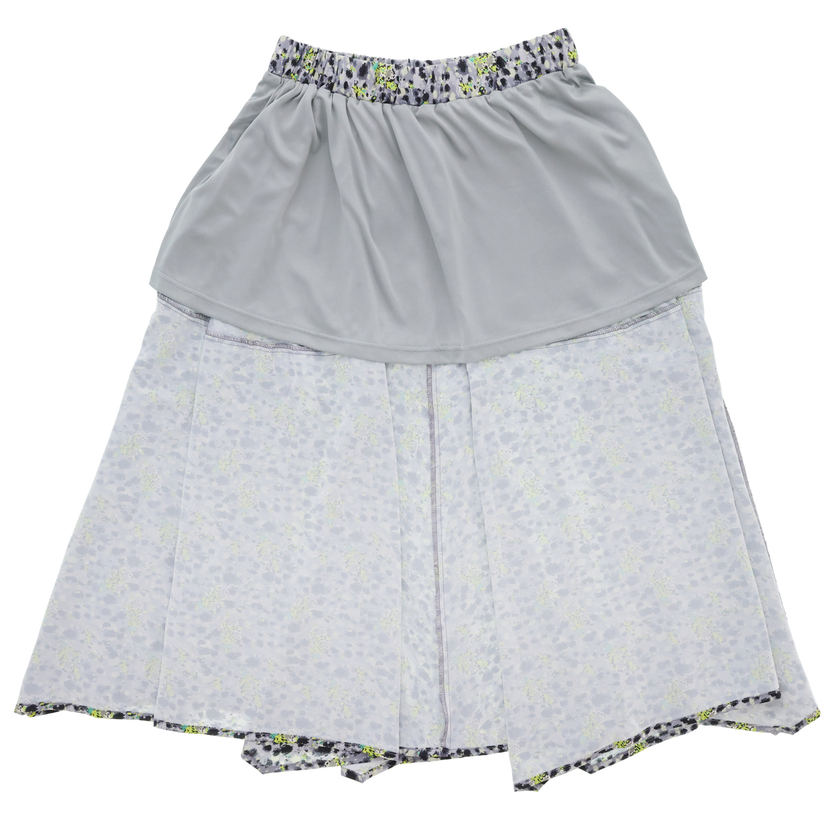 腰周りはボリュームが出過ぎない様に扇状のパターン、裾部分はハンカチーフヘムの様なシルエットを出す為に4枚接ぎの不思議なパターンニングに。ウエストは総ゴム仕立てのプルオンタイプで、平ゴムを表地で包んだ仕立てです。着用時にゴムが捻れないように両脇にゴムを抑えるステッチも隠し入れています
