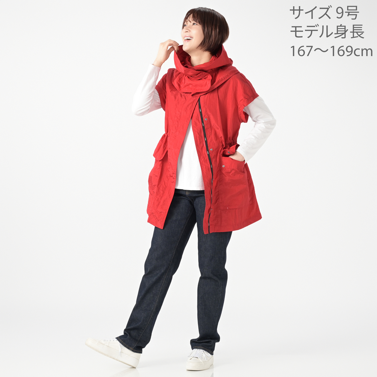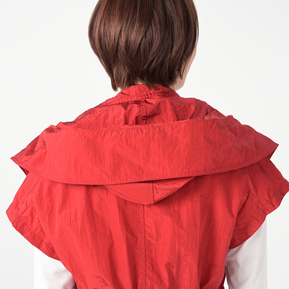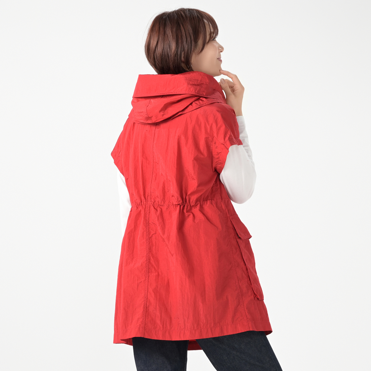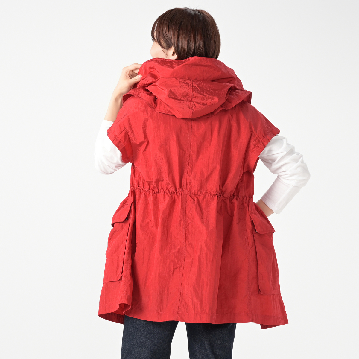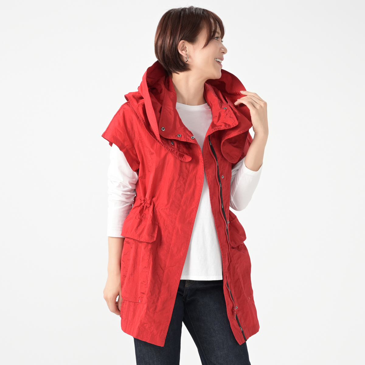 軽い着心地でシワを気にせず着回せるワッシャー素材を使用。ミドル丈のAラインシルエットで、コーディネートしやすいジレです。首から程よく離れたスタンドカラーが首のほっそり見せ効果とフードの綺麗な立ち上がりを演出。モッズコートのフードをイメージしながらも、大人に似合う上品さを目指した作りです