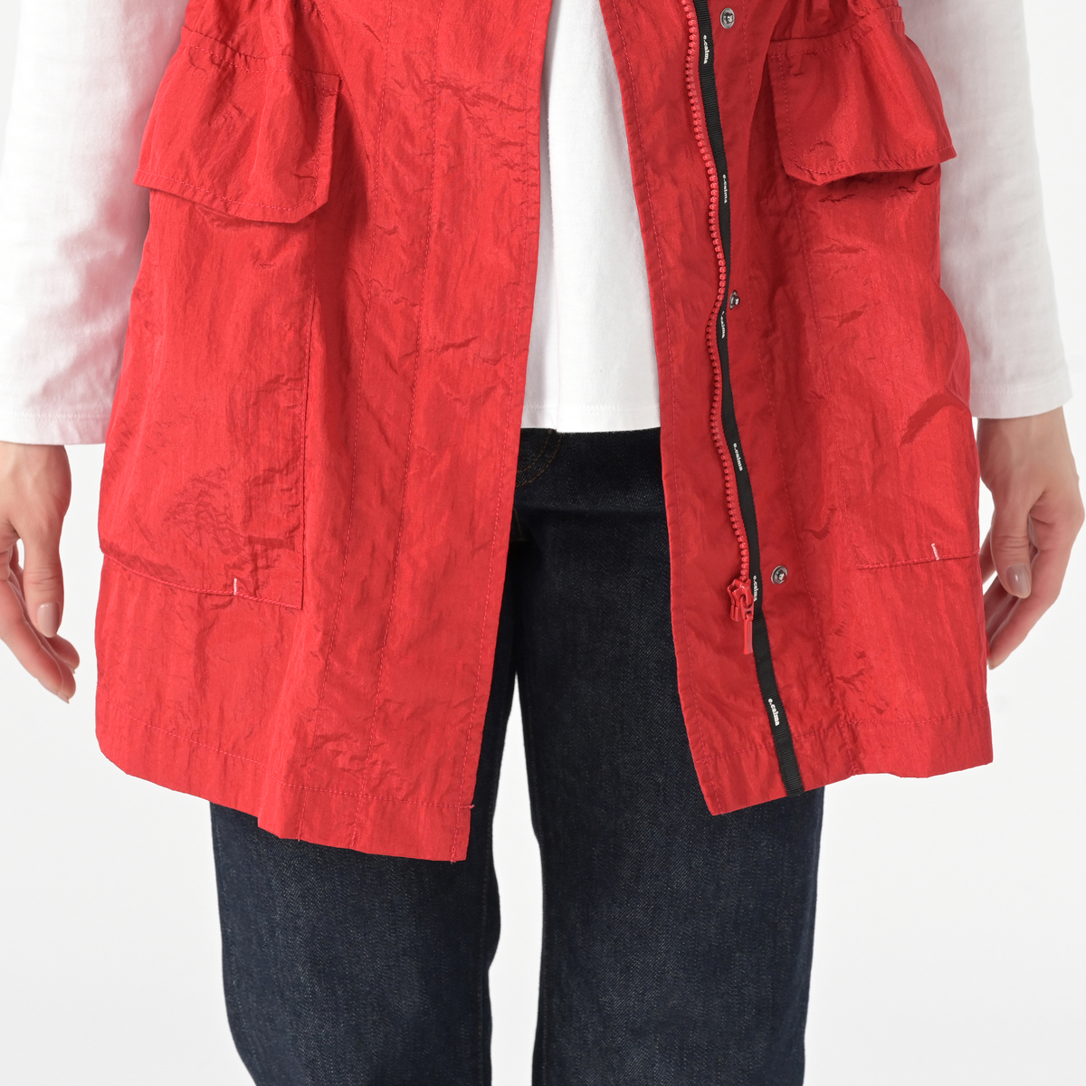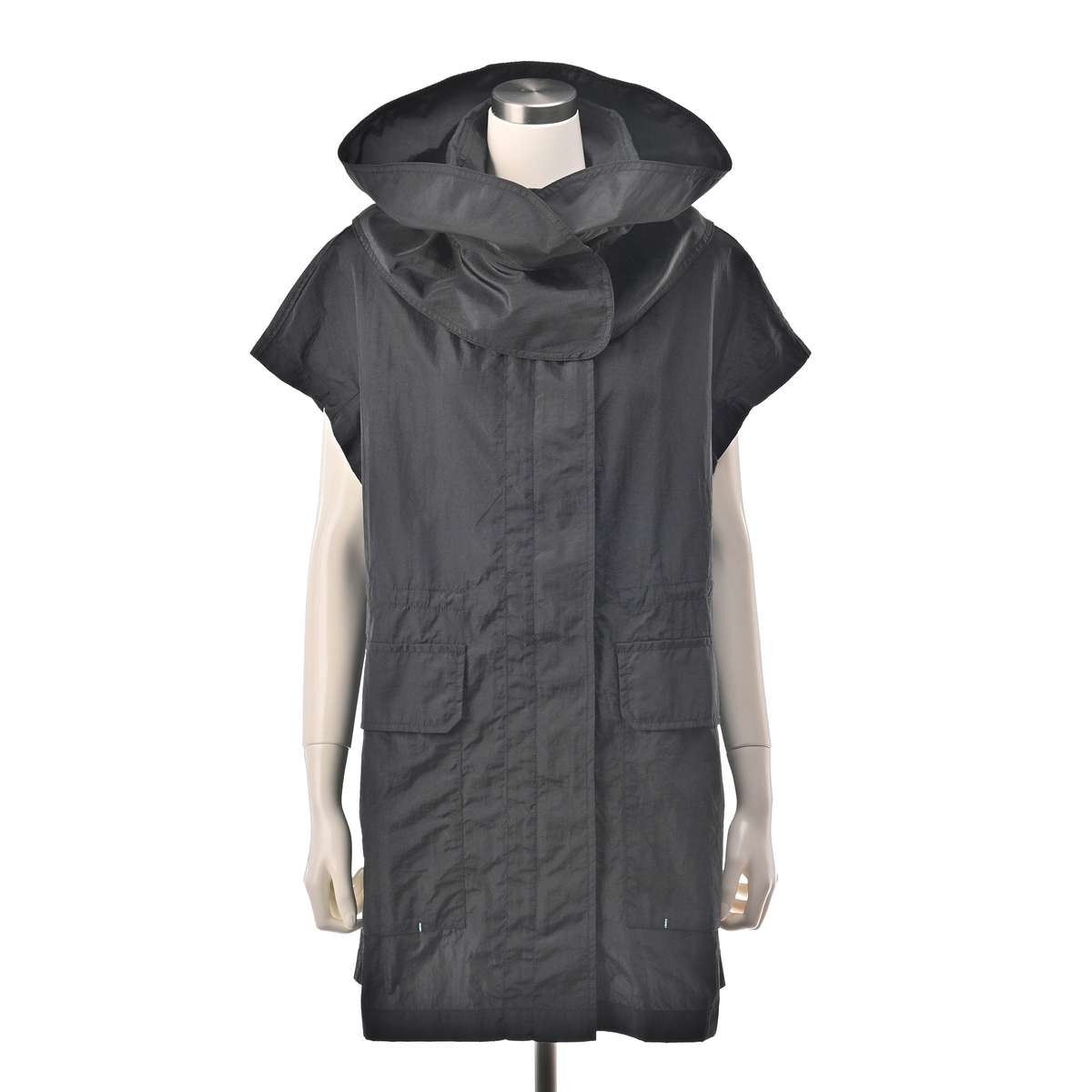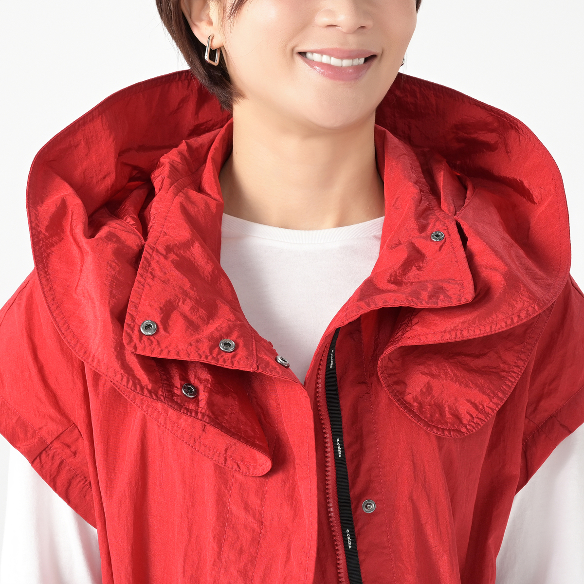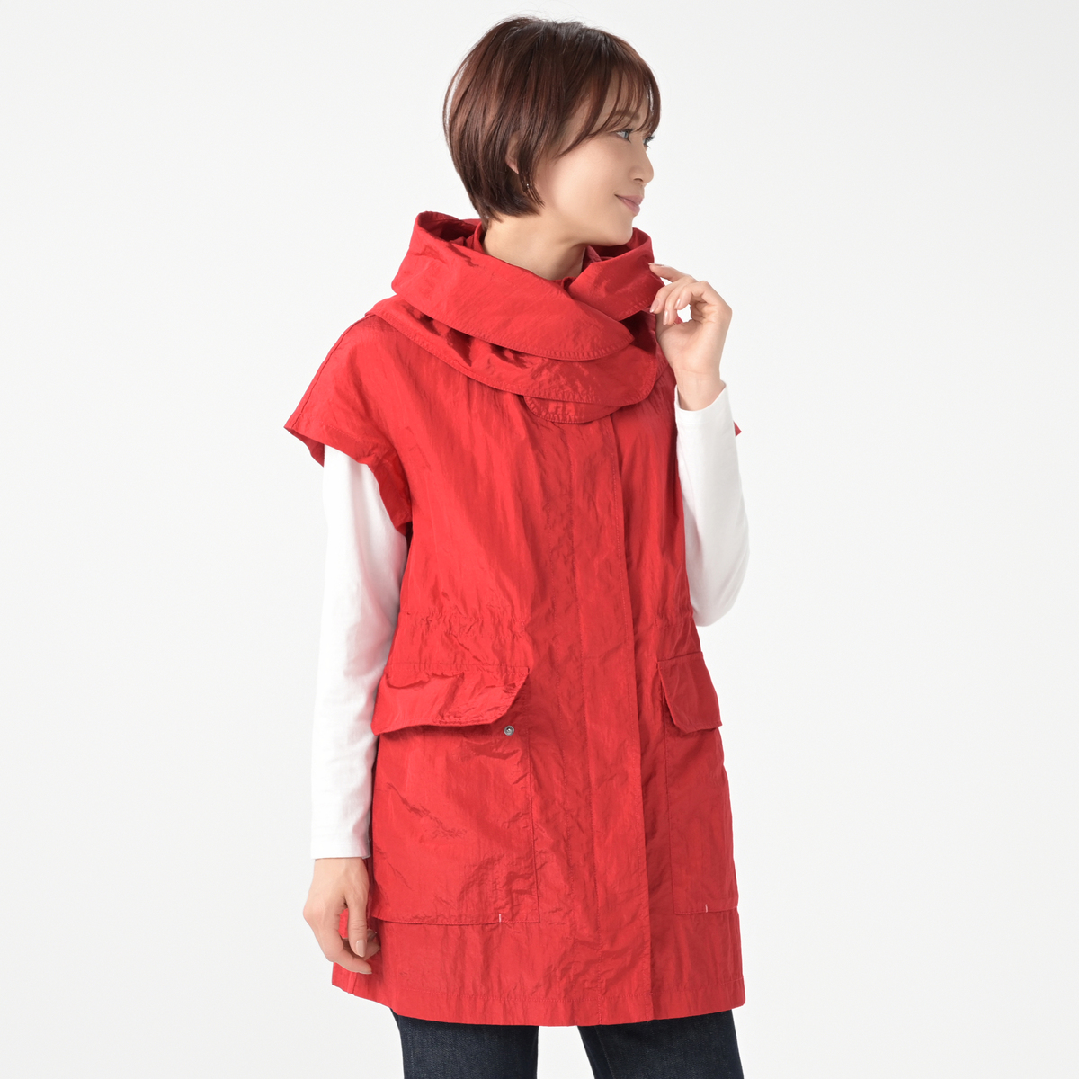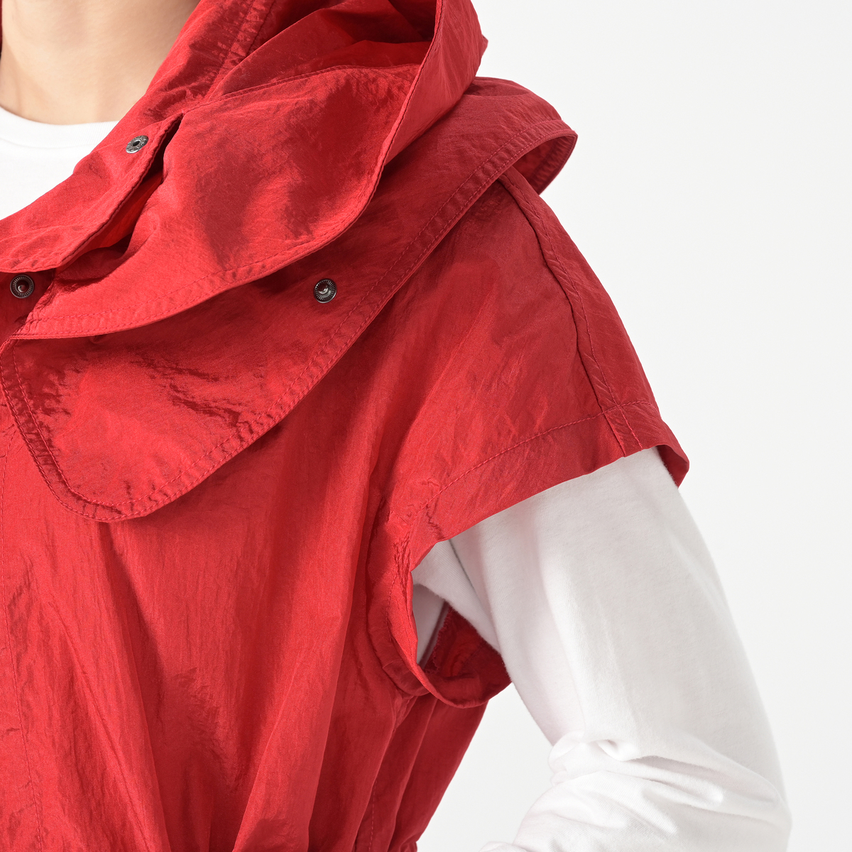 軽い着心地でシワを気にせず着回せるワッシャー素材を使用。ミドル丈のAラインシルエットで、コーディネートしやすいジレです。首から程よく離れたスタンドカラーが首のほっそり見せ効果とフードの綺麗な立ち上がりを演出。モッズコートのフードをイメージしながらも、大人に似合う上品さを目指した作りです
