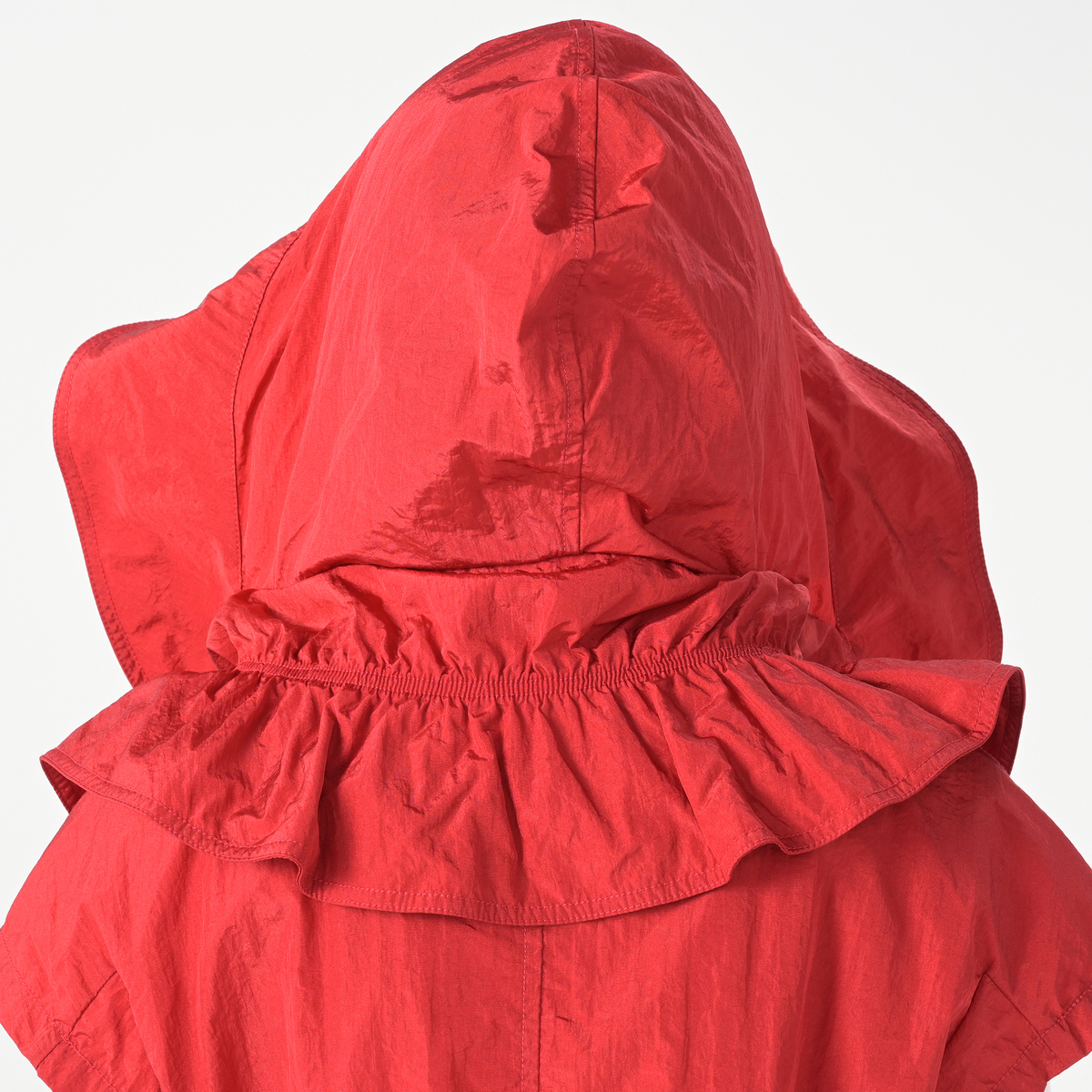 フード部分は外回りに雨よけパーツを付けて、折り返した時の生地の重なりや複雑性で豪華見せに一役。被った時には日除け対策にもなります。更に持ち出しパーツをつける事で、風除けで前がしっかりと閉じられ、開けてもデコルテ周りが華やかに見えます