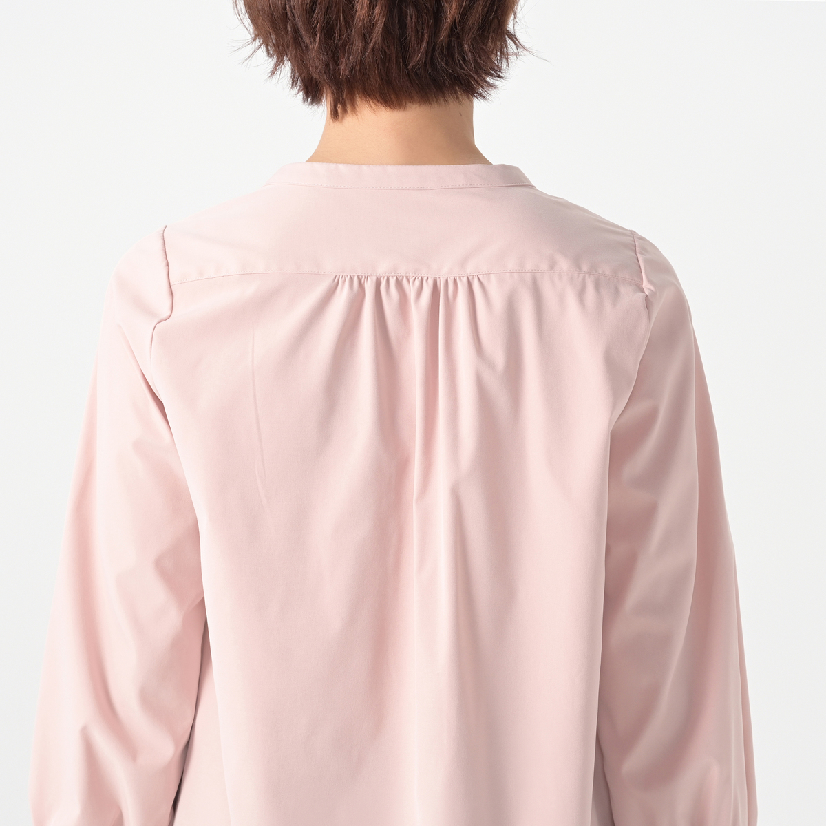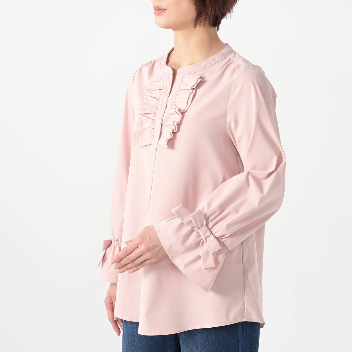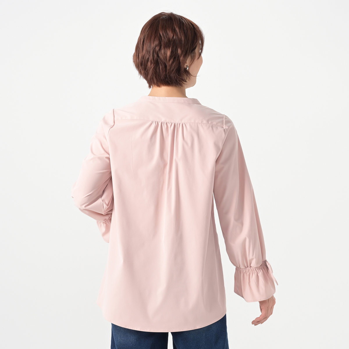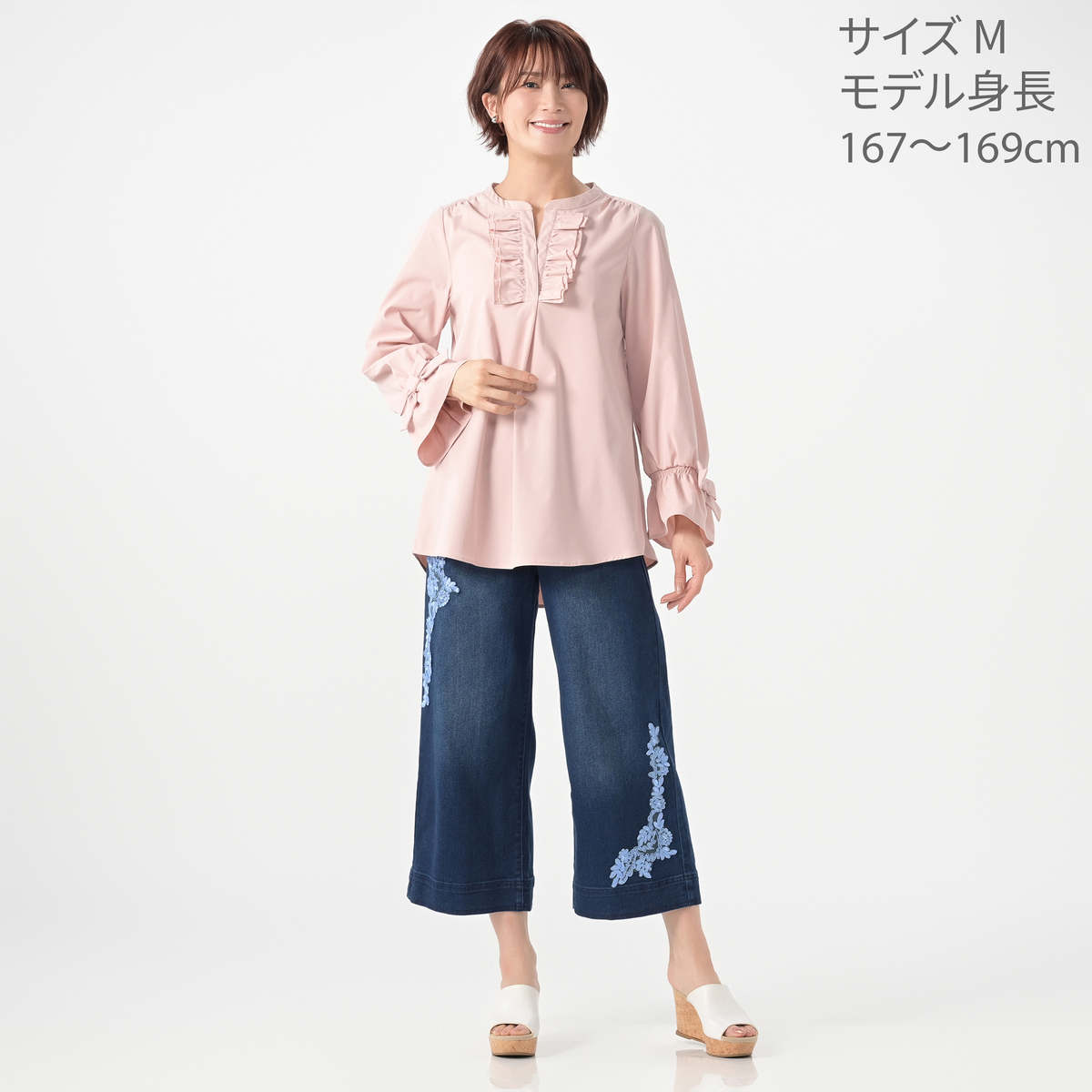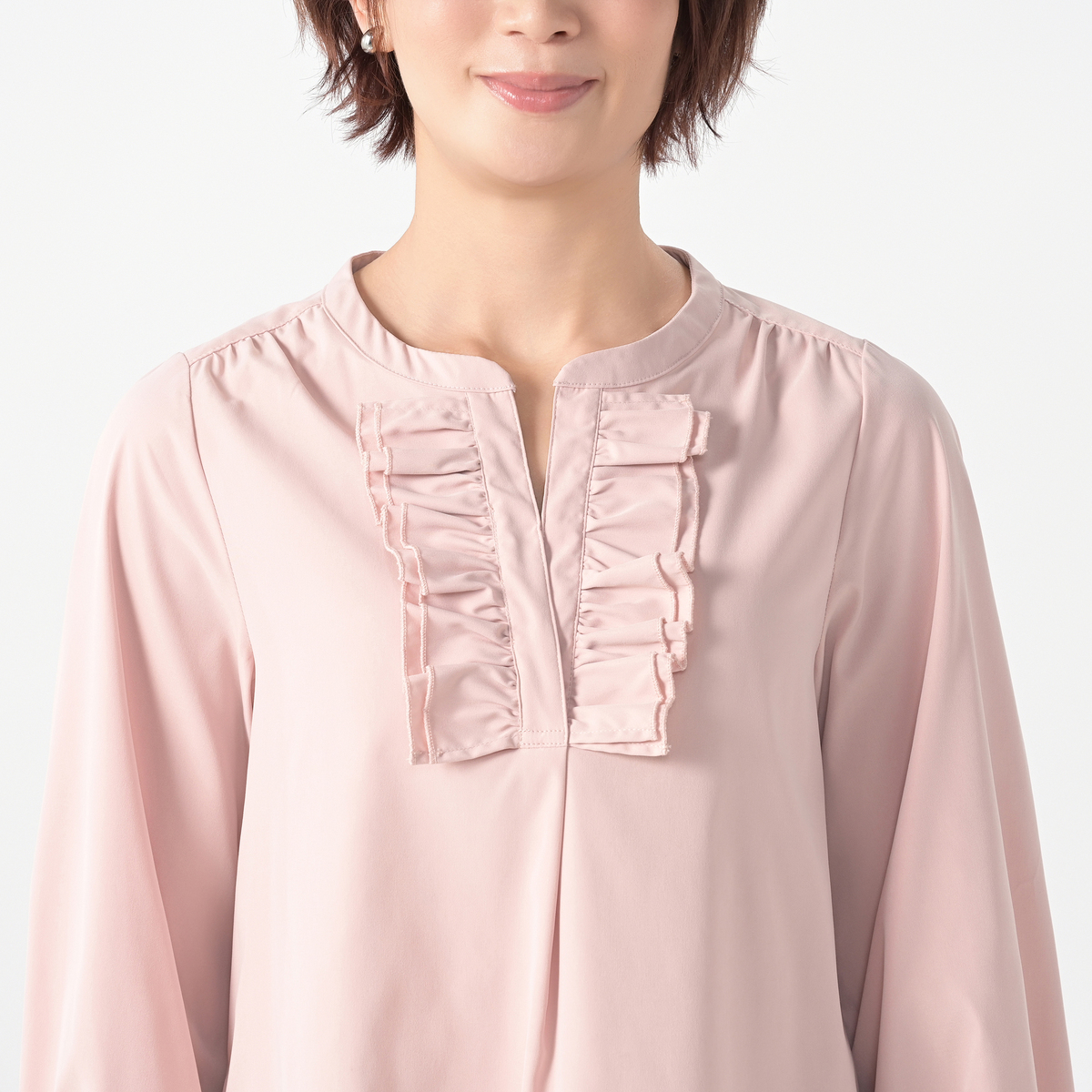 共生地の幅違いの2枚フリルが大人可愛さをプラス。スタイリッシュなVラインに開けた前立てが、お顔まわりをすっきりとした印象に。袖口にはシャーリングを施して、ふんわり優しいパフ感のキャンディスリーブに仕上げました