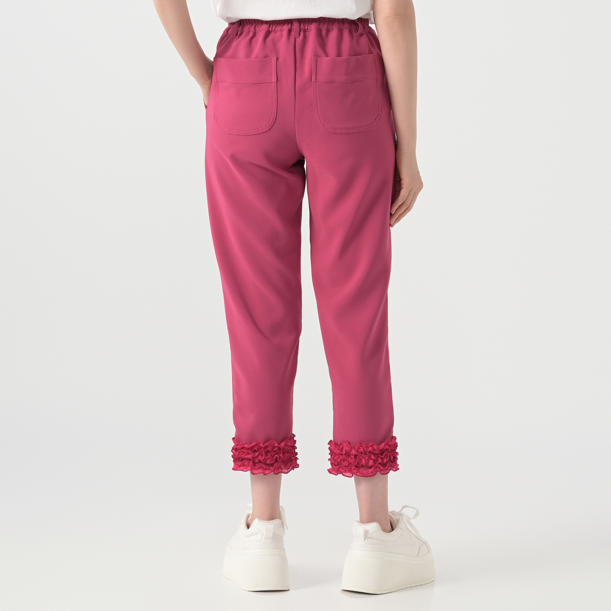裾に華やかなシフォンフリルをあしらった、上品な美脚パンツです。細めに見えるシルエットでありながら、ヒップや太もも、ふくらはぎは細すぎず、肉感が目立ちにくいサイズ感に。落ち感があるので、脚のラインを拾いにくく、体型をカバーします