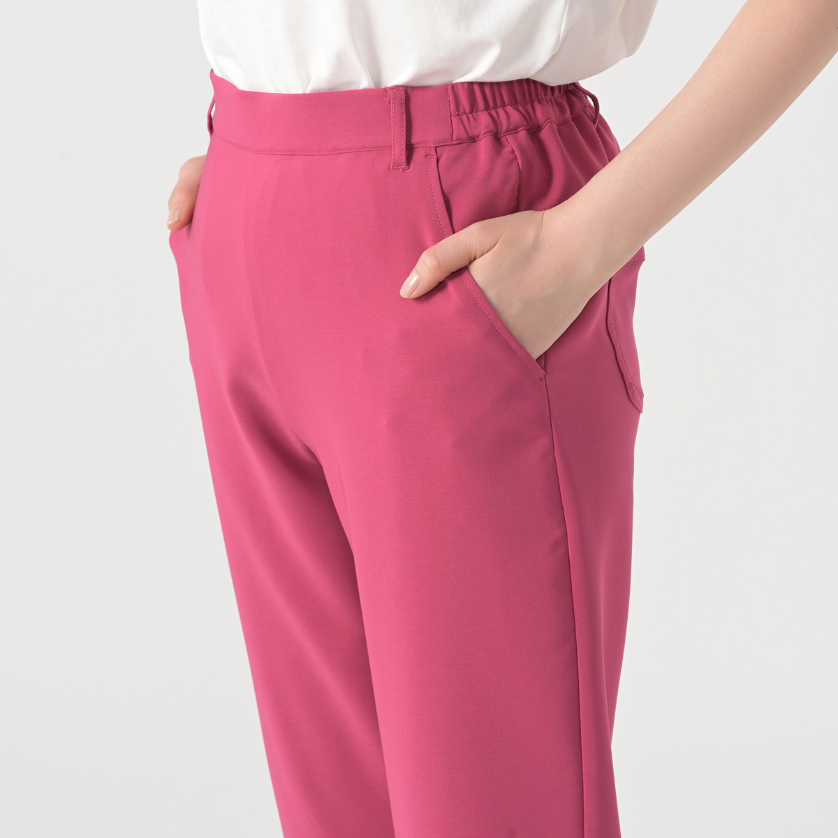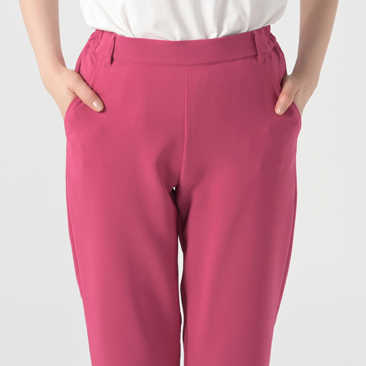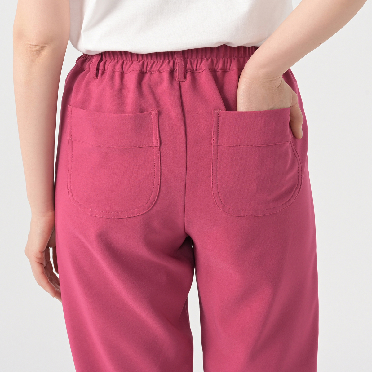 肌触りが心地よく、柔らかな布帛素材を使用。ストレッチ性があり、楽な穿き心地です。楽に穿けるのに、前ウエストにはギャザーを入れず、すっきりとしたデザインにしています