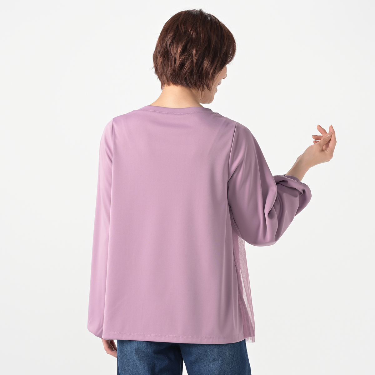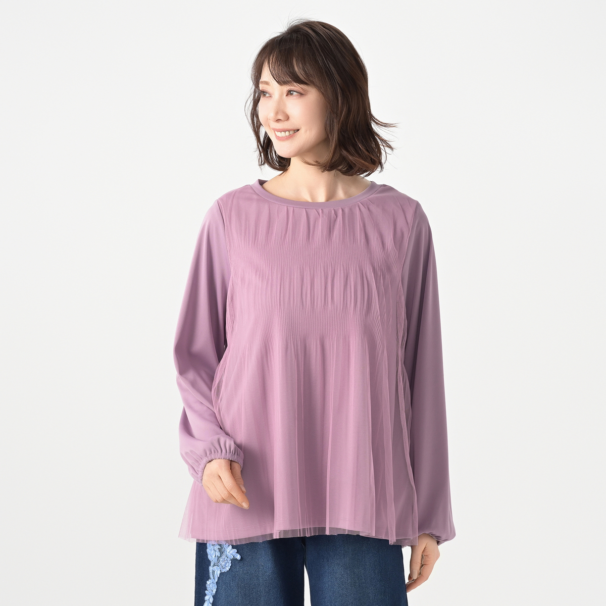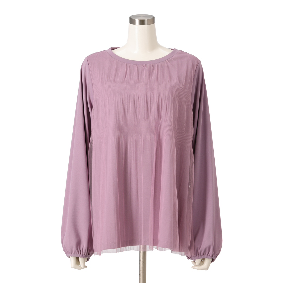 カットジョーゼット素材のプルオーバー。ドライタッチと美しいドレープ感が特徴で、ストレッチがあり楽にご着用いただけます。前身は異素材2重仕立てで、表側をチュール素材にして細かいプリーツを寄せることで立体感があり、華やかな仕上がりです