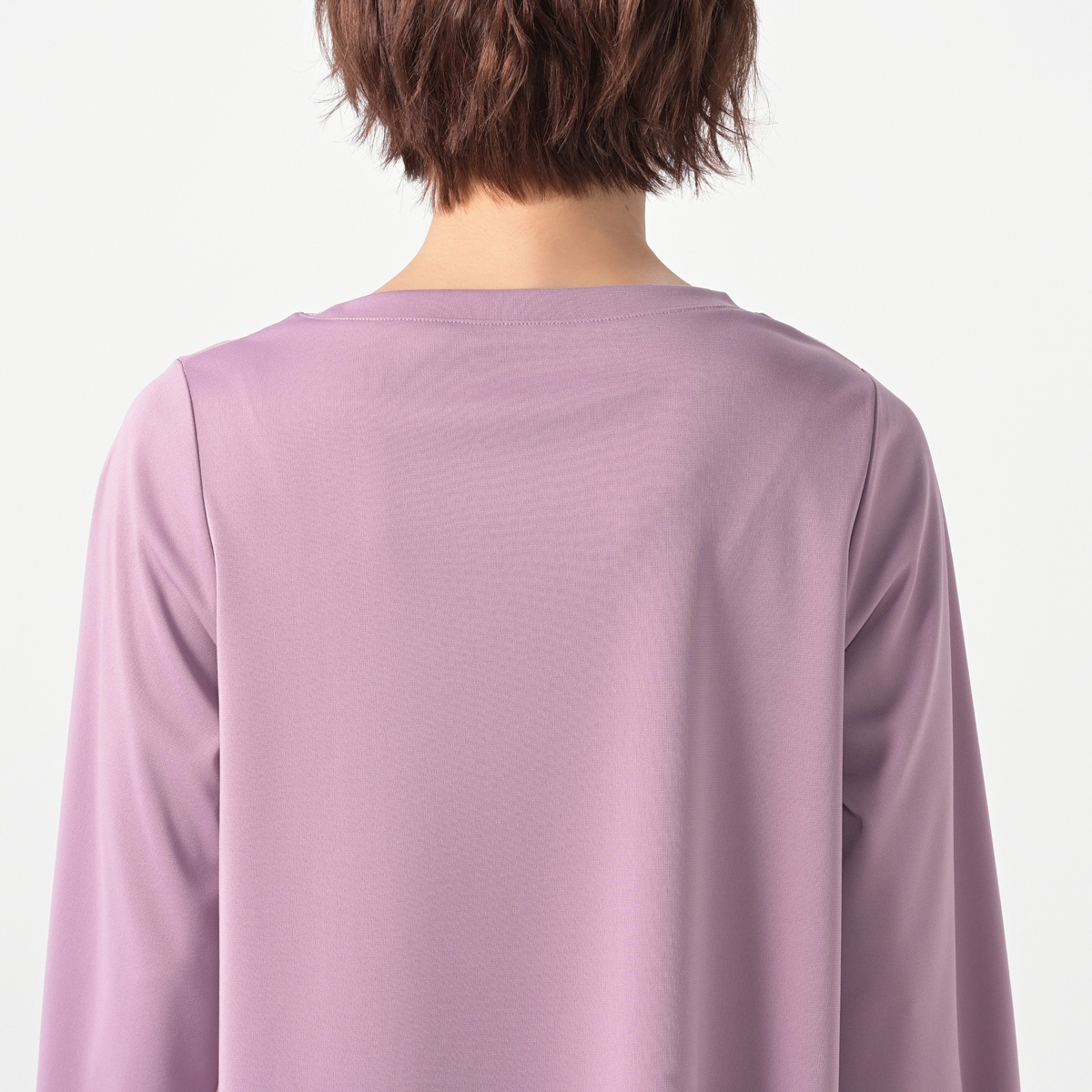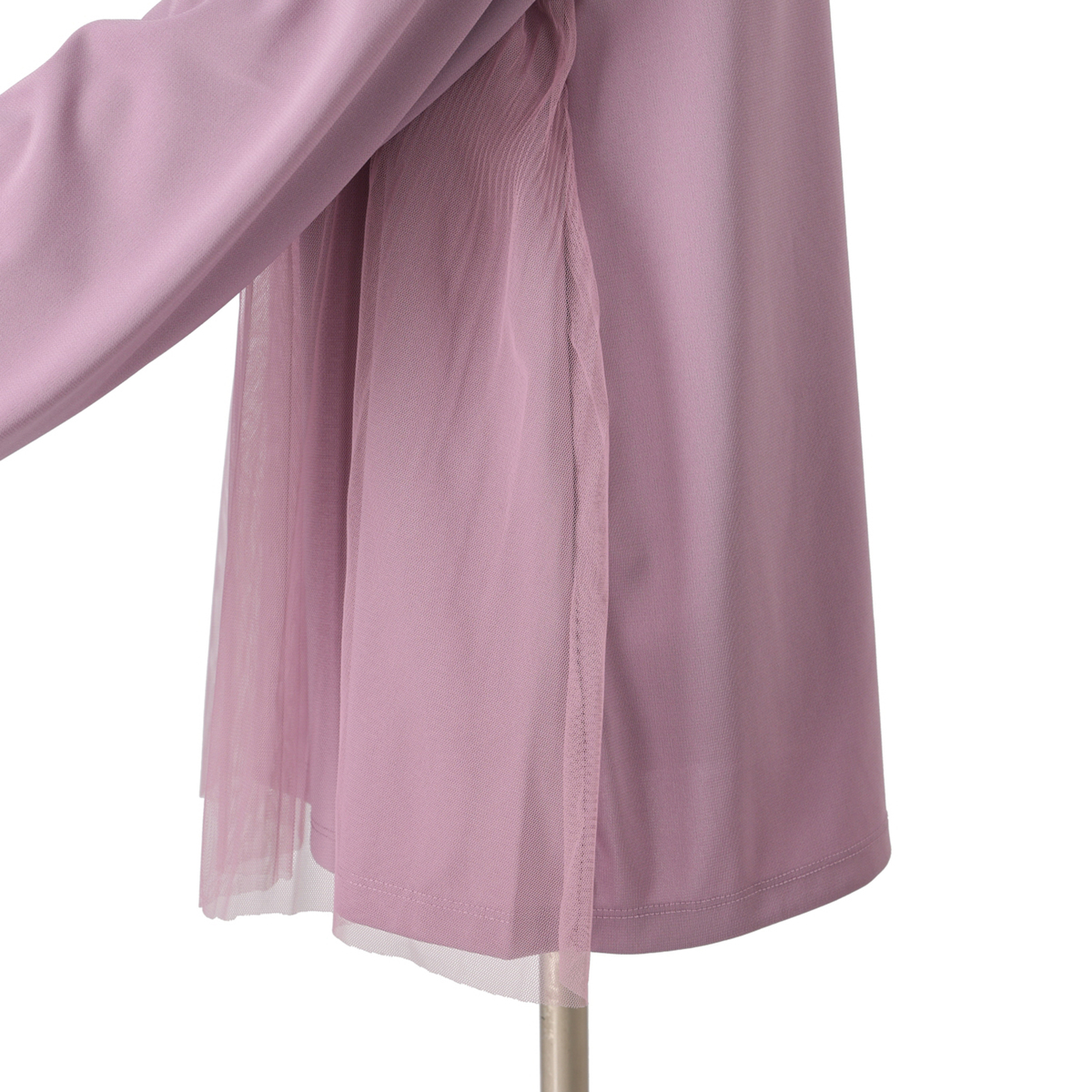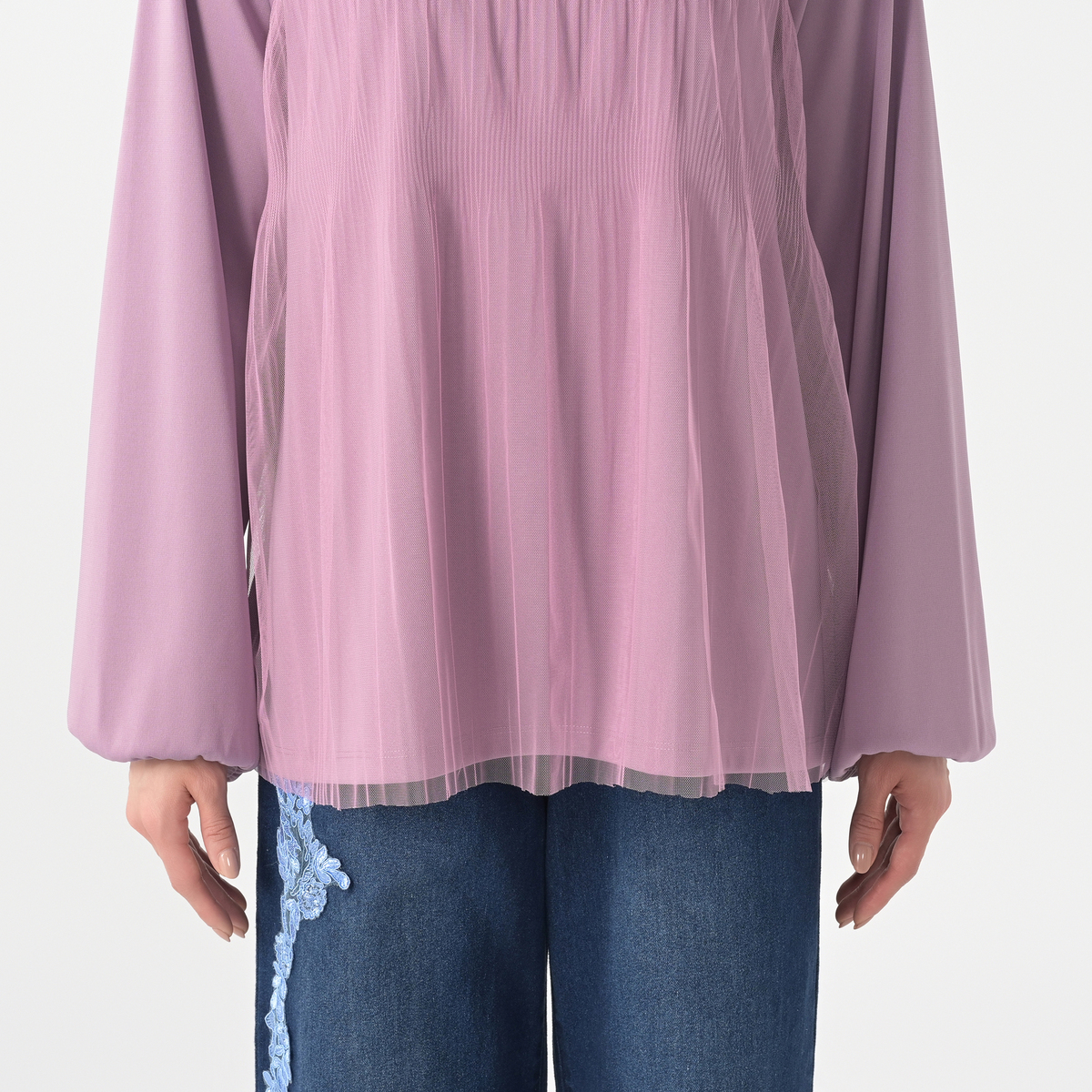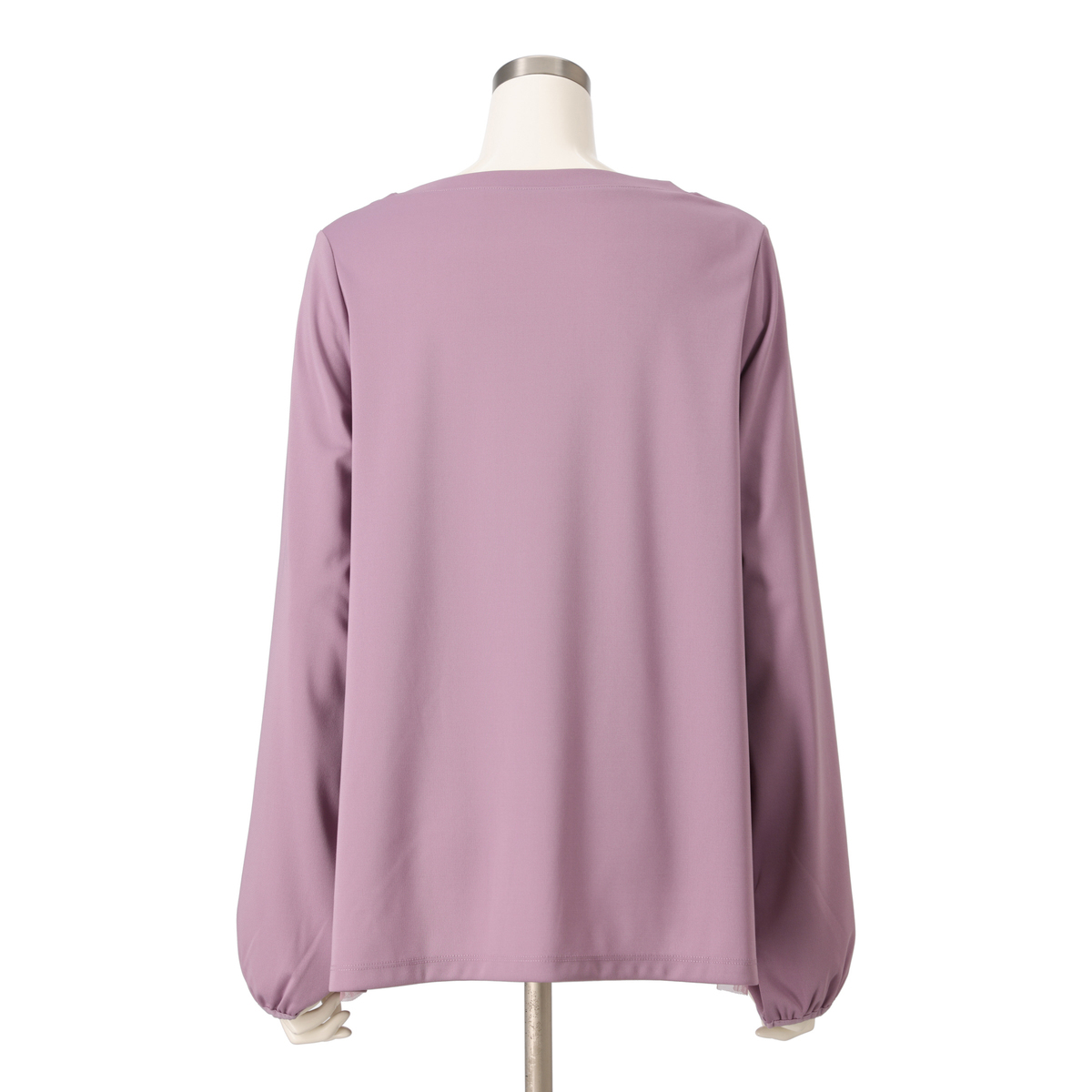 カットジョーゼット素材のプルオーバー。ドライタッチと美しいドレープ感が特徴で、ストレッチがあり楽にご着用いただけます。前身は異素材2重仕立てで、表側をチュール素材にして細かいプリーツを寄せることで立体感があり、華やかな仕上がりです