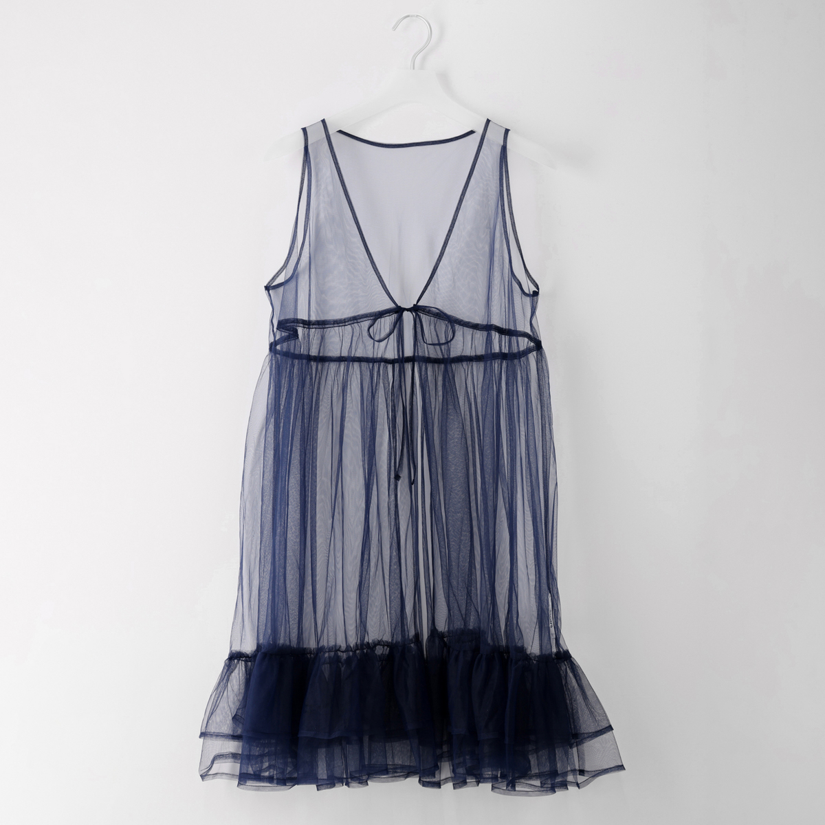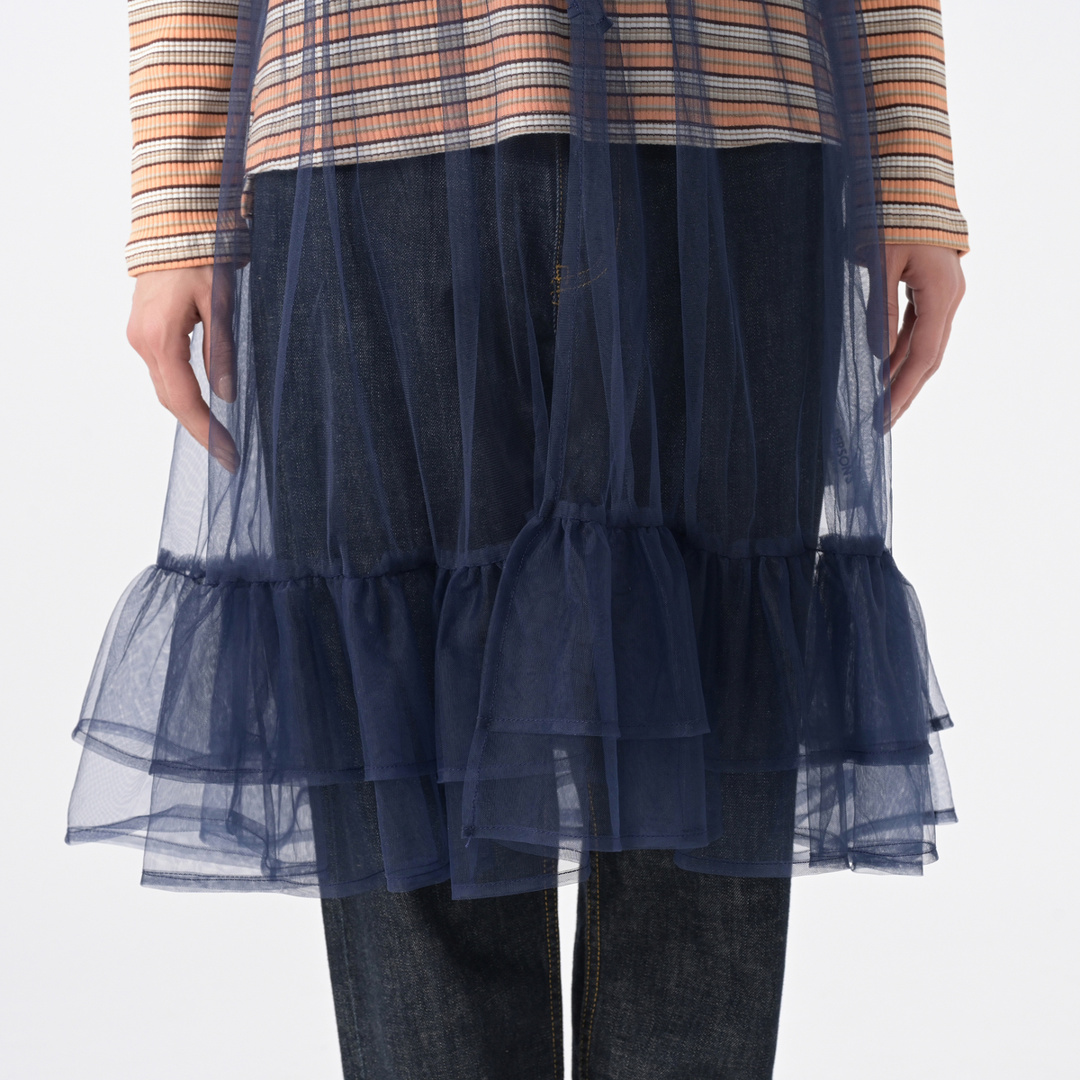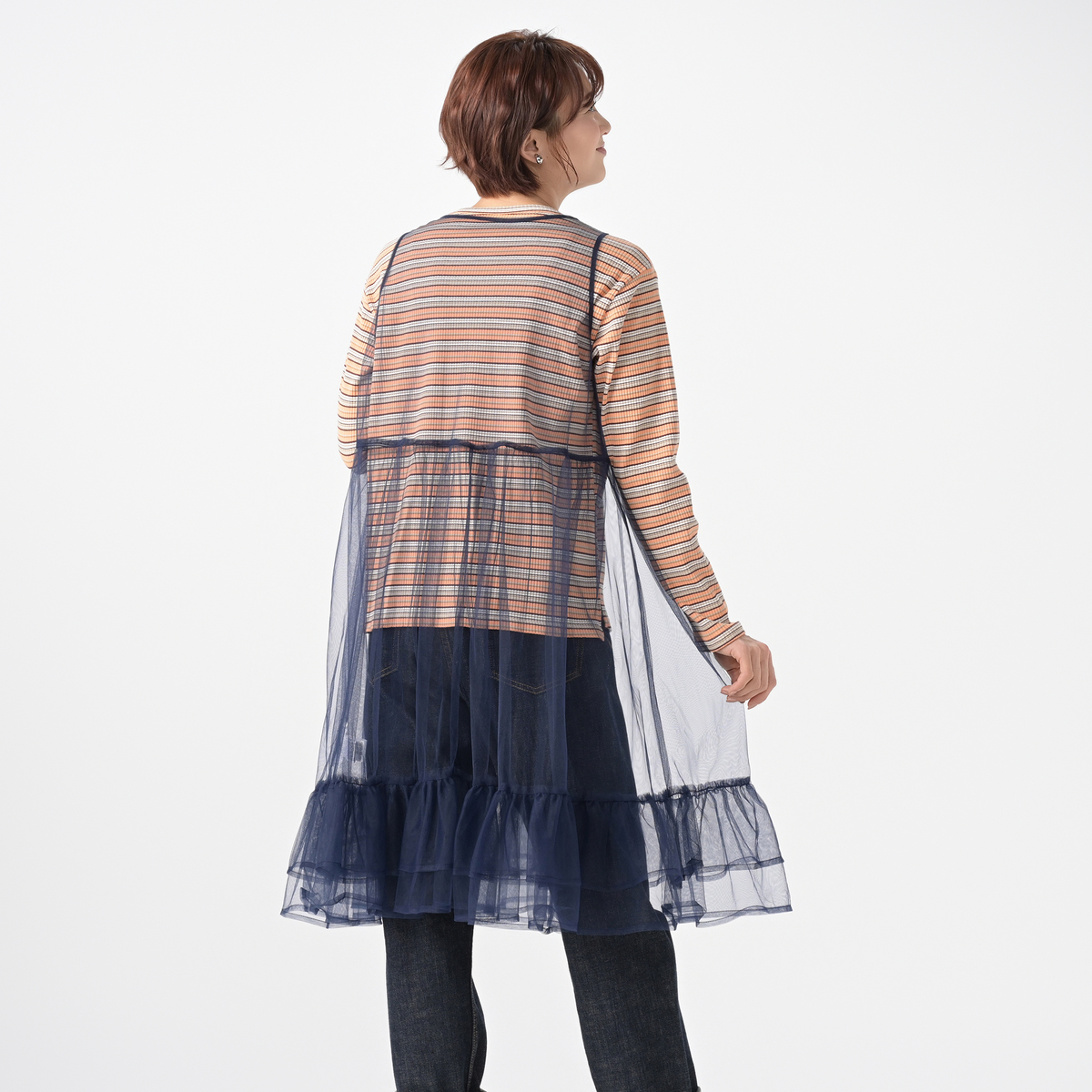 ストレッチ性のあるチュール素材を使用した、膝上丈のロングジレ。着ていることを忘れてしまいそうな、ふわっとした軽い着心地です