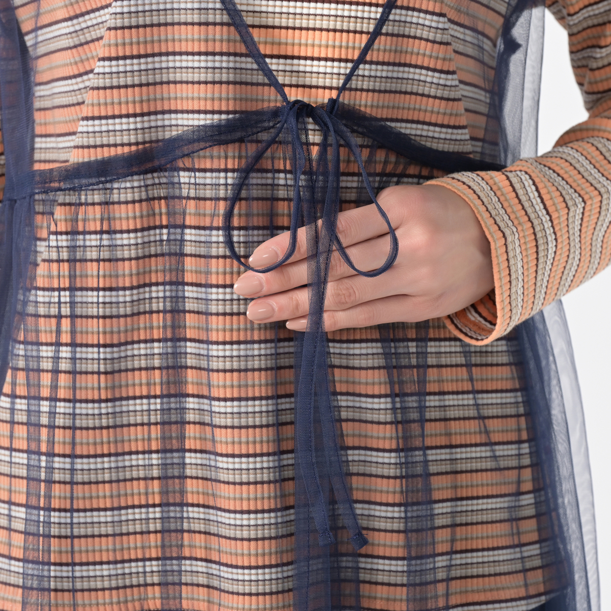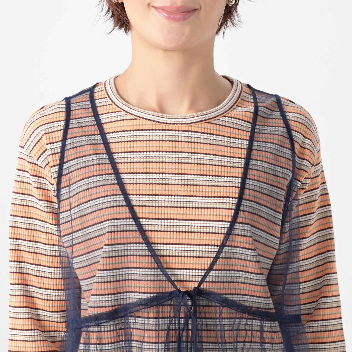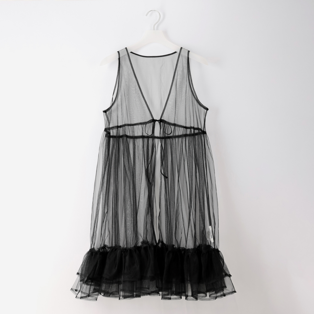 ストレッチ性のあるチュール素材を使用した、膝上丈のロングジレ。着ていることを忘れてしまいそうな、ふわっとした軽い着心地です