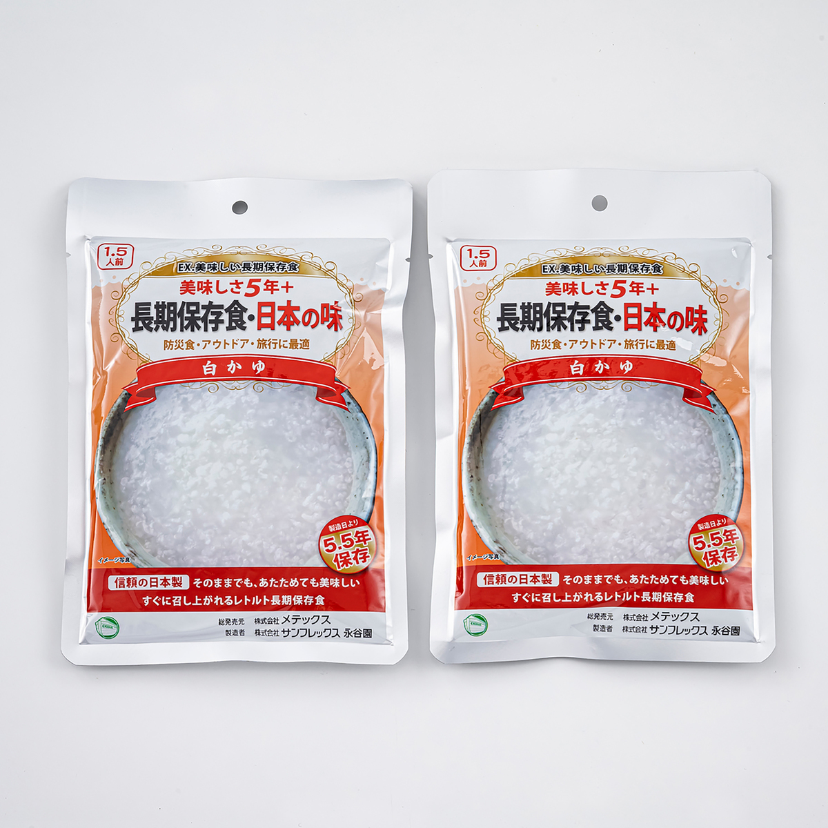賞味期限は下記です。 ●水:製造日より10年 ●白かゆ/ハンバーグ/筑前煮:製造より常温5年半