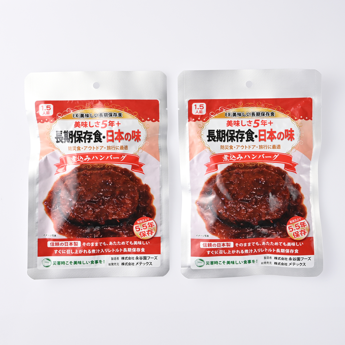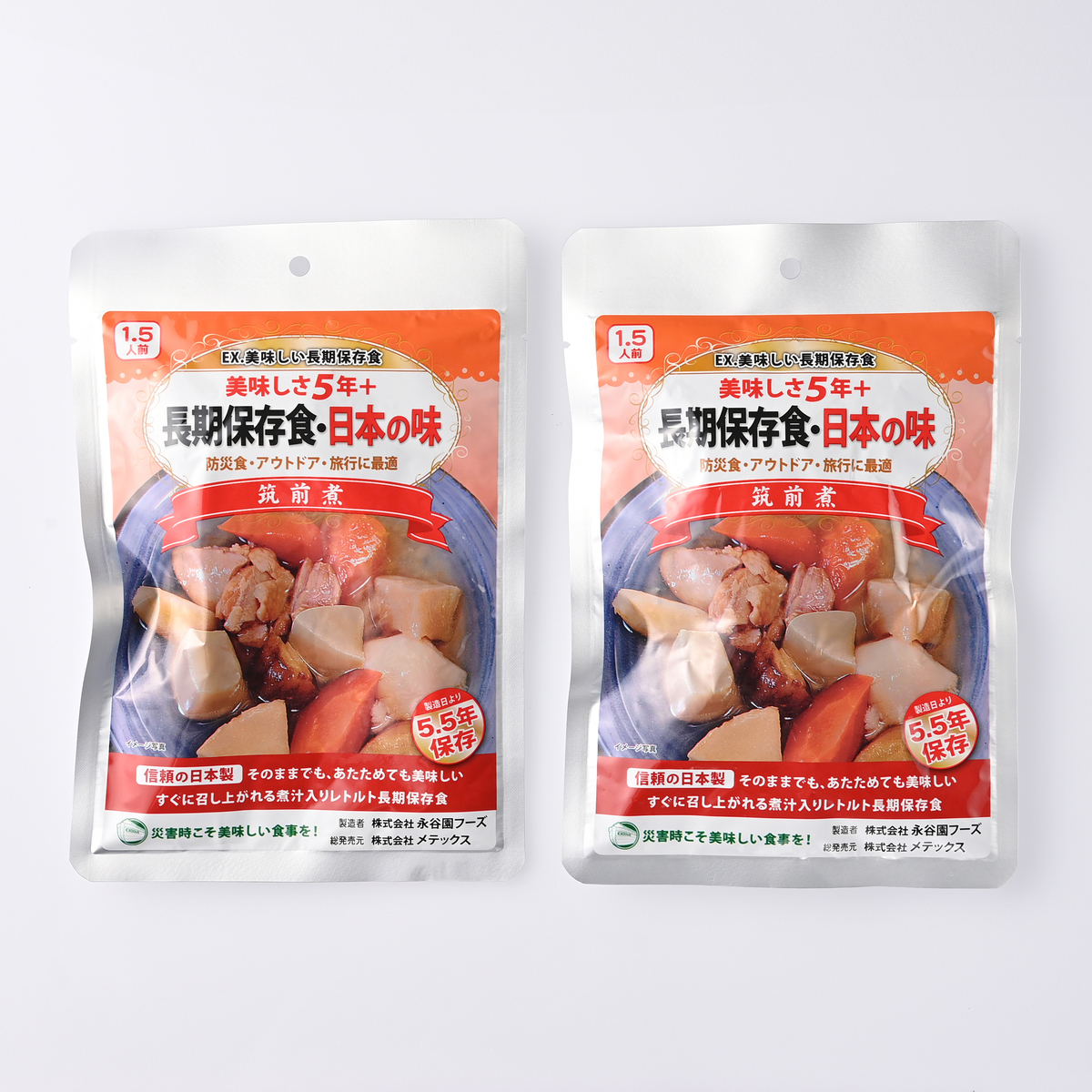 長期保存(*3)できる保存飲料水をはじめ、封を開ければそのままでも食べられるおかゆやハンバーグ、筑前煮をセット。食品を温められる発熱剤や加熱袋も同梱しています。甘味には氷砂糖を用意しました