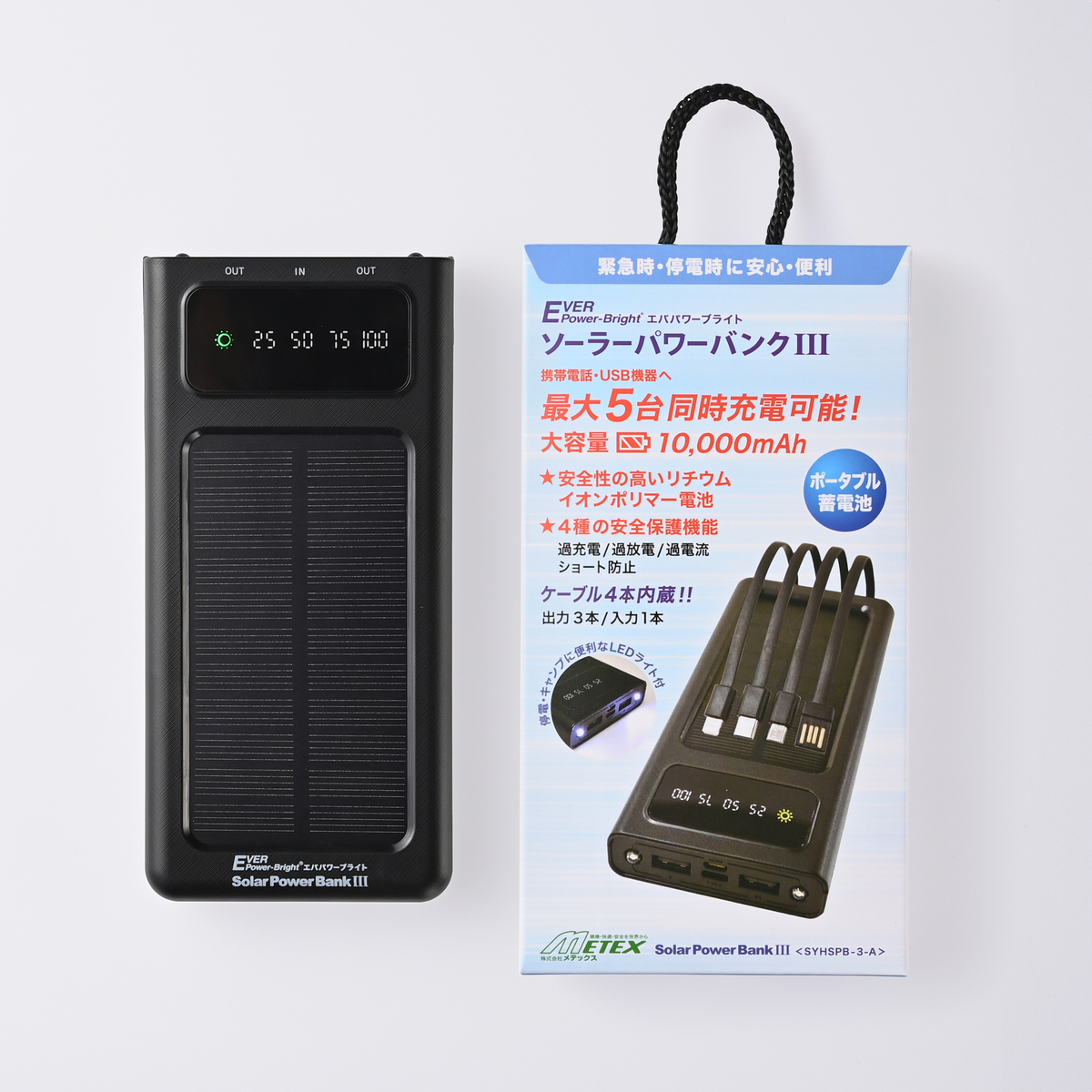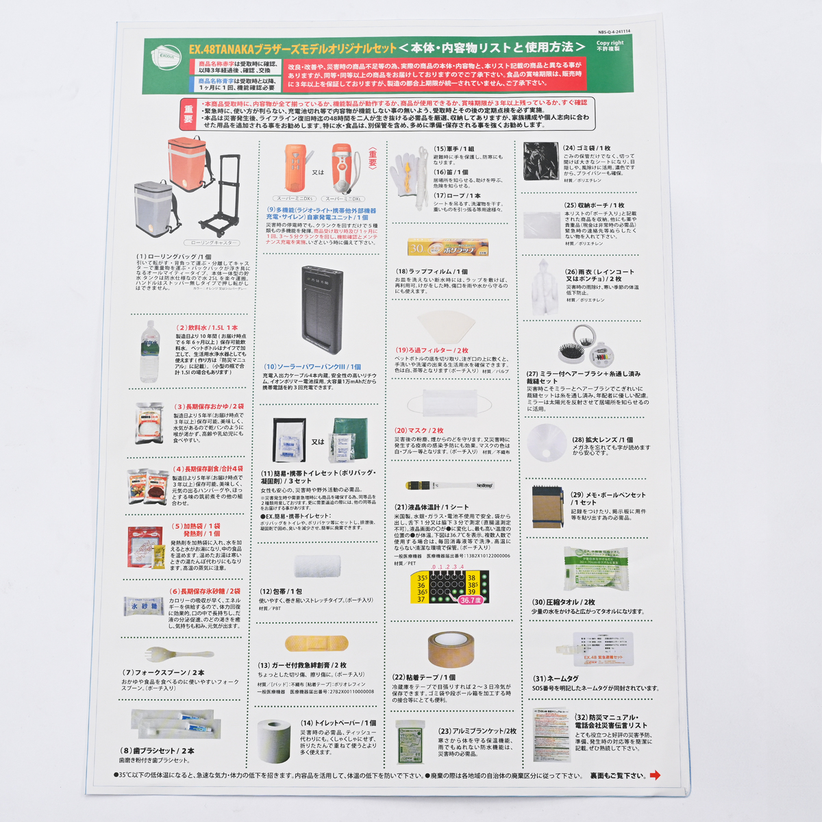 [アレルギー物質特定原材料8品目] 小麦、乳 [商品内容] ローリングバッグ×1、ソーラーパワーバンク3×1、保存飲料水 1.5L×1、おかゆ 250g×2、ハンバーグ 120g(固形量60g)×2、筑前煮 125g×2、氷砂糖 40g×2、多機能自家発電ラジオ・ライト×1、 メモ・ボールペンセット×1、マスク×2、トイレットペーパー×1、簡易トイレセット(3枚入り)×1、歯ブラシセット(歯磨き粉 販売名:SAアクアC)×2、包帯×1、ガーゼ付き救急絆創膏×2、シート型体温計×1、圧縮タオル×2、アルミブランケット×2、収納ポーチ×1、ろ過フィルター×2、粘着テープ×1、軍手×1、ふえ×1、ロープ×1、雨衣×2、ゴミ袋×1、 ミラー付きヘアーブラシ+裁縫セット×1、拡大レンズ×1、ネームタグ×1、加熱袋×1、発熱剤×1、フォークスプーン×2、ラップフィルム×1、内容物一覧×1、防災マニュアル×1 【ライトは「スーパーミニDXーS」か、「スーパーミニDXーL」のいずれかが付属されます】 <ローラーバッグ> [サイズ(約)] 幅35×奥行25×高さ47cm ハンドル引き上げ時高さ:92cm [容量] 最大約31L※運搬時は約25L <救急絆創膏> ■一般医療機器番号 27B2X00110000008 一般的名称 救急絆創膏 販売名 エルモ救急バン <シート型体温計> ■一般医療機器番号 13B2X10122000006 一般的名称 色調表示式体温計 販売名 NexTemp(ネクステンプ)、TraxIt(トラクジット) ■取り扱い説明を充分にご確認の上、ご使用下さい 【中国製、日本製、アメリカ製(保存飲料水、保存食の加工地は日本)】 [注意事項] <ローラーバッグ> ※バッグパックや内容物を火気や高温になるものに近づけない。内容物が入っている時は、出来るだけ温度変化が少なく、直射日光の当たらない場所で保管して下さい ※本モデルのハンドルには高さ調整のストッパー機能はありませんので、押して転がすことはできません。ご使用の際は、ハンドルを最後まで伸ばした状態で、引いて転がしてご使用下さい ※非常時で急いでいる時以外は、階段やエスカレーターを昇り降りする時は、バッグパック本体の取っ手を持って、バッグパックを持ち上げて昇り降りして下さい。又、ハンドルを引っ張って転がして昇り降りしないで下さい <白かゆ、ハンバーグ、筑前煮> ※開封後は保存ができませんので必ず使い切って下さい <ハンバーグ> ※本商品の製造ラインでは、卵、さば、鶏肉、やまいも、りんご、ゼラチンを含む商品を生産しています <貯水タンク(バックパック内蔵)> ※貯水タンクとバッグパックの内装材は食品仕様ではありませんから、飲料水や包装されていない食品などの長期保存には適していません。又、貯水タンクに溜めた水は飲用以外の生活用水としてだけご使用下さい <加熱袋> ※発熱剤は吸湿すると加熱性能に影響しますので開封後は1時間以内にご使用下さい ※水を加えるとすぐに加熱がはじまり蒸気穴から約98度の蒸気がでますのでヤケドには特に注意して下さい ※加熱中は動かしたり、持ち歩いたりしないで下さい。又、熱に弱い物の上や近くでは使用しないで下さい ※作動してしまう場合がございますので火災報知機のお近くではご使用にならないで下さい <発熱剤> ※発熱剤の外袋はきりくちにそって開封し、水の計量カップに使用しますので捨てないで下さい ※使用環境温度が概ね5℃以下では発熱反応が遅延する(5分以上かかる)場合があります。またあらゆる環境下で加熱できることを保証するものではありません ※発熱剤を分解したり、粉だけでの使用は絶対にしないで下さい ※アルミ袋開封後は1時間以内にご使用下さい ※発熱剤は濡れた手で触るとやけどします。また水を注ぐと直ちに発熱し、高温の蒸気が発生しますので注意して下さい [原材料] 保存飲料水:水(湧水) 白かゆ:うるち米(国産)、食塩 ハンバーグ:ハンバーグ(食肉(牛肉、豚肉)、玉ねぎ、パン粉、ラード、粒状大豆たん白、醤油、食塩、砂糖、焼酎、ビーフエキス、胡椒)(国内製造)、炒め玉ねぎ、砂糖、トマトペースト、醤油、食塩、オニオンペースト、胡椒、タイム、シナモン、クローブ/調味料(アミノ酸等)、加工でん粉、糊料(加工でん粉)、リン酸塩(Na)、カラメル色素、(一部に小麦・乳成分・牛肉・大豆・豚肉を含む) 筑前煮:野菜(さといも(中国産)、人参、たけのこ、ごぼう)、鶏肉、こんにゃく、植物油脂、みりん、醤油、砂糖、食塩、昆布粉、鰹節粉/調味料(アミノ酸等)、(一部に小麦・大豆・鶏肉を含む) 氷砂糖:砂糖(国内製造) [成分] 歯ブラシセット:歯磨き粉: 炭酸Ca、ソルビトール、水、含水シリカ、ラウリル硫酸Na、香料、セルロースガム、ベンジルアルコール、ヒドロキシエチルセルロース、サッカリンNa、リン酸3Na