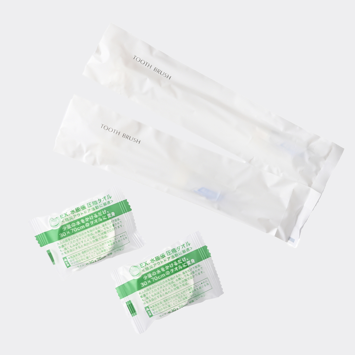 目隠しや風除けにも活用できるゴミ袋や、水に浸すと自然に膨張し、ほぐすとタオルになる圧縮タオルも入っています