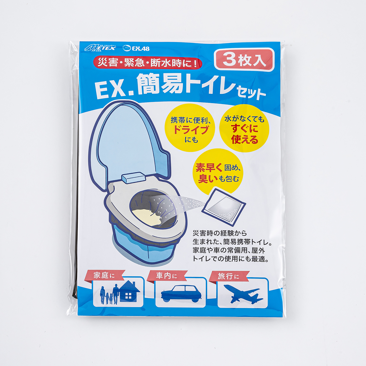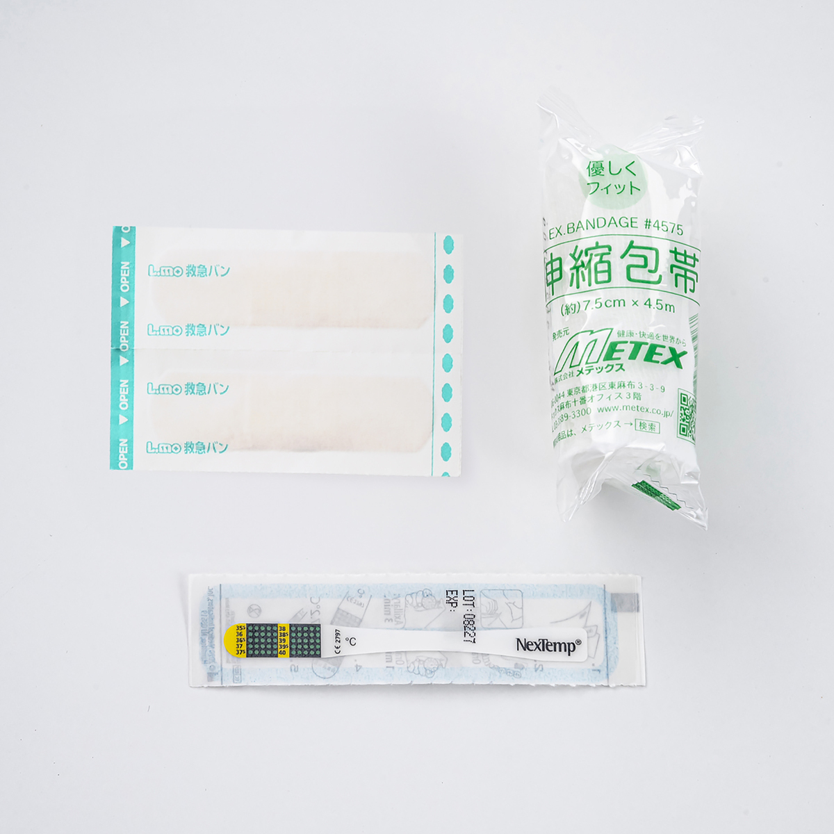 ちょっとした擦り傷や切り傷に便利なガーゼ付き救急絆創膏や包帯、トイレットペーパーも。簡易トイレセットは凝固剤でゼリー状に固め、臭いを包みます