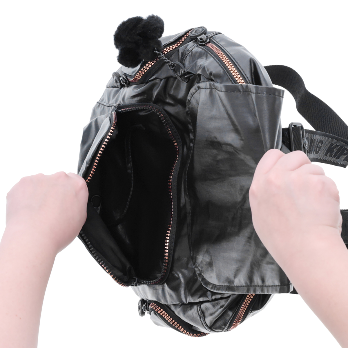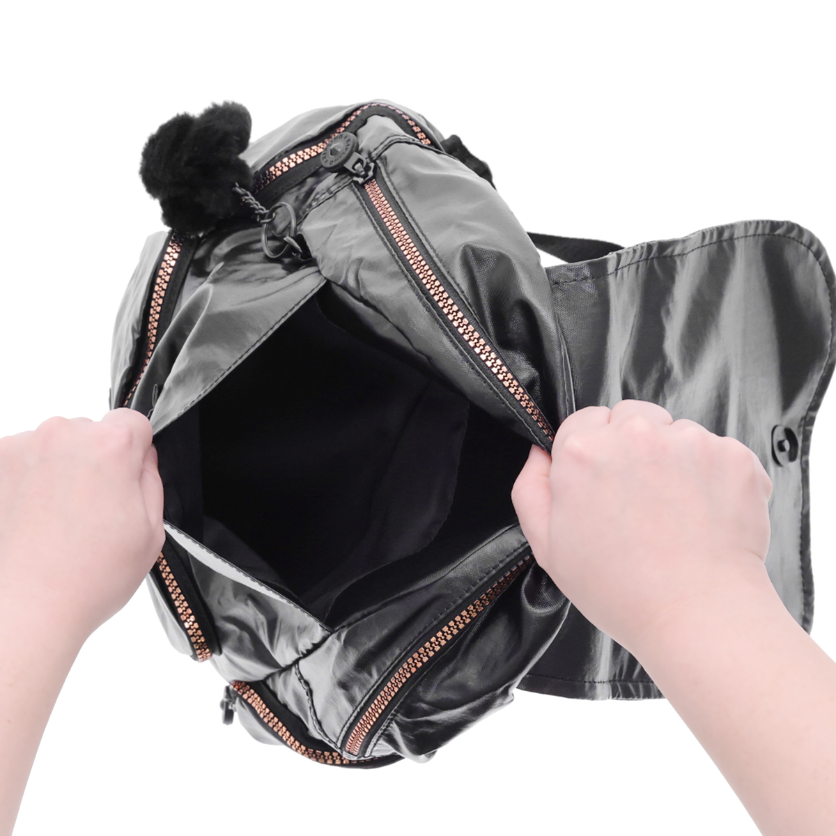 メインの開閉口が見えないかぶせ蓋。蓋部分から底に向けて奥行がだんだん広くなるかまぼこ型のマチ付で、見た目以上の収納力に。全方向にそれぞれ異なるポケット付きで、小物を整理して収納できます