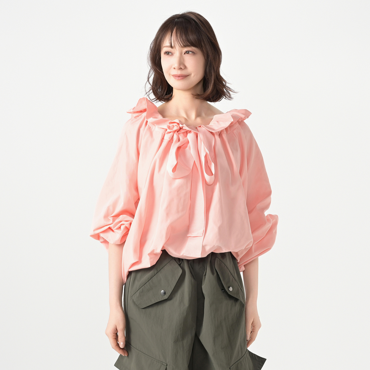 落ちの良いポリエステル素材で仕立てたギャザリングラッフルブラウス。ラグランスリーブとふんわりとしたパフスリーブが、フェミニンな魅力を引き立てるデザインです。衿ぐりにはグロランテープが通してあり、お好みに合わせて開き具合の調節ができます