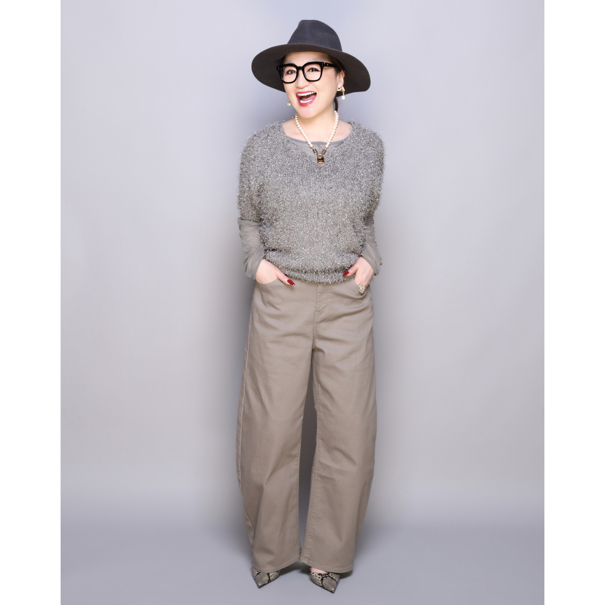 分量感を少し抑え、膨張し過ぎないようにしました。着やすいヒップトップ丈で、フェミニンなシルエットに。袖口と裾はリブで、プッシュアップも可能な設計です