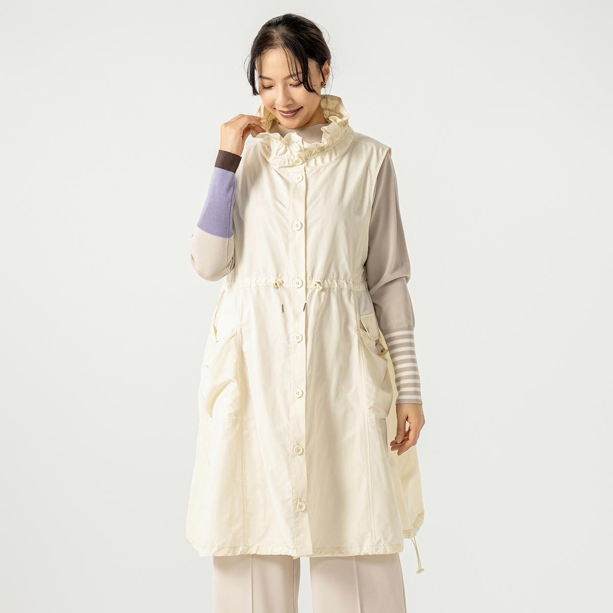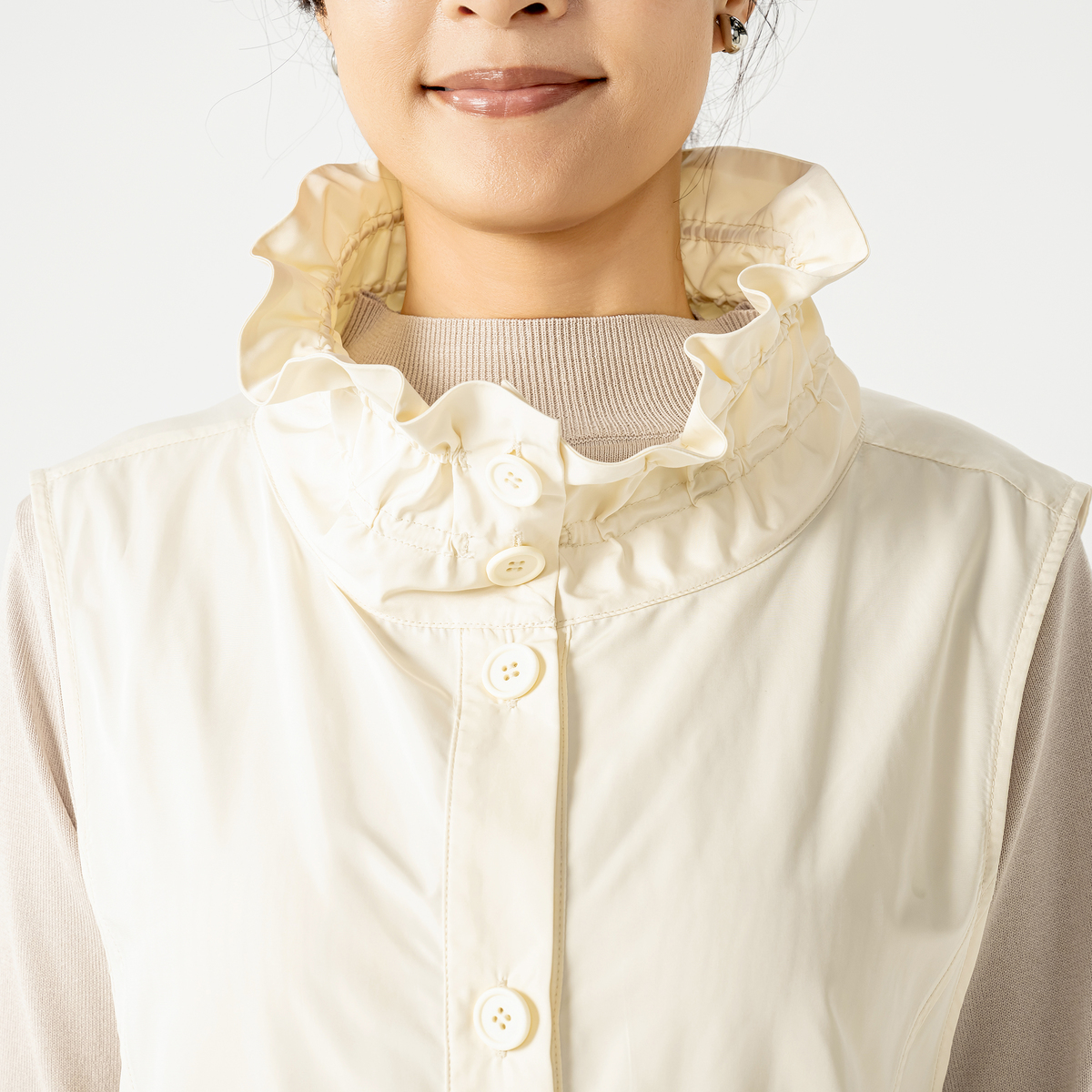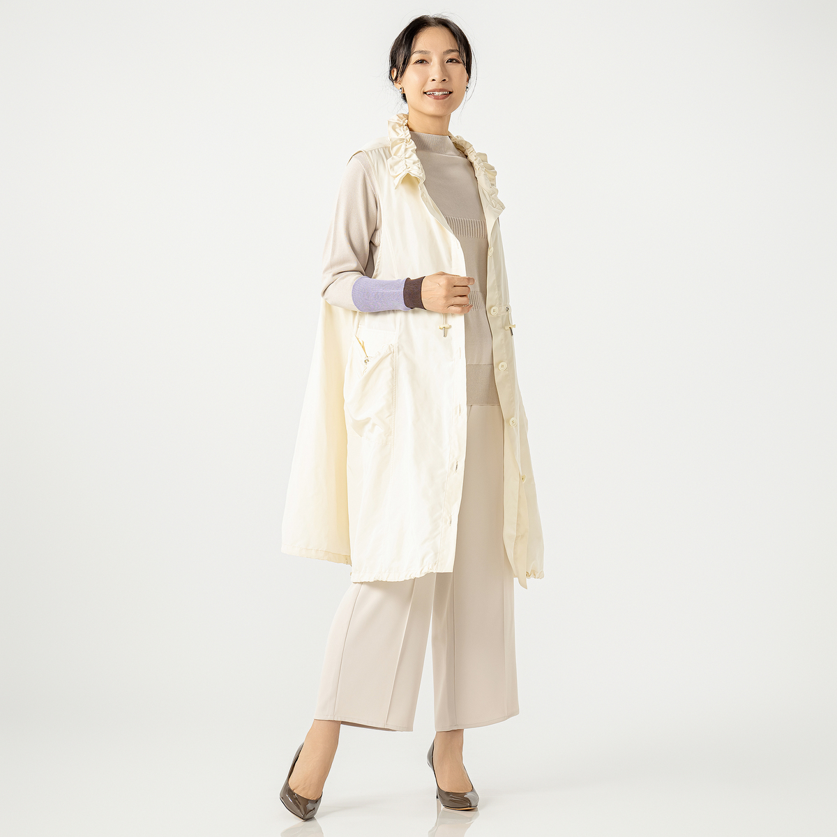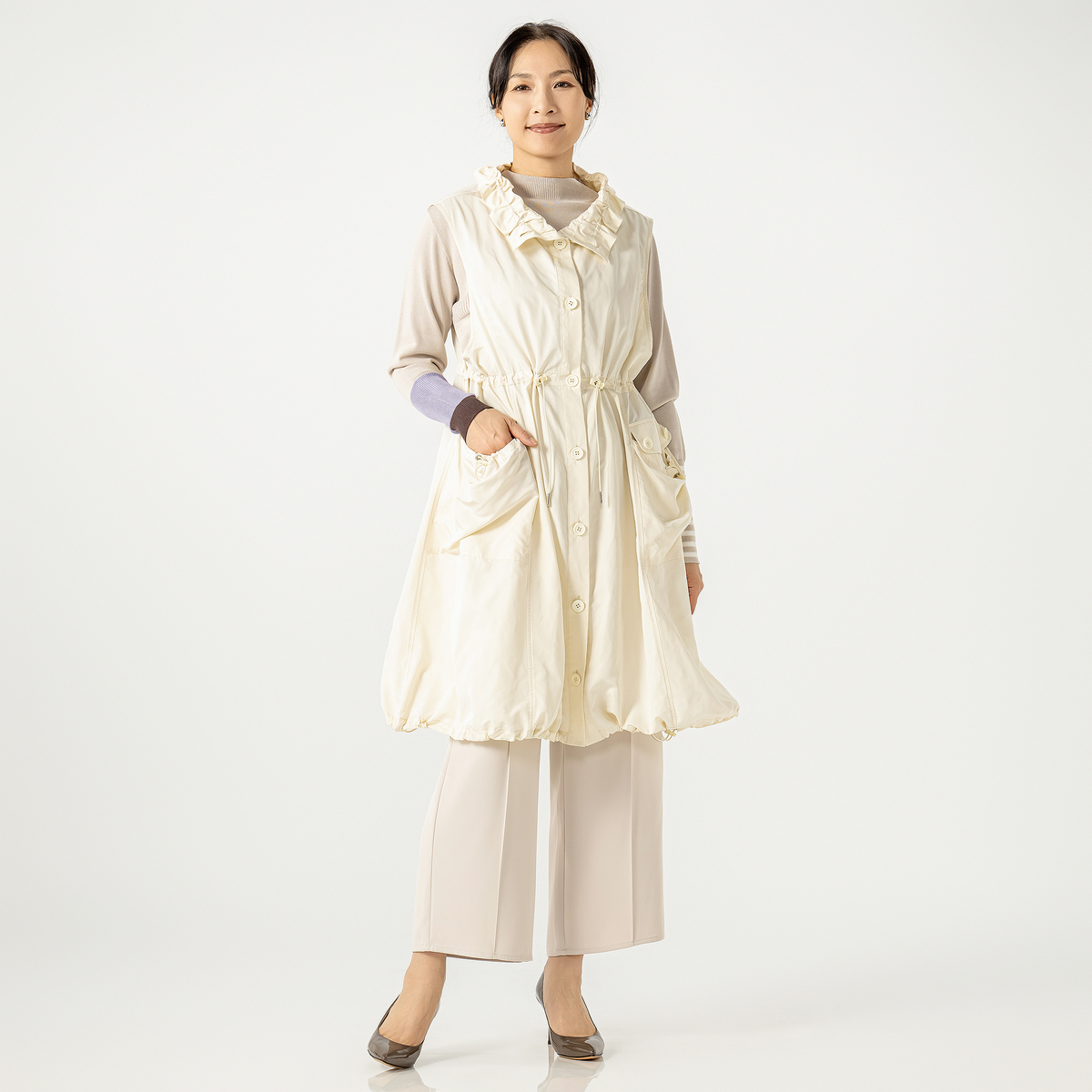 サッと羽織れて体型を隠してくれるジレです。前立てのボタン数を増やし縦のIラインを強調して細見え効果を狙いました。衿を大きくして小顔効果を狙い、ギャザーで首隠し効果と寒さ除けのデザイン。衿は折り曲げてもサマになります