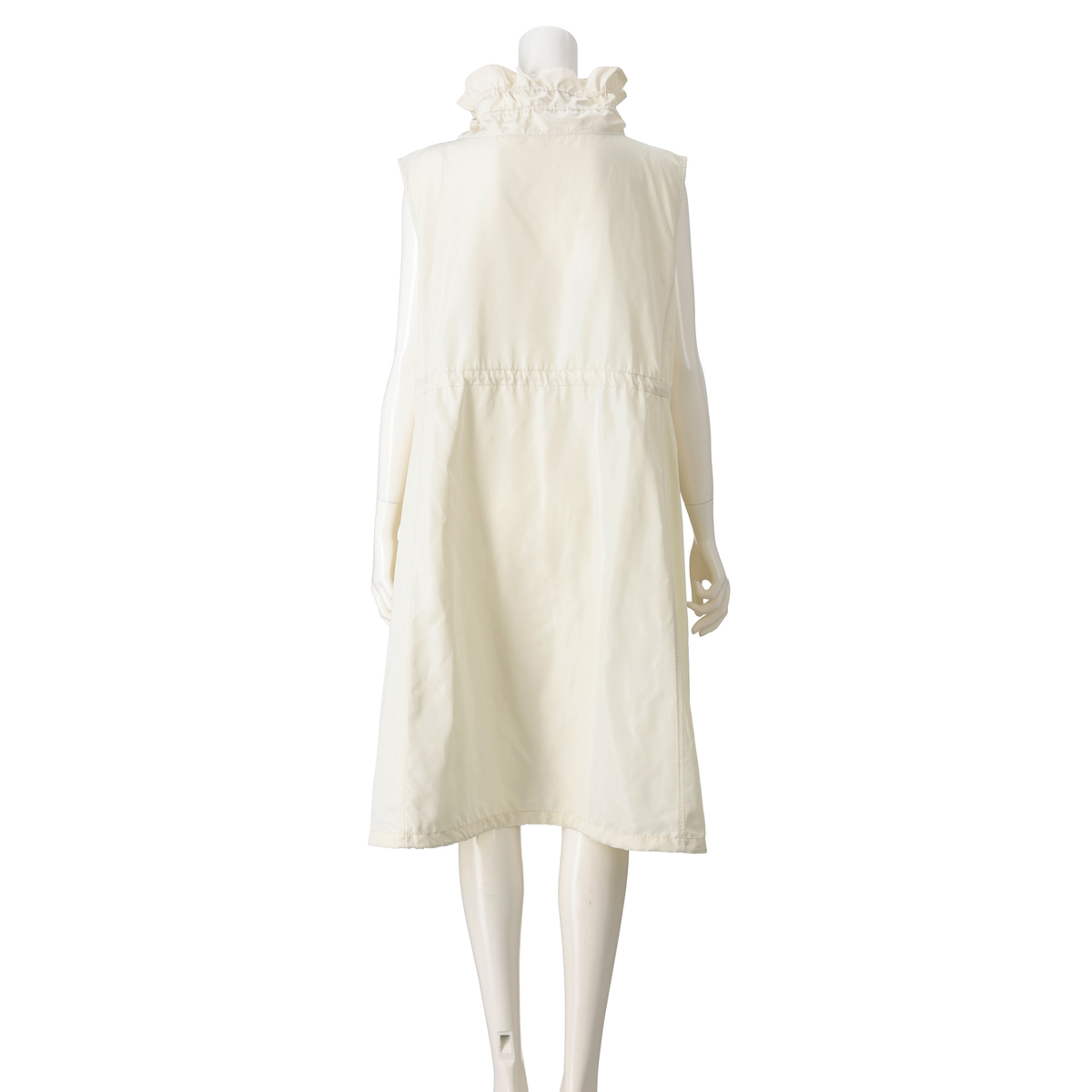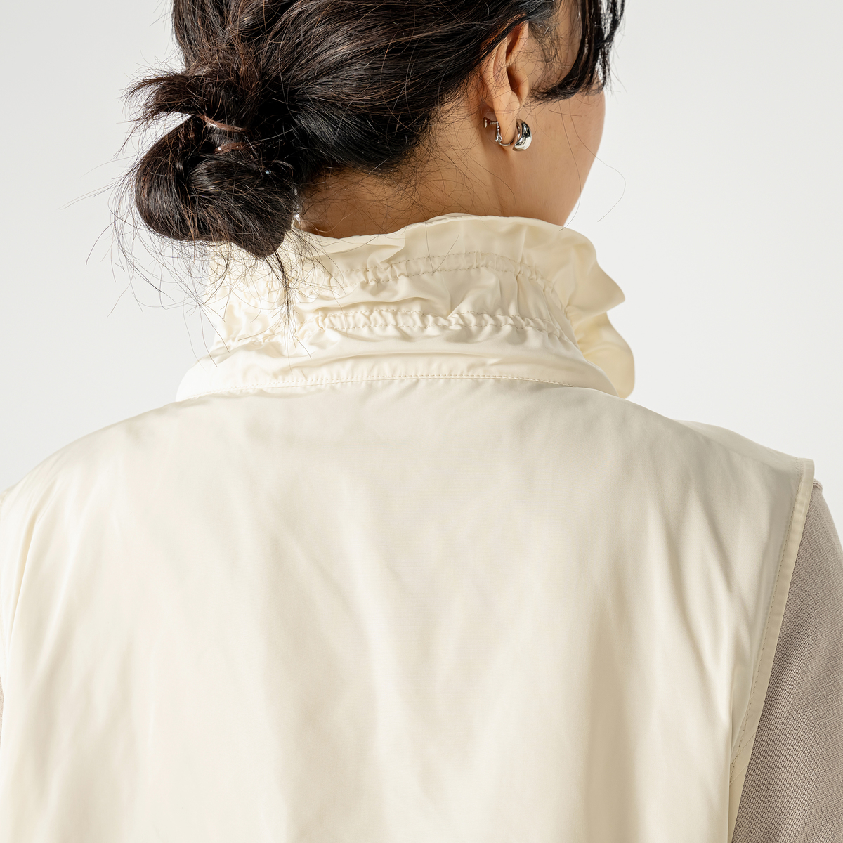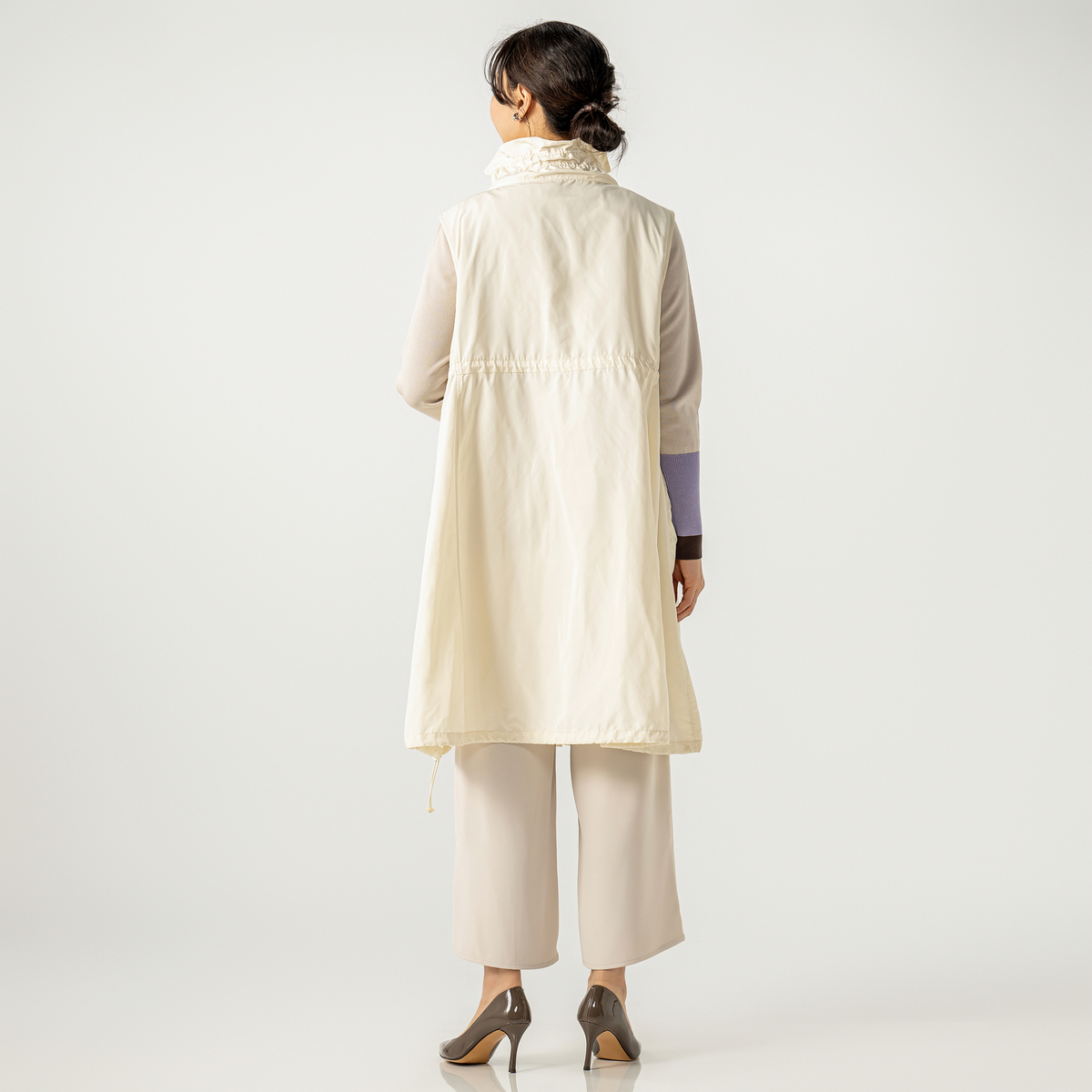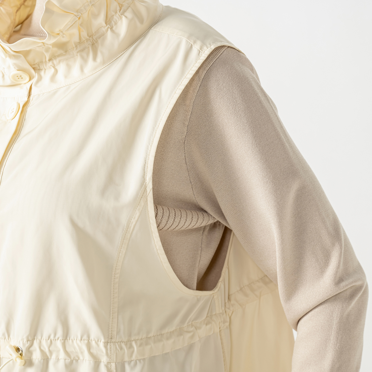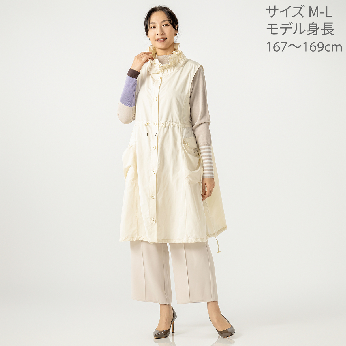 サッと羽織れて体型を隠してくれるジレです。前立てのボタン数を増やし縦のIラインを強調して細見え効果を狙いました。衿を大きくして小顔効果を狙い、ギャザーで首隠し効果と寒さ除けのデザイン。衿は折り曲げてもサマになります