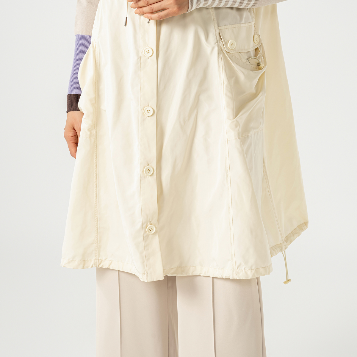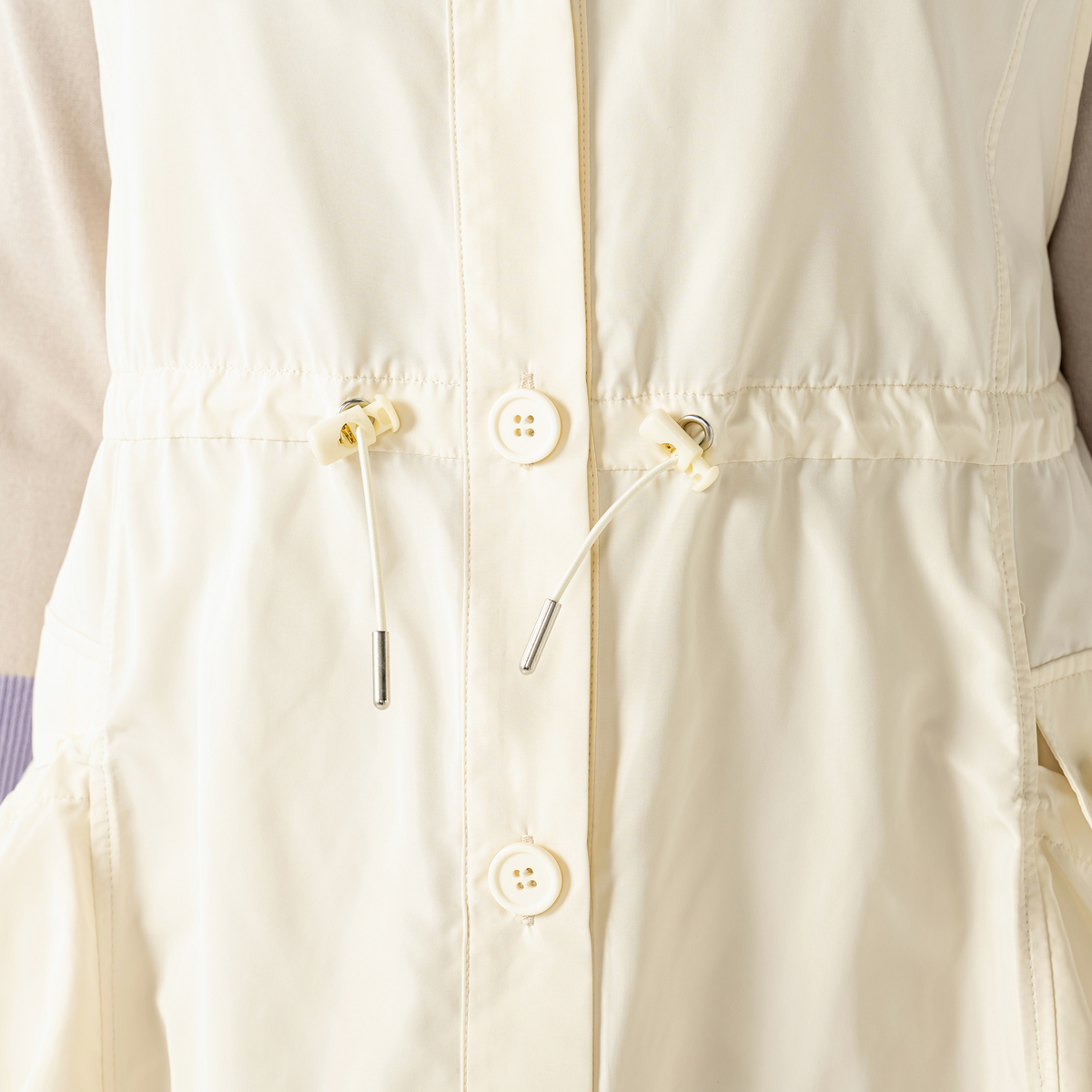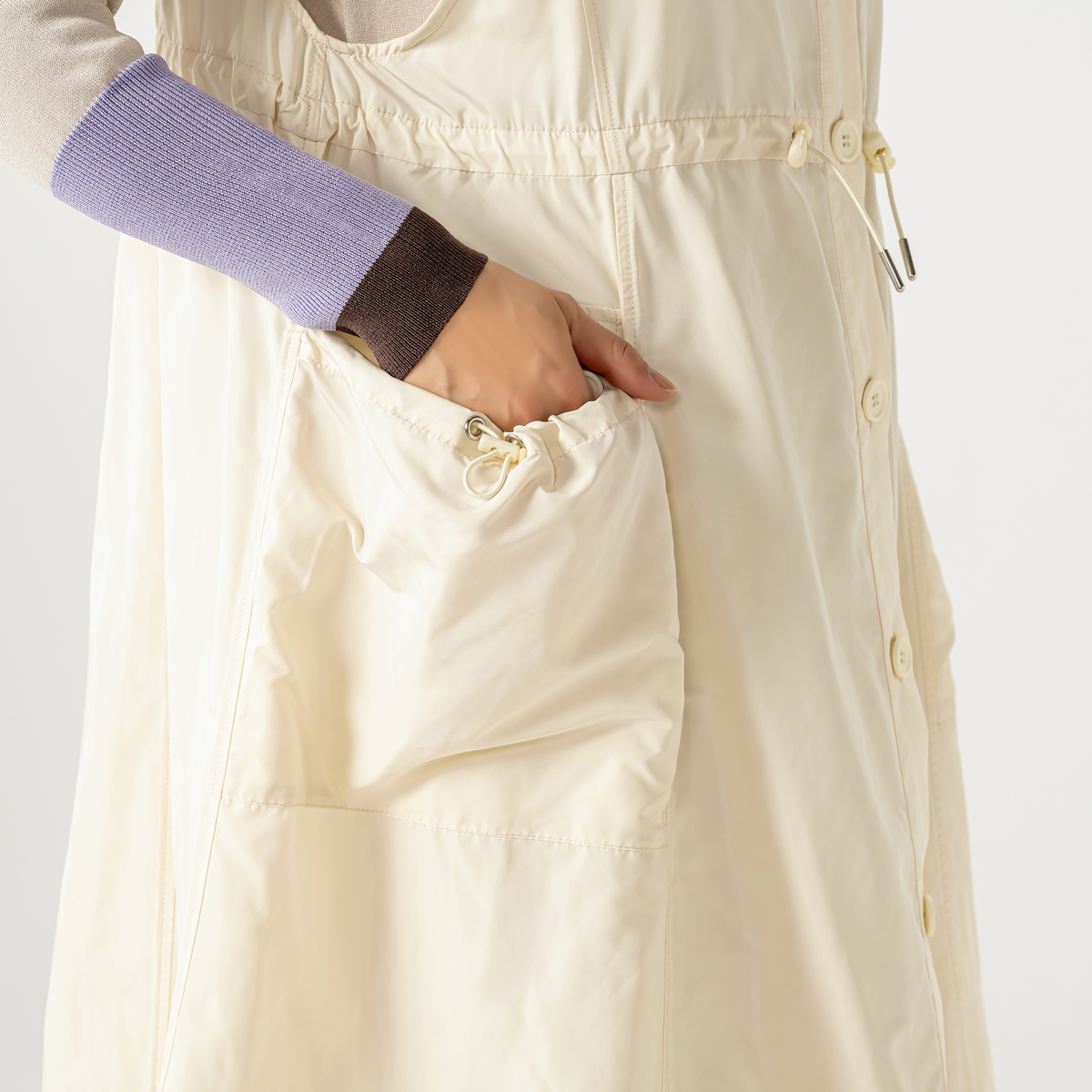 広めのアームホールは、前後左右にパネル線を入れてきれいに見えるパターンに。ポケットはお財布やスマホ、鍵などが入りやすい大きめサイズです。ポケット口にはゴム&ストッパーを付け、中身が落ちない工夫をしました。ウエストと裾はドロスト仕様でギャザーを寄せてシルエットを変えられます
