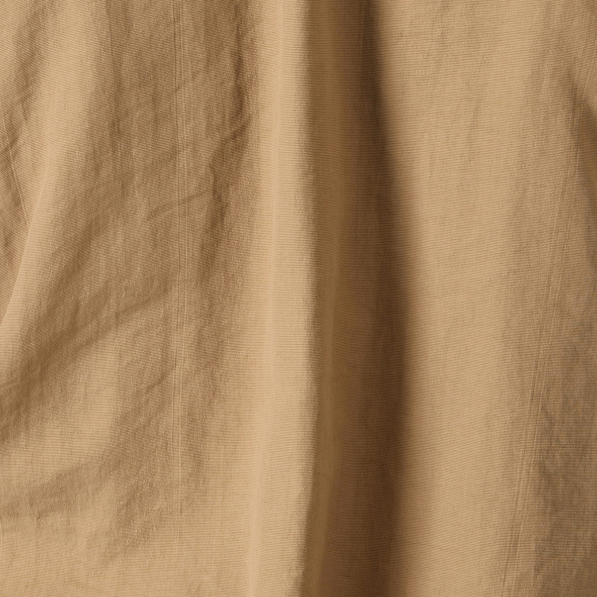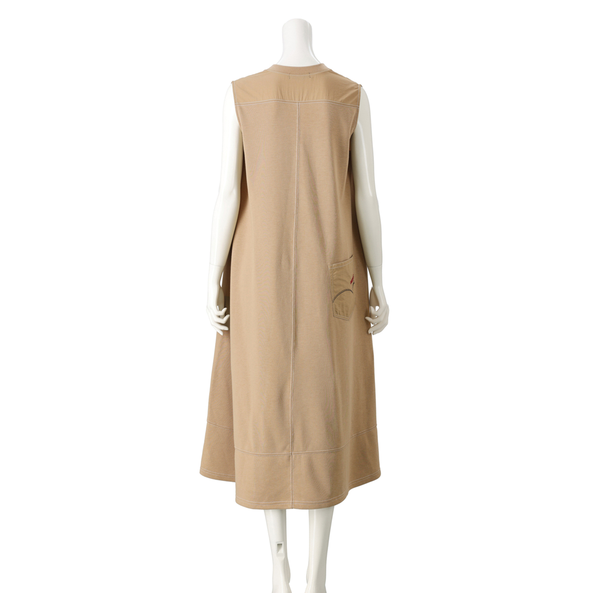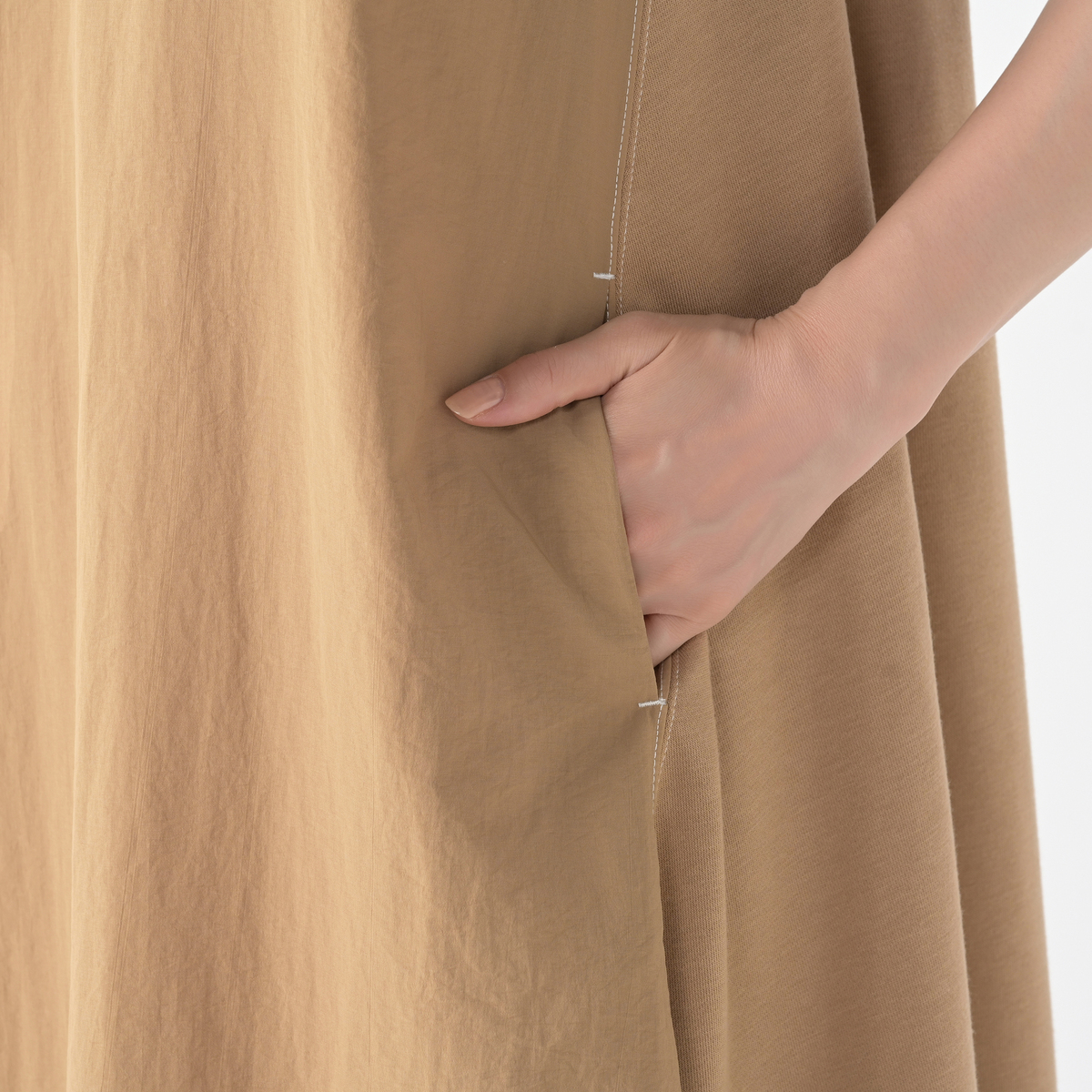 前身頃にヴィンテージ感のあるワッシャータイプのタフタ素材を使用。ナイロン100%で軽く、撥水効果もある生地を使ったワンピースです。後ろ身頃はポリエステル綿混のミニ裏毛で、前後で素材のコントラストを付けてデザインしました