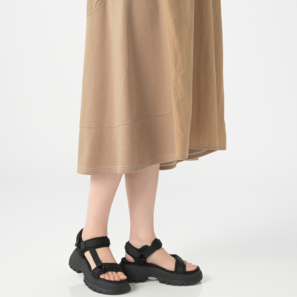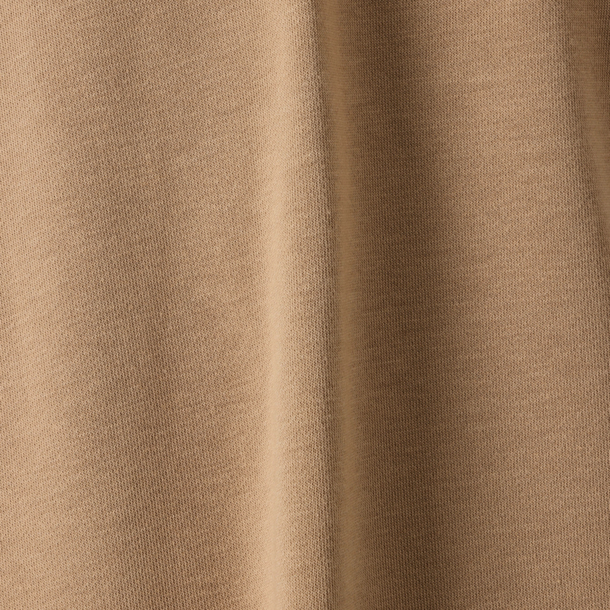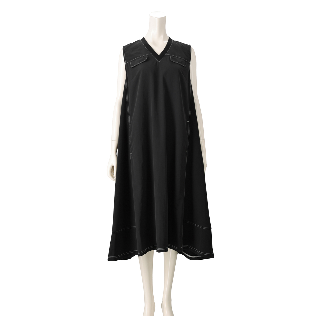 前身頃にヴィンテージ感のあるワッシャータイプのタフタ素材を使用。ナイロン100%で軽く、撥水効果もある生地を使ったワンピースです。後ろ身頃はポリエステル綿混のミニ裏毛で、前後で素材のコントラストを付けてデザインしました