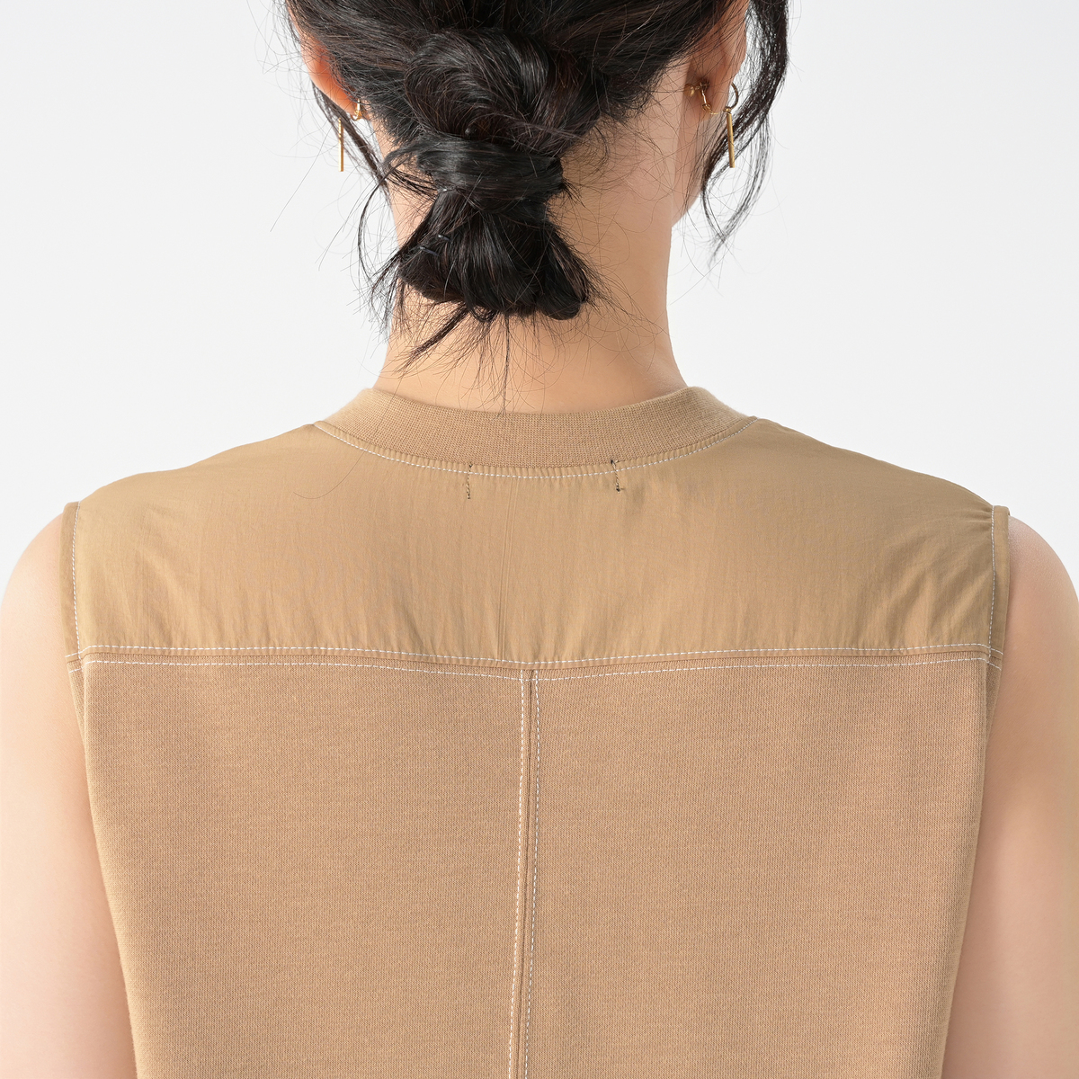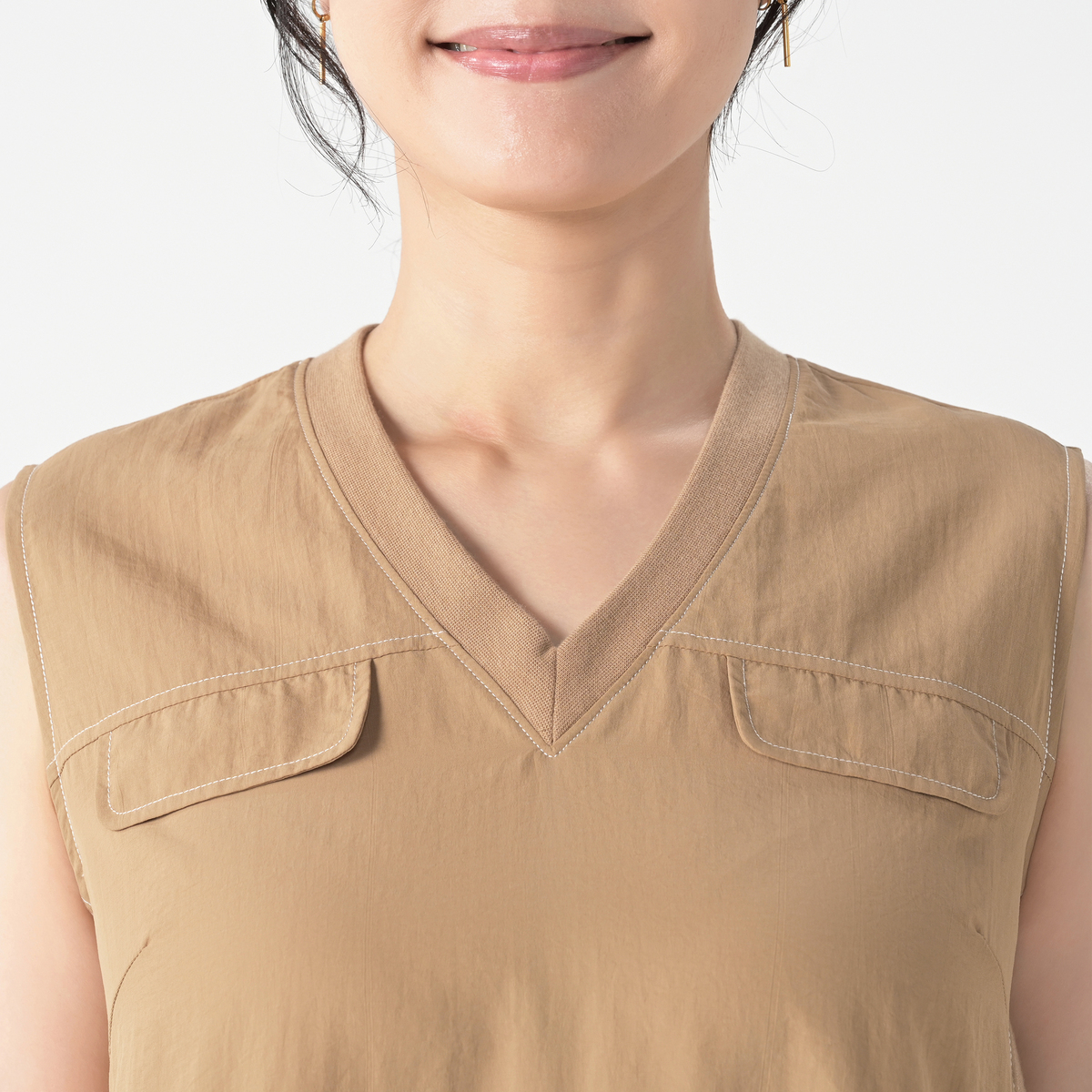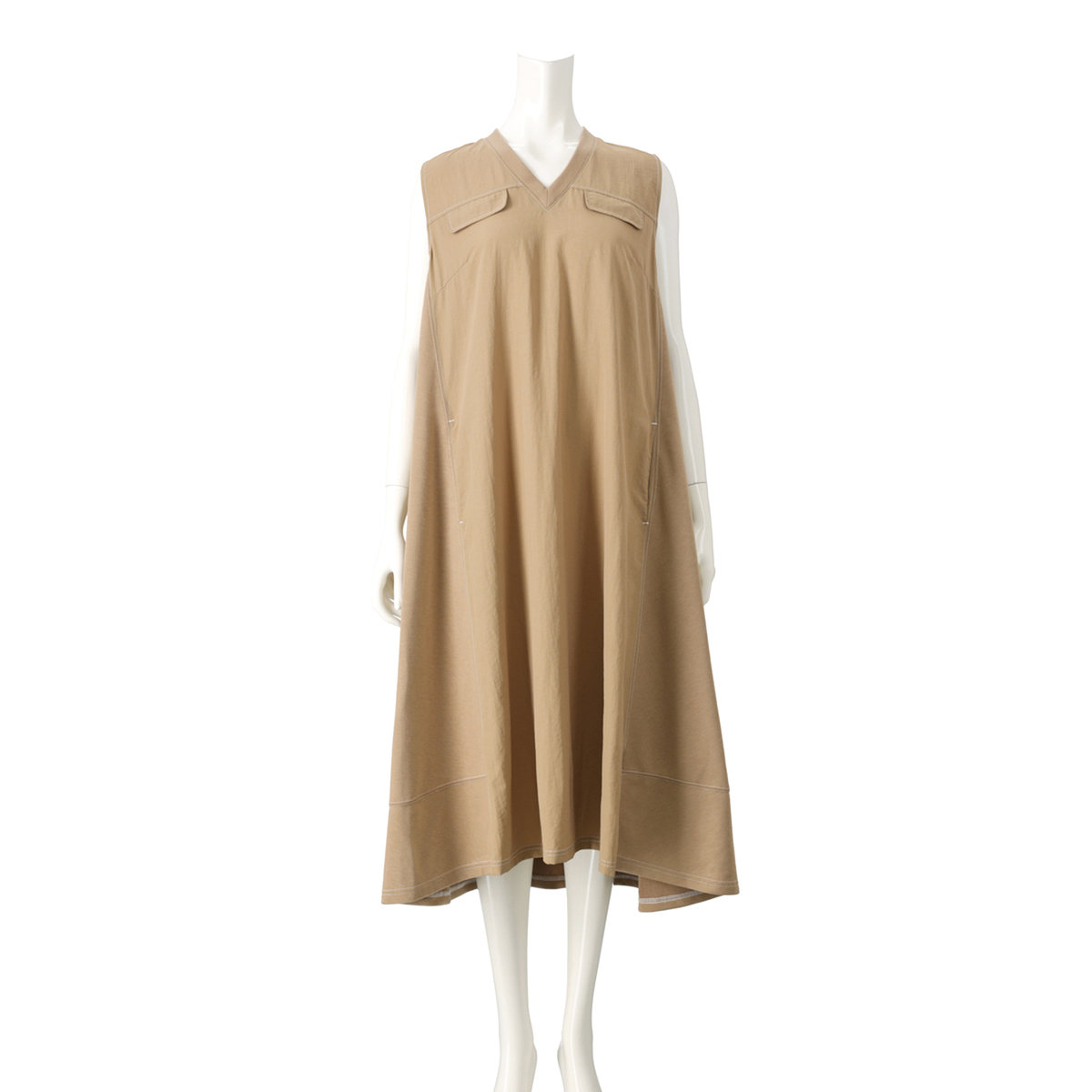 シャープなVネックが小顔効果を演出しながら、胸の切替にフェイクポケットを付けることでサファリ感覚の印象に。あえてホワイトにしたステッチが上品で、脇の切替線を前にずらすことで細見え効果を演出しています。後ろポケットにはブランドロゴを入れました