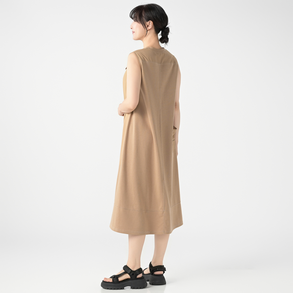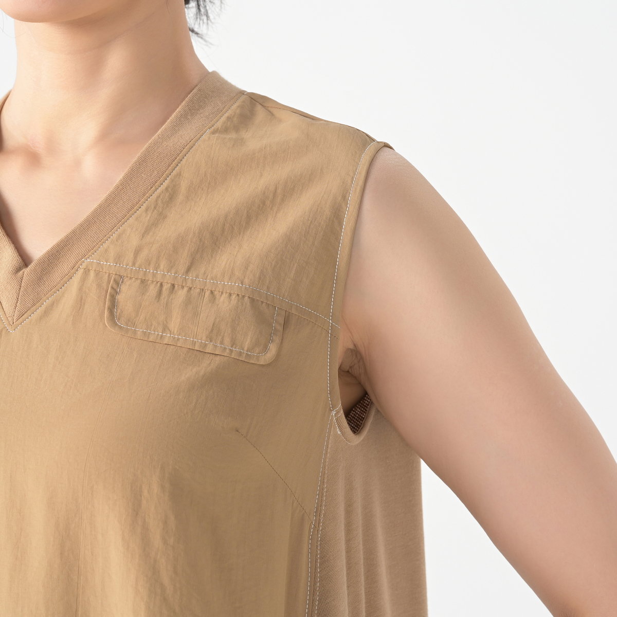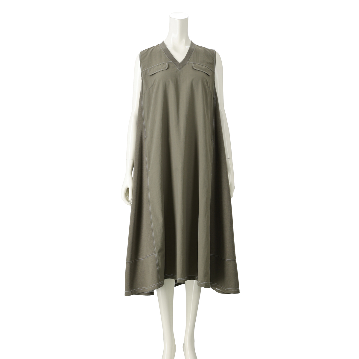 シャープなVネックが小顔効果を演出しながら、胸の切替にフェイクポケットを付けることでサファリ感覚の印象に。あえてホワイトにしたステッチが上品で、脇の切替線を前にずらすことで細見え効果を演出しています。後ろポケットにはブランドロゴを入れました