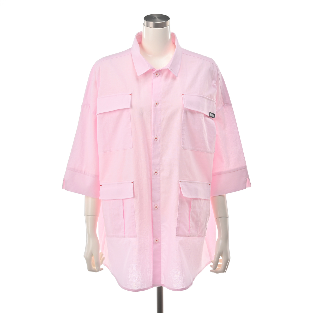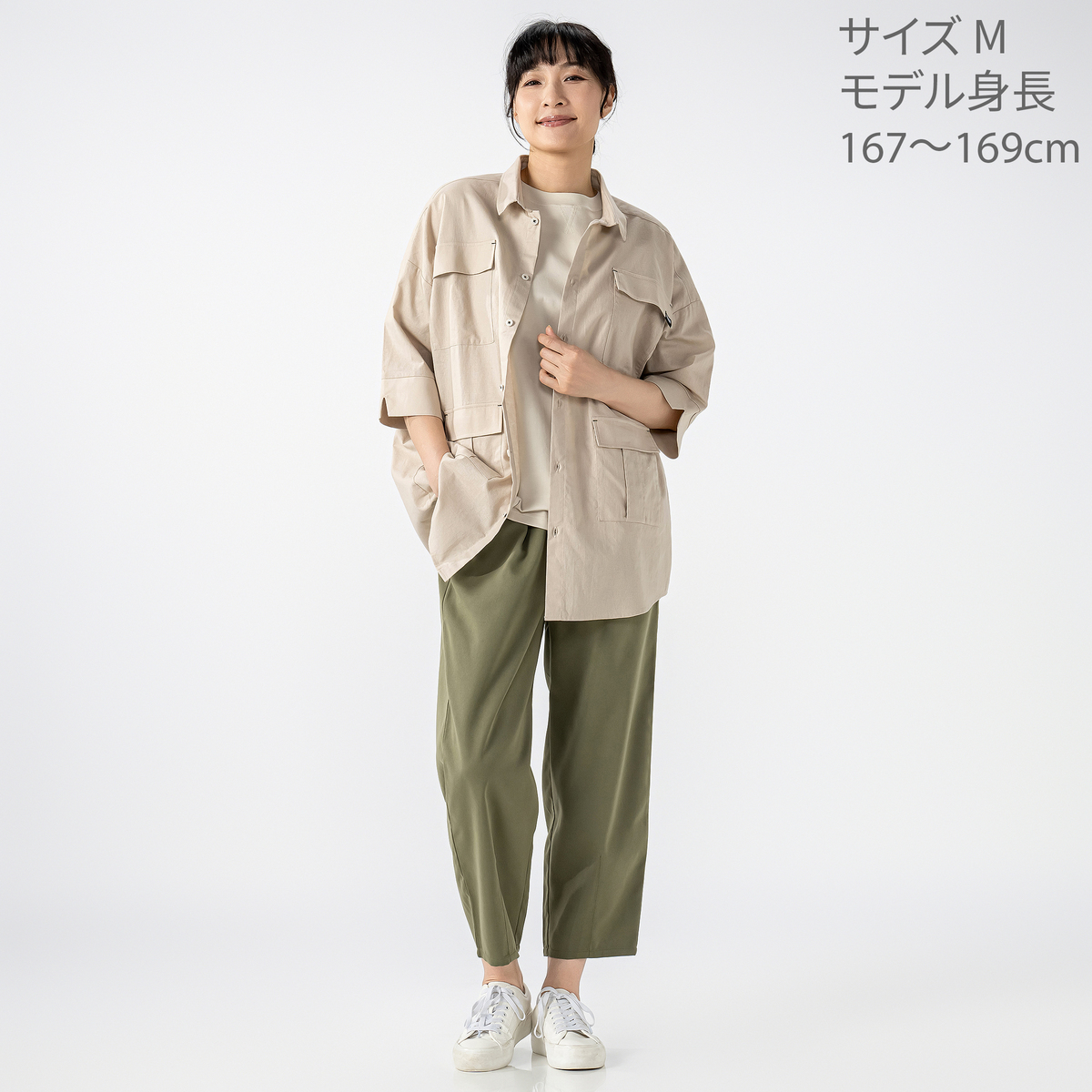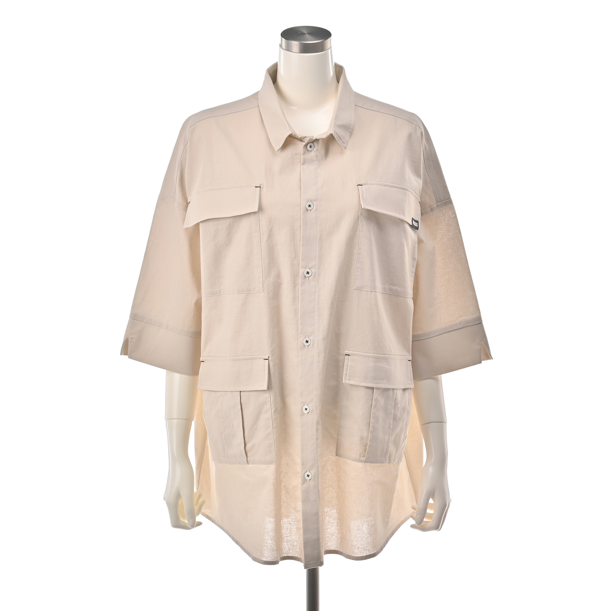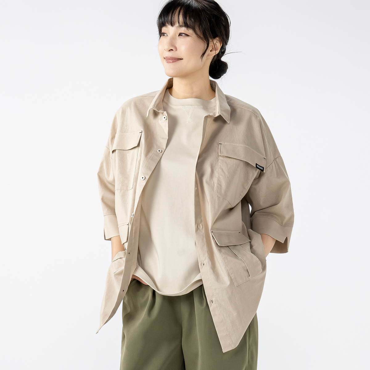 大きなポケットとビッグシルエットが魅力的なサファリ風シャツ。袖は6分丈でリラックス感があり、真夏には折り返して5分丈としても着用可能です。1枚で着ることも、羽織りとしても活躍します