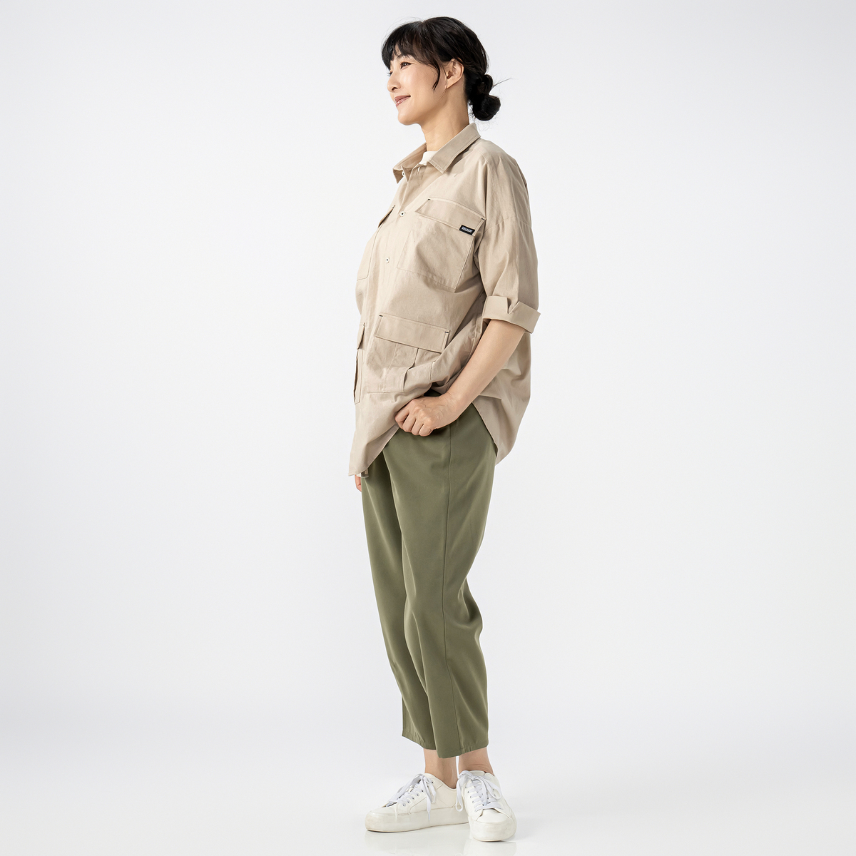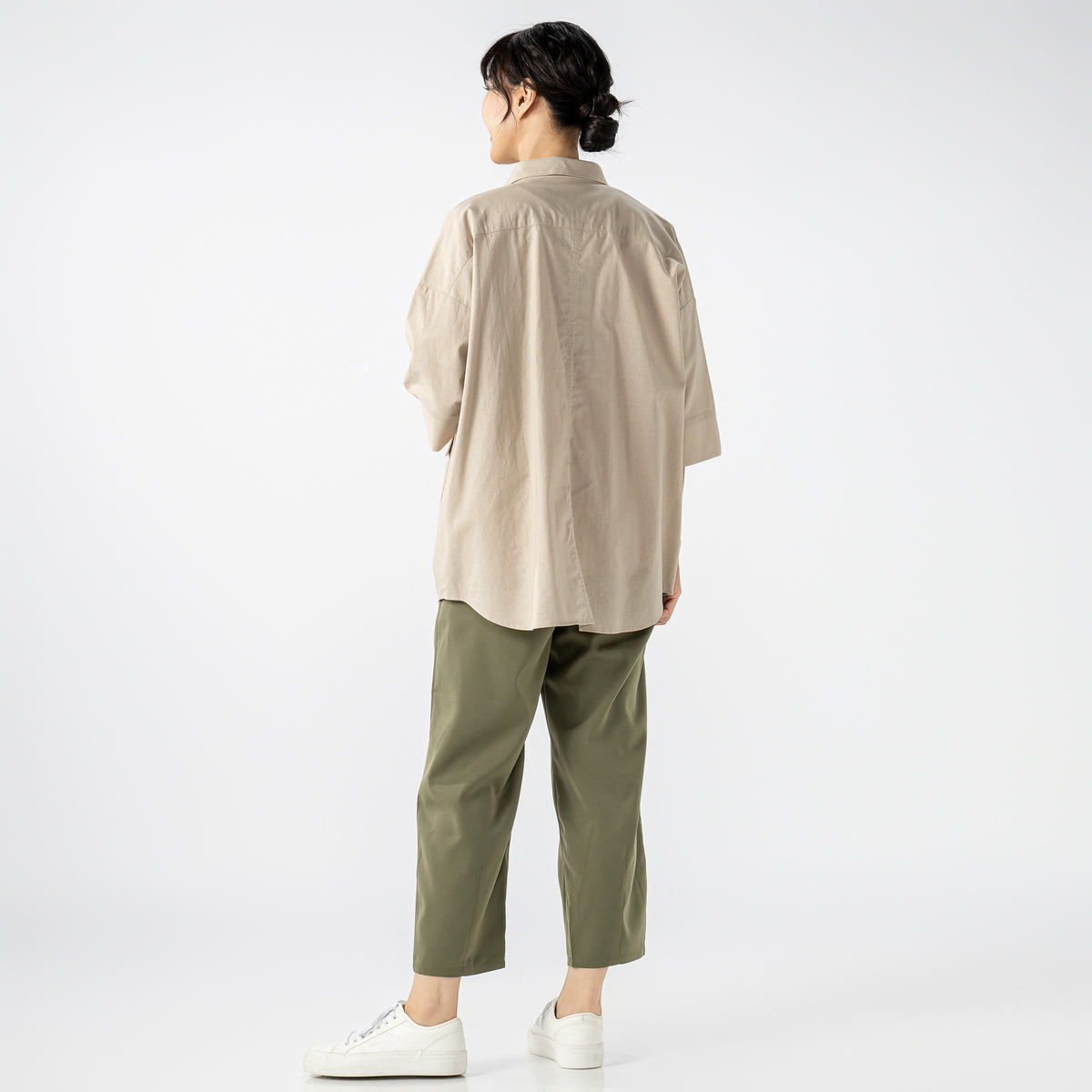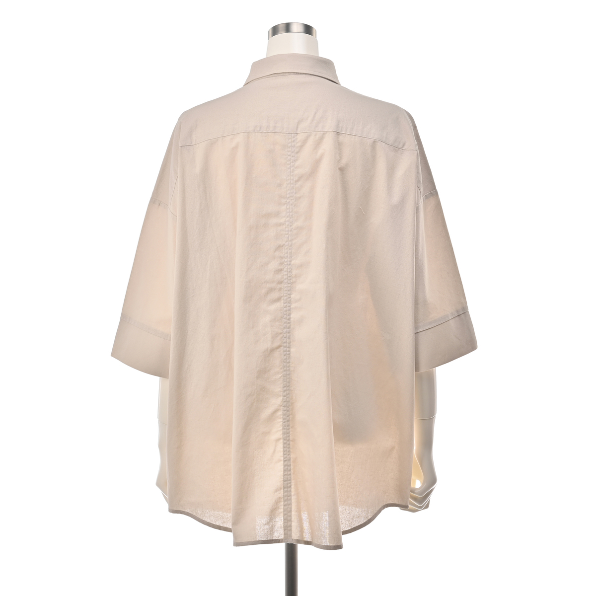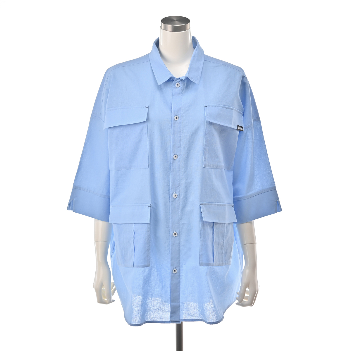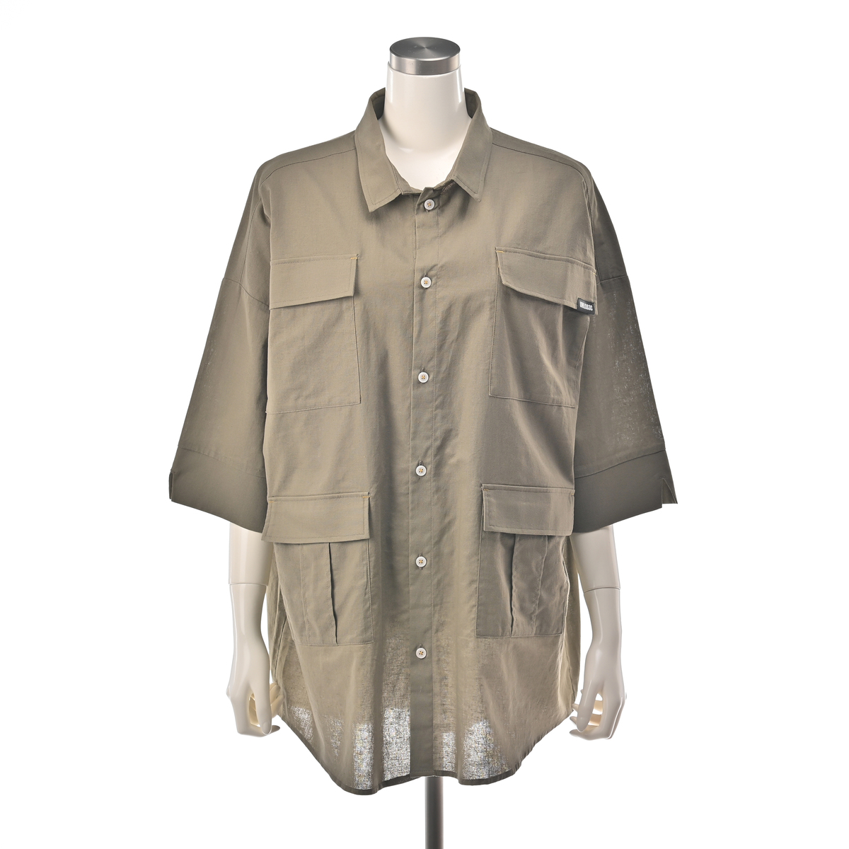 大きなポケットとビッグシルエットが魅力的なサファリ風シャツ。袖は6分丈でリラックス感があり、真夏には折り返して5分丈としても着用可能です。1枚で着ることも、羽織りとしても活躍します
