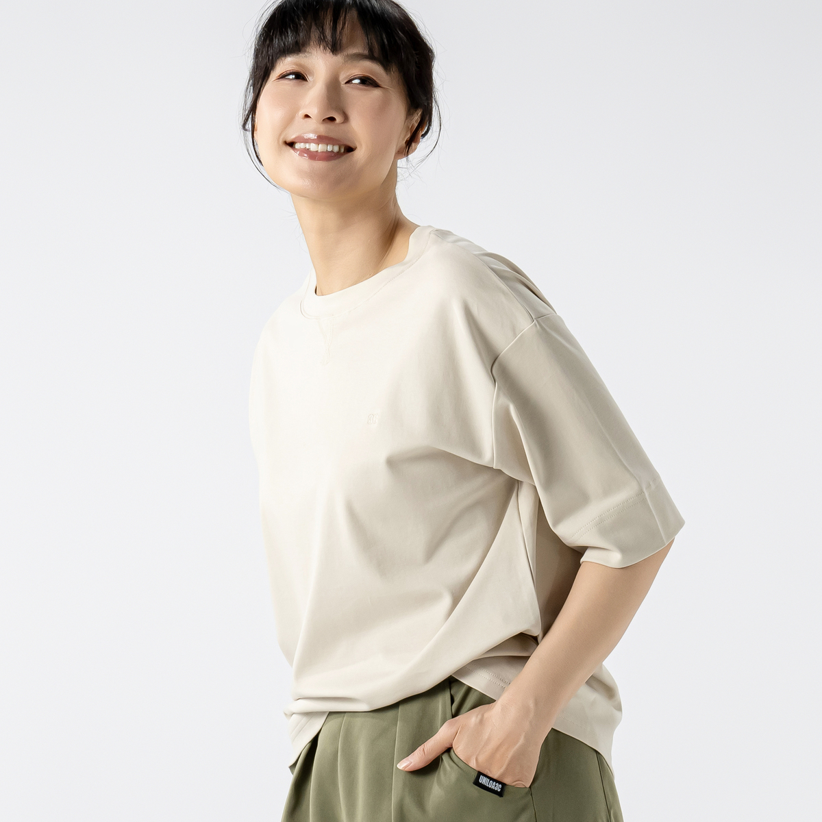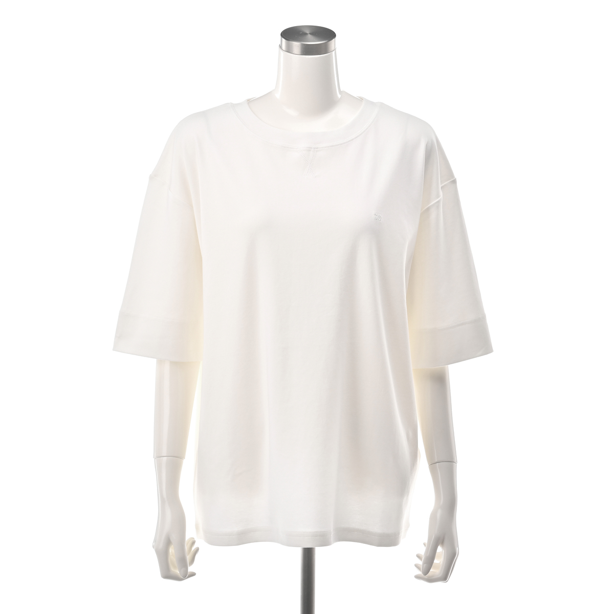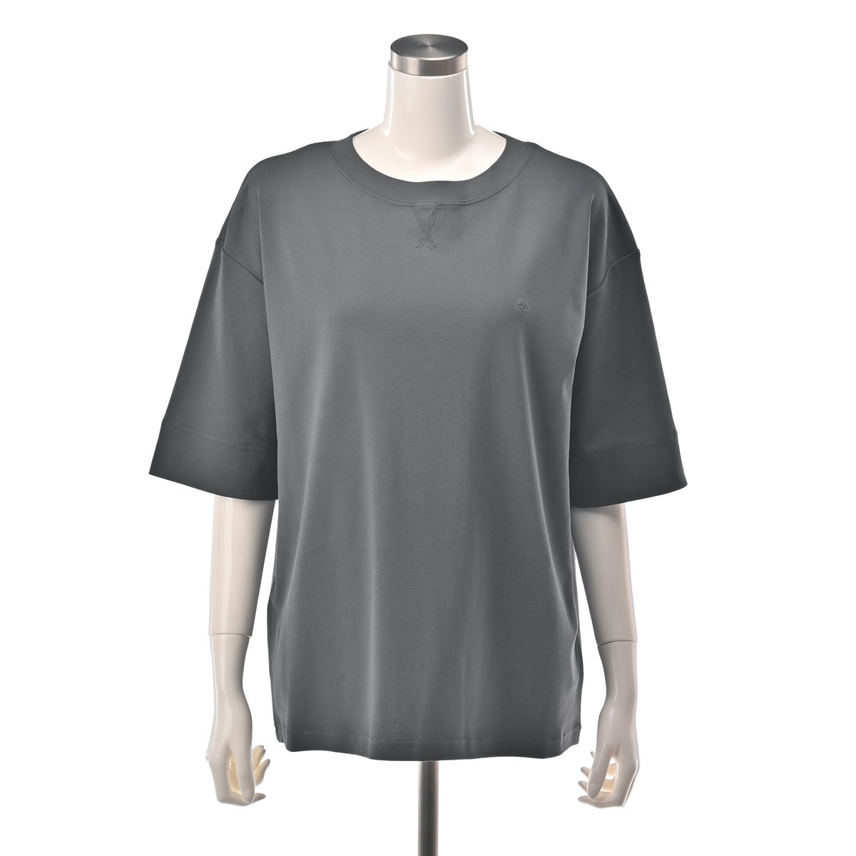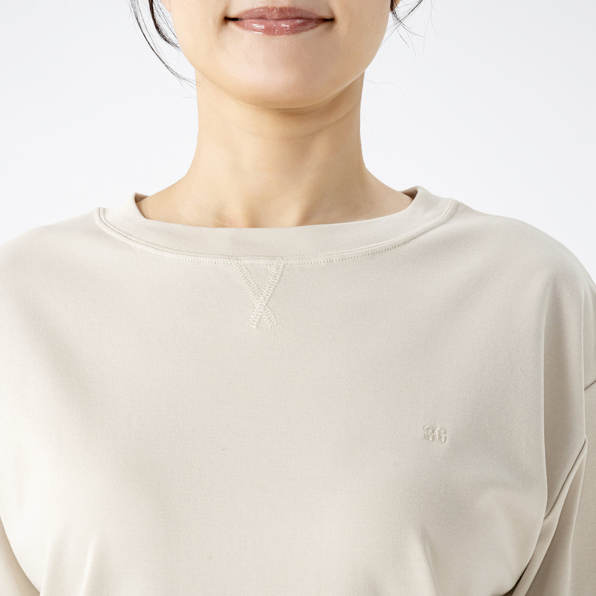 シルケット加工で綿特有の毛羽だちを抑えた、きれいな光沢感を持たせた素材。カジュアルさときれいめな素材のマッチングが大人っぽい、プチ贅沢なTシャツです。UVカット・接触冷感も。胸元の3C刺繍がさりげないアクセントになっています