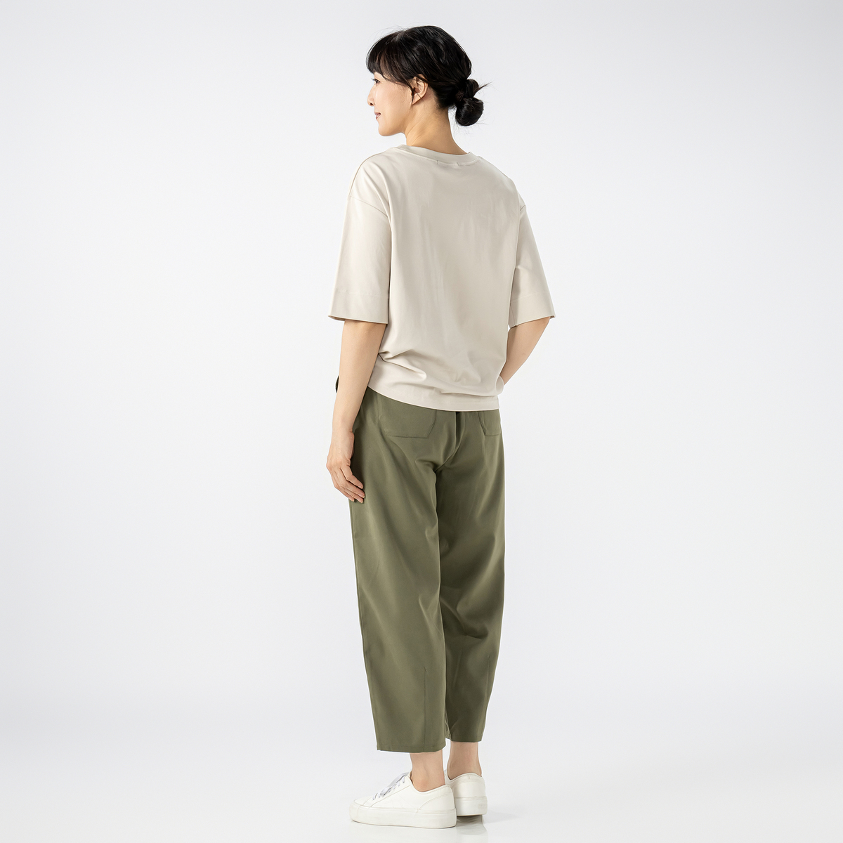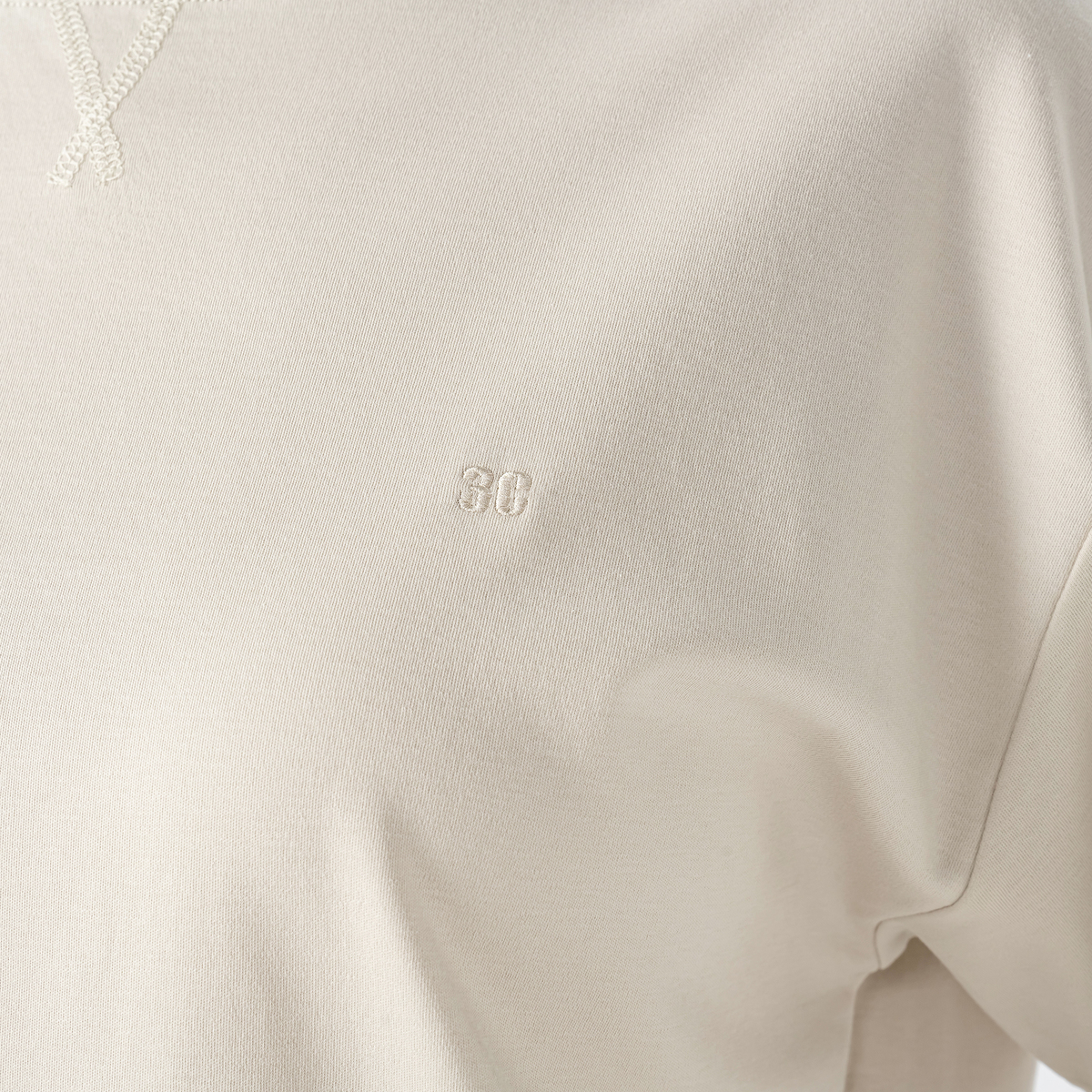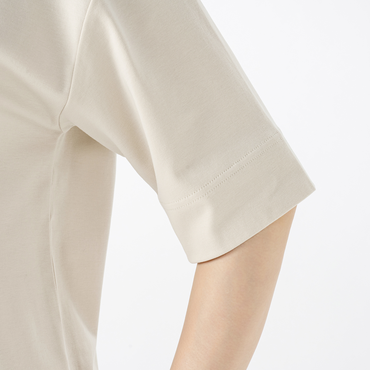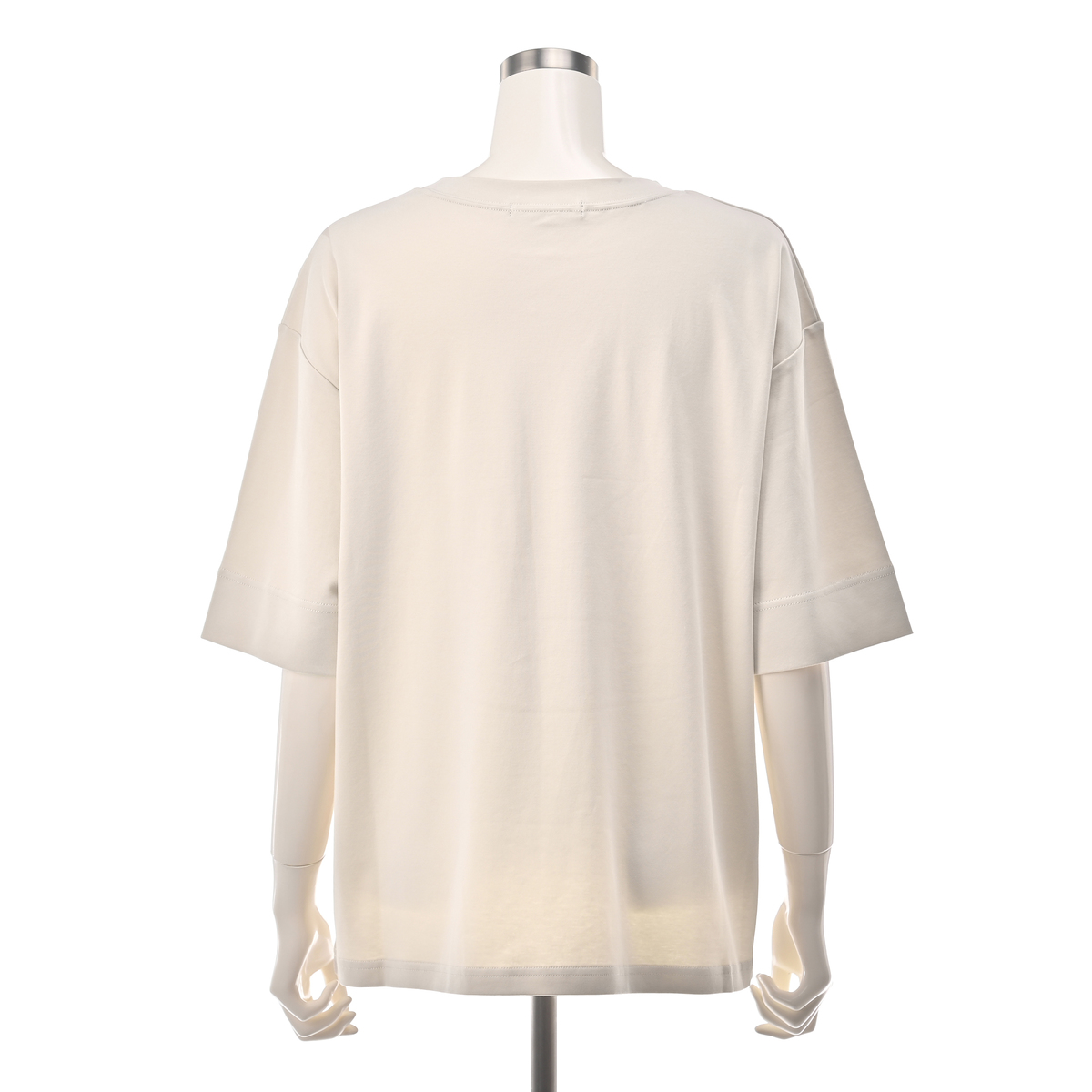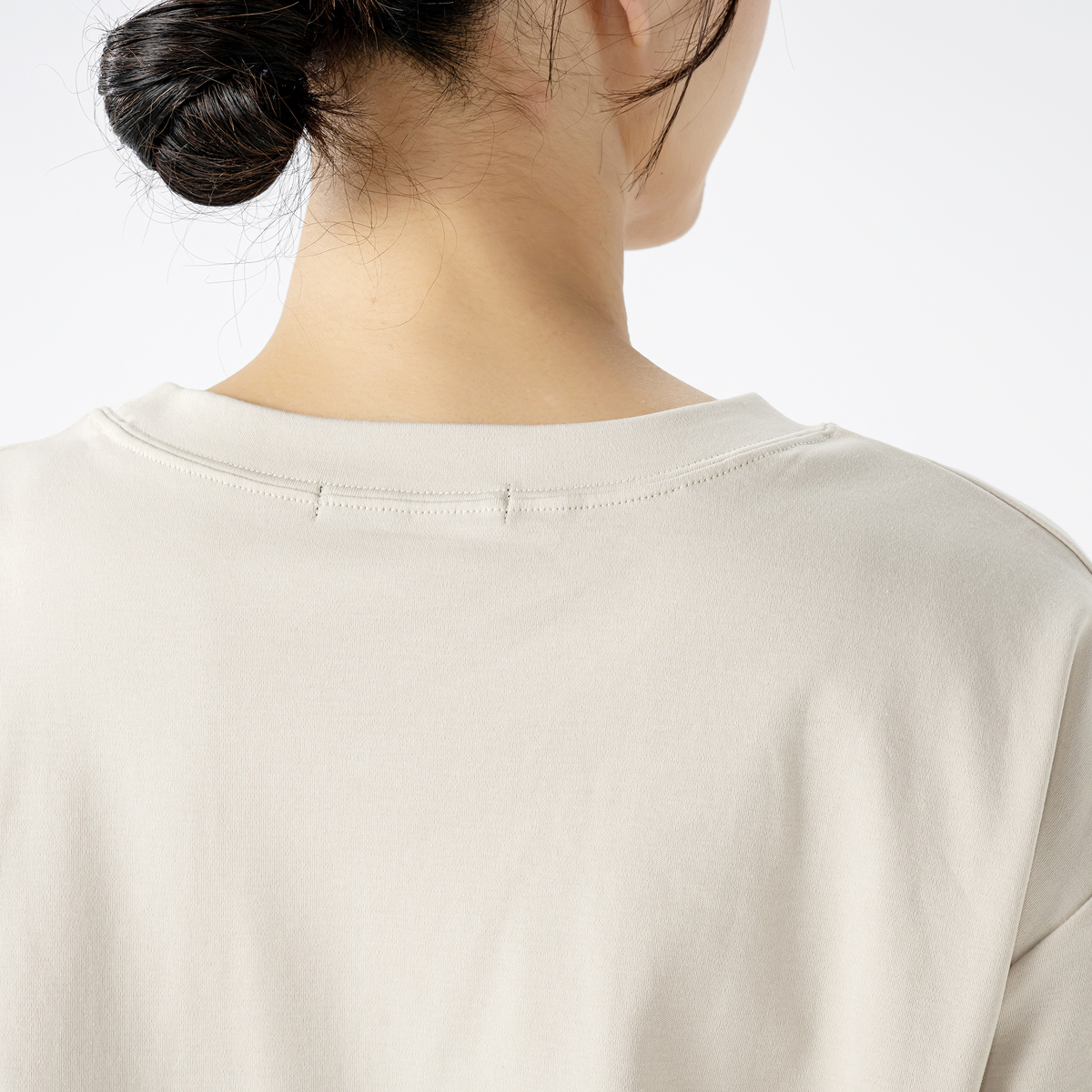 袖口の折り返しのステッチを太めにとることで、折り返した着こなしも。襟ぐりにはガゼット風にステッチを入れて、胸元のアクセントに。肩幅はドロップショルダーで、袖回りはゆったりと着用していただけます