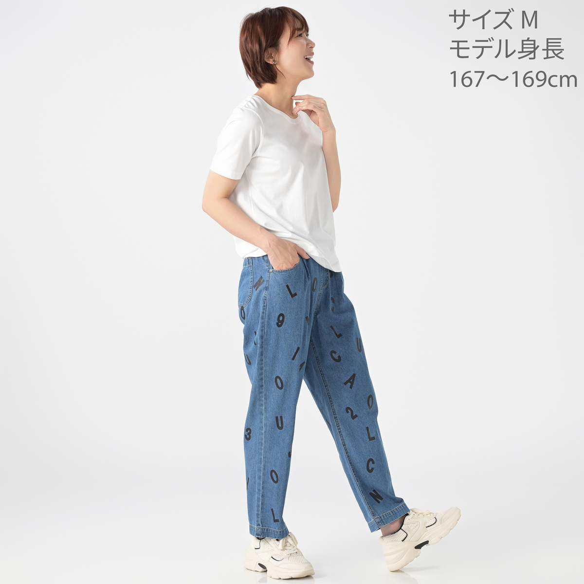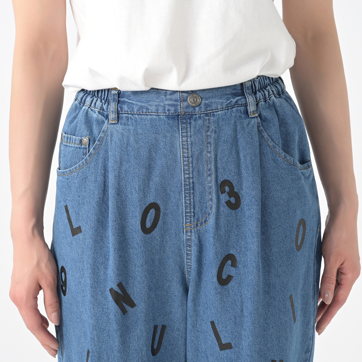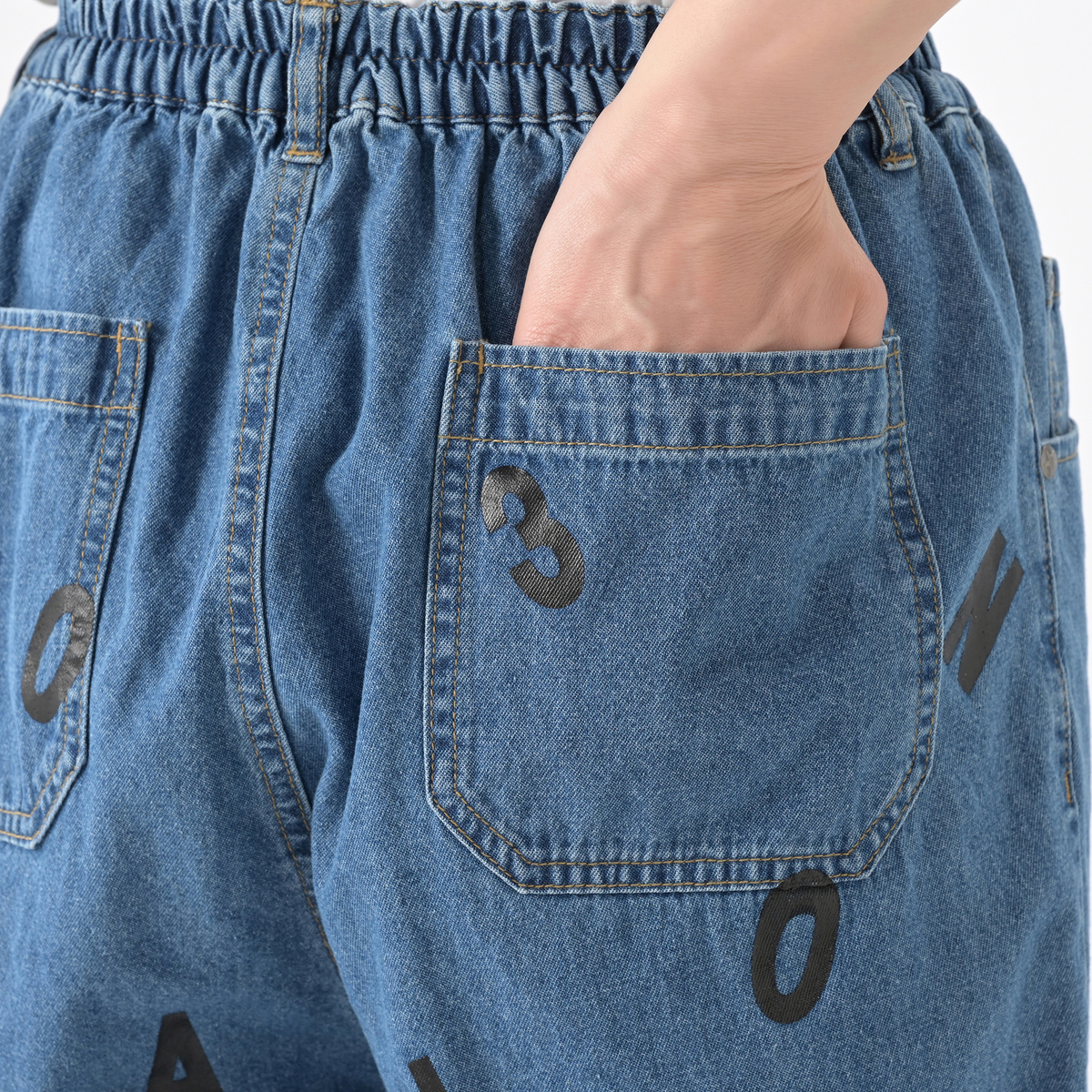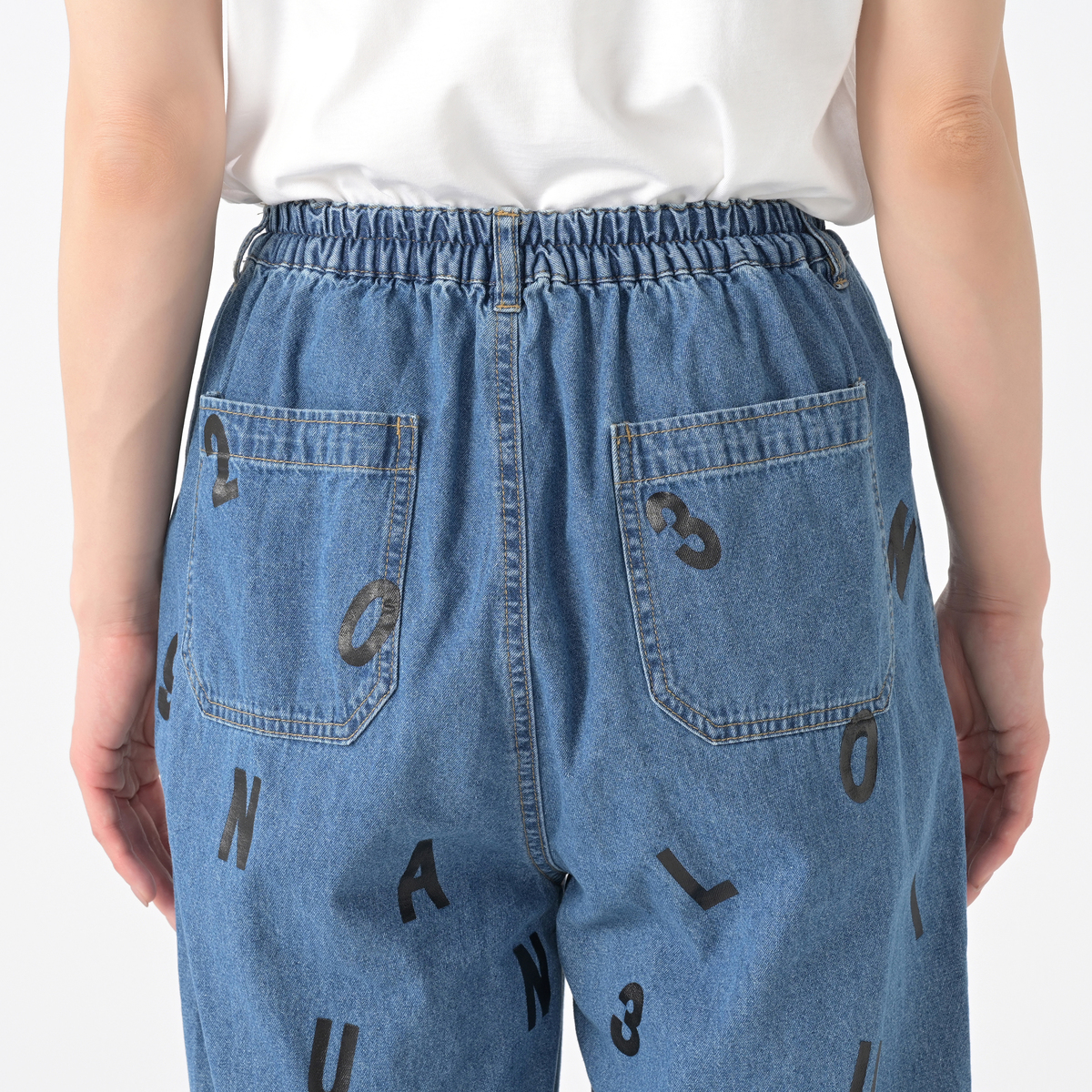 ロゴプリントが印象的なデニムパンツ。ポップなプリントが遊び心をプラスします。ウエストはゴムのプルオンタイプ。浅く入れたアウトタックでお腹まわりにゆとりを持たせ、ひざ下はストレートのゆったりシルエットにしています