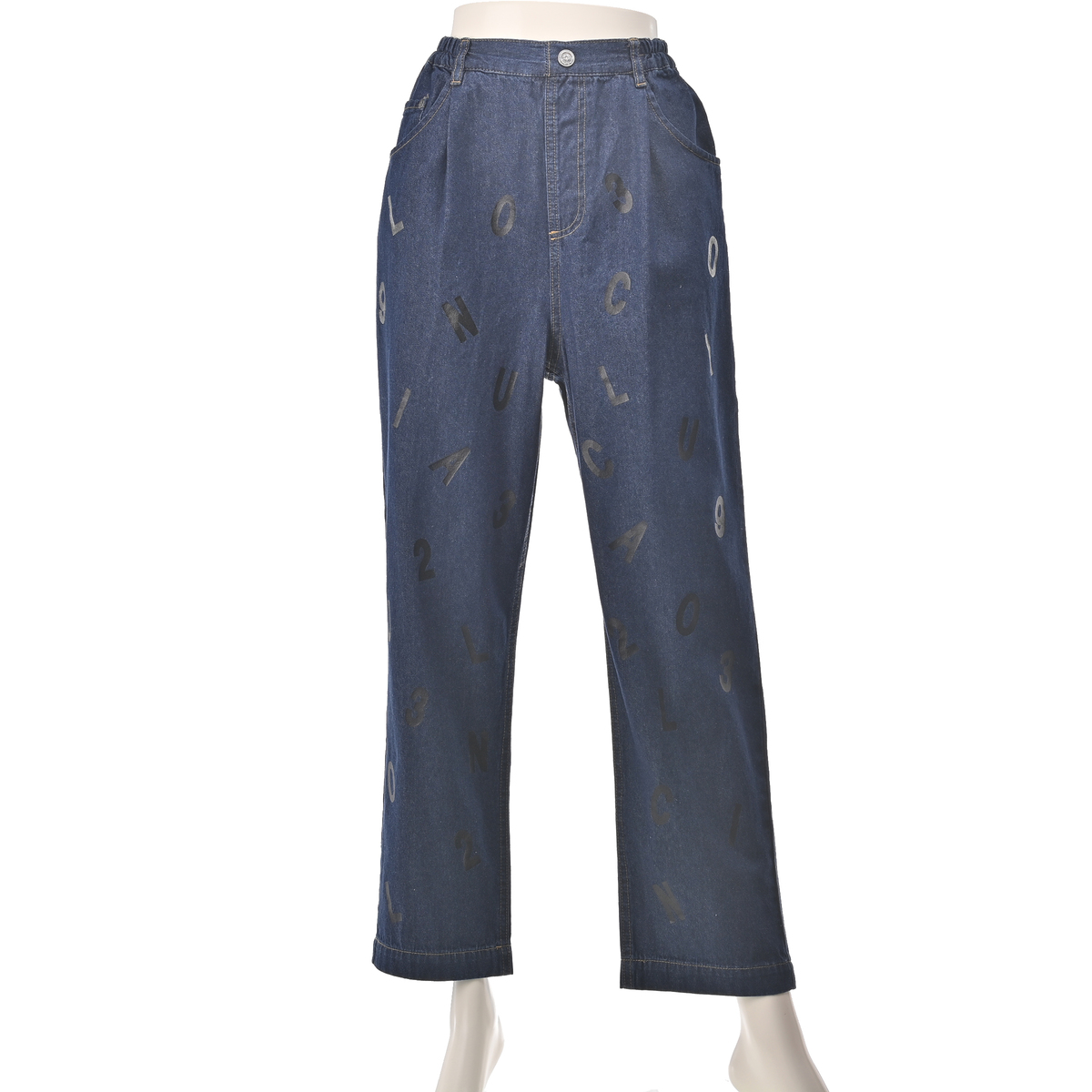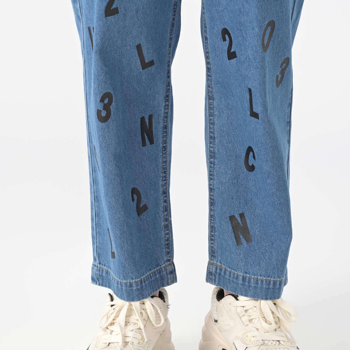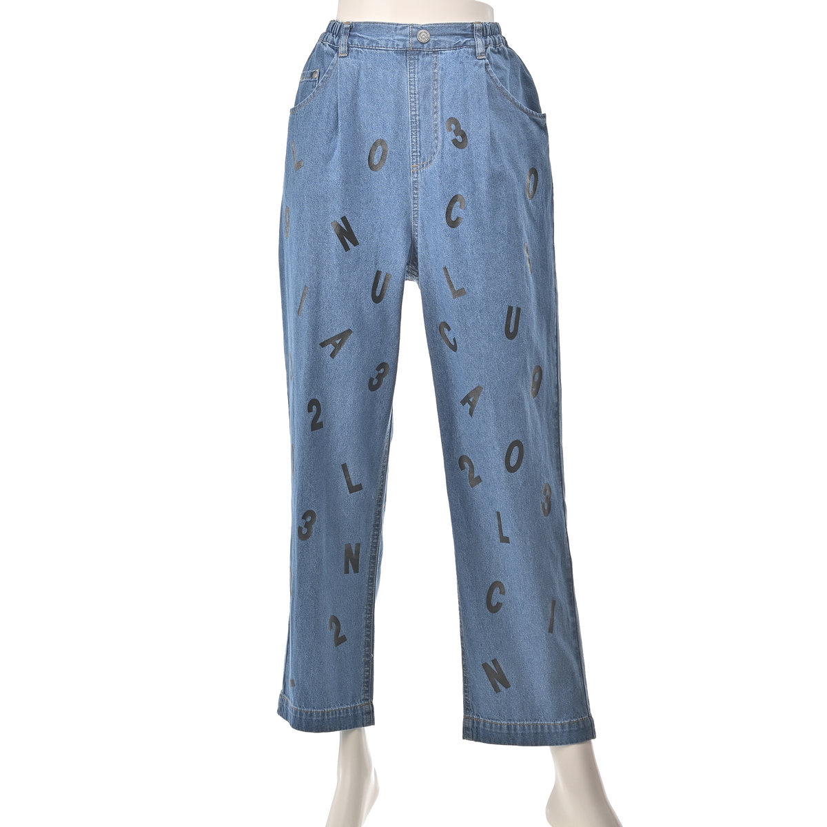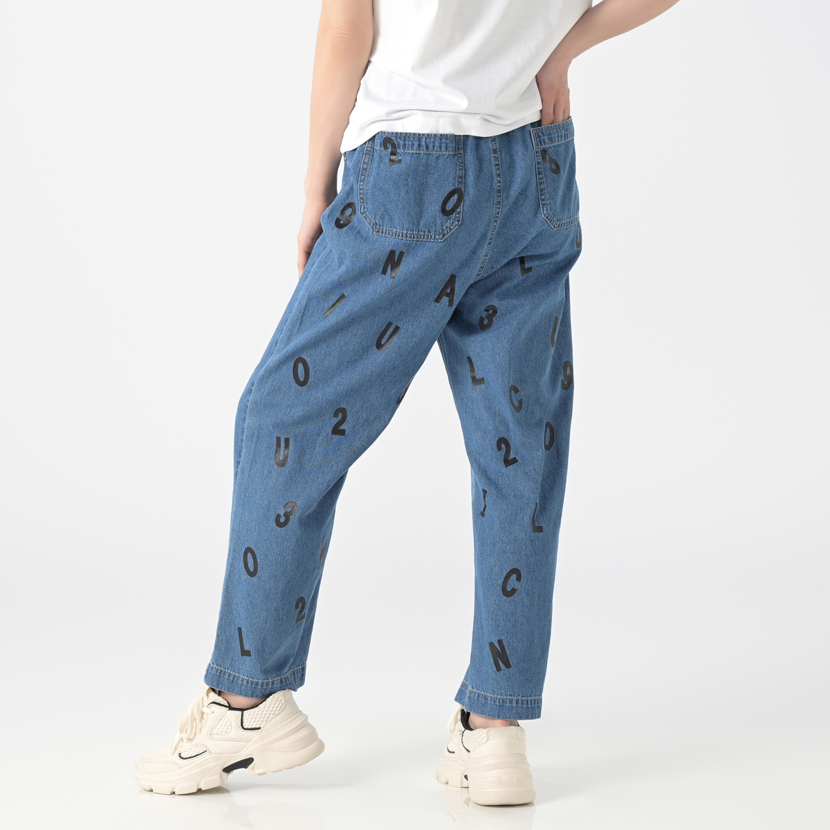 ロゴプリントが印象的なデニムパンツ。ポップなプリントが遊び心をプラスします。ウエストはゴムのプルオンタイプ。浅く入れたアウトタックでお腹まわりにゆとりを持たせ、ひざ下はストレートのゆったりシルエットにしています