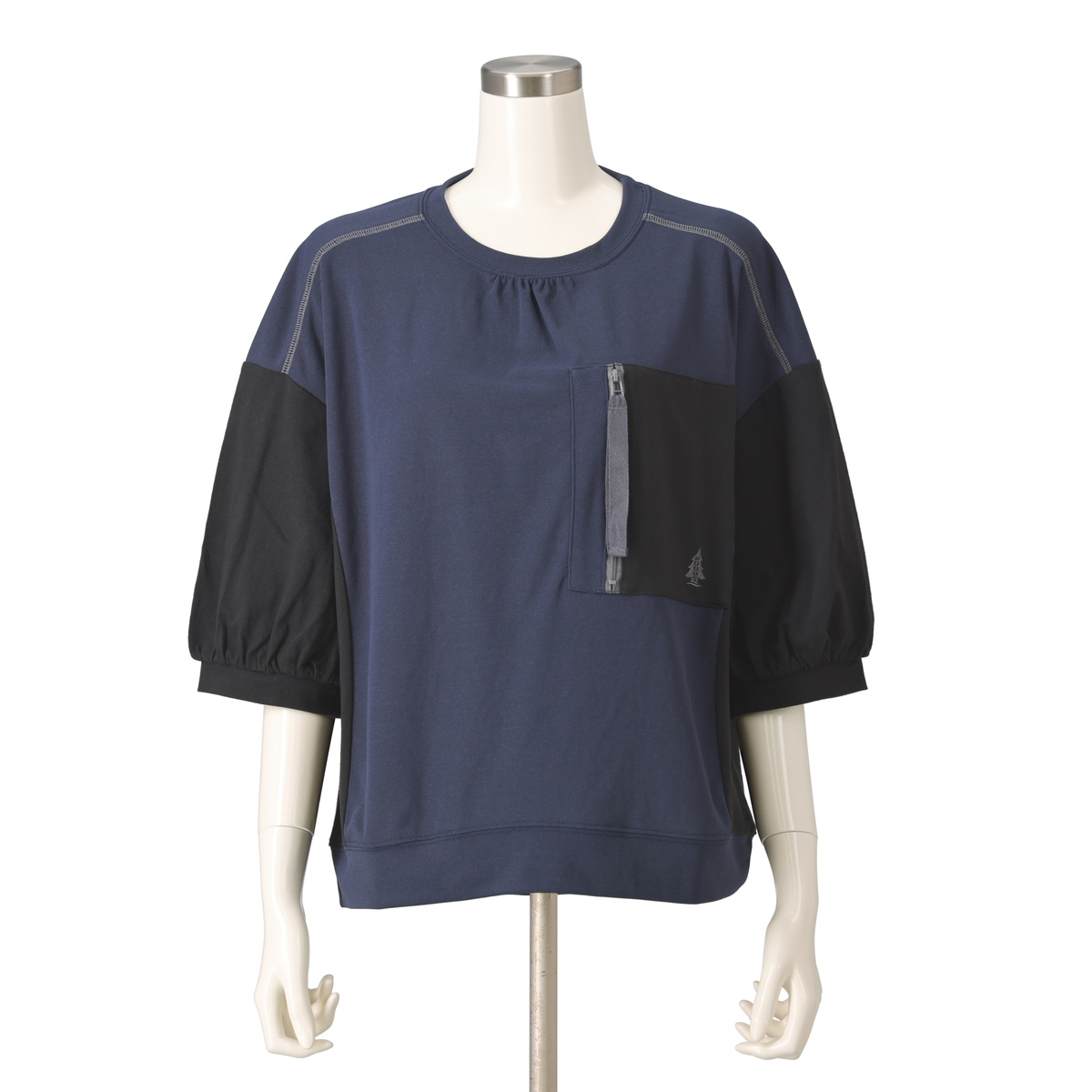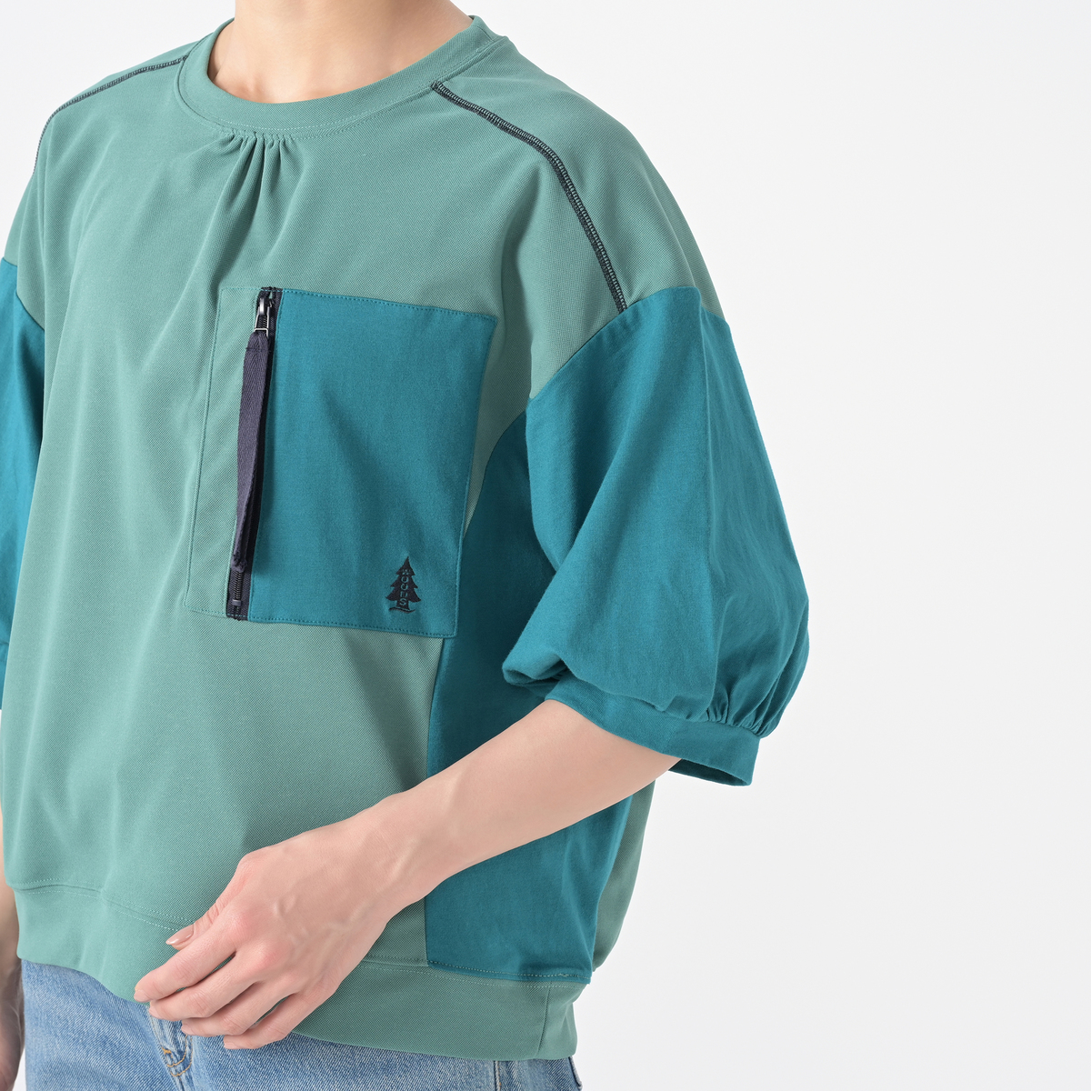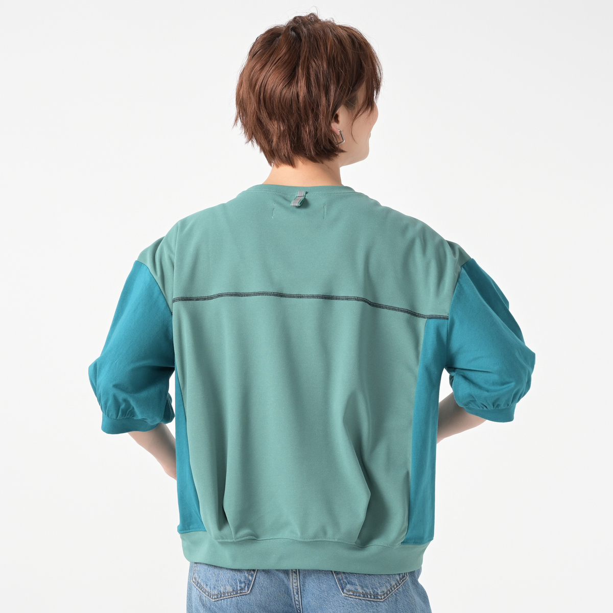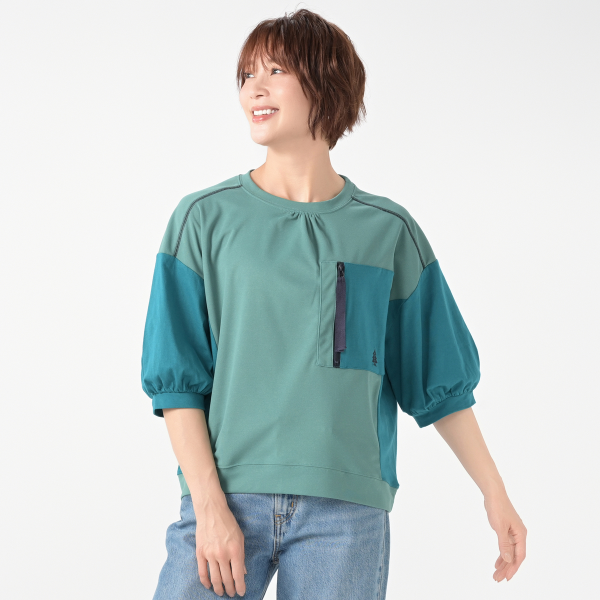 1枚でコーデが決まる、ツートンカラーのプルオーバー。二の腕や肘周りをカバーする5分丈袖で、季節の変わり目にも活躍します